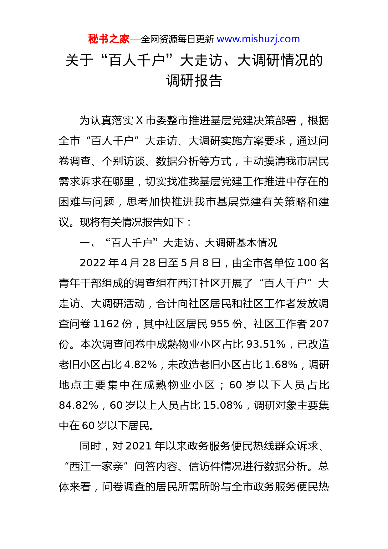 秘书之家—全网资源每日更新www.mishuzj.com关于“百人千户”大走访、大调研情况的调研报告为认真落实X市委整市推进基层党建决策部署,根据全市“百人千户”大走访、大调研实施方案要求,通过问卷调查、个别访谈、数据分析等方式,主动摸清我市居民需求诉求在哪里,切实找准我基层党建工作推进中存在的困难与问题,思考加快推进我市基层党建有关策略和建议。现将有关情况报告如下:一、“百人千户”大走访、大调研基本情况2022年4月28日至5月8日,由全市各单位100名青年干部组成的调查组在西江社区开展了“百人千户”大走访、大调研活动,合计向社区居民和社区工作者发放调查问卷1162份,其中社区居民955份、社区工作者207份。本次调查问卷中成熟物业小区占比93.51%,已改造老旧小区占比4.82%,未改造老旧小区占比1.68%,调研地点主要集中在成熟物业小区;60岁以下人员占比84.82%,60岁以上人员占比15.08%,调研对象主要集中在60岁以下居民。同时,对2021年以来政务服务便民热线群众诉求、“西江一家亲”问答内容、信访件情况进行数据分析。总体来看,问卷调查的居民所需所盼与全市政务服务便民热秘书之家—全网资源每日更新www.mishuzj.com线、“西江一家亲”互助问答、信访件高频诉求基本一致。(一)居民需求诉求表现在哪里?1.从居民最希望提供的特色服务方面看,本次问卷调查中排名前五的依次是健康讲座、法律维权宣传、业余兴趣交流、亲子教育、心理咨询,分别占比达41.05%、36.54%、32.36%、32.15%、16.75%。随着普法教育的不断深入,群众学法、守法、用法的积极性和主动性明显提高,超过1/3的群众希望提供法律维权宣传服务。社区独居老人、留守儿童、残障人士、特困家庭等特殊人群则渴望得到家政服务、康复训练等服务,分别达到42.62%和27.54%。2.从居民最期盼开展的集体活动方面看,本次问卷调查中排名前五的依次是健身竞技类、亲子互动类、文艺表演类、科普讲座类、社区居民聚会类,分别占比达44.08%、31.1%、28.06%、27.54%、19.69%,客观反映出目前可见文娱活动是目前居民最渴望开展的集体活动。3.从居民政务服务便民热线、“宜都一家亲”和信访件诉求方面看,“西江一家亲”互助问答内容中民生类问答最多,占33.8%,医疗、教育有关问题最为突出;信访件中城乡建设类占比最大,2020年至2021年共计1165秘书之家—全网资源每日更新www.mishuzj.com件,占24.87%,其中房屋拆迁与补偿、小区物业服务问题最为突出。4.从居民最需要提供的公共设施方面看,本次问卷调查中排名前五的依次是健身器材、停车场、充电桩、儿童游乐设施、社区卫生室,分别占比达32.15%、30.68%、27.75%、26.7%、22.72%,同时老年活动室、图书室等也有较大需求。随着近年来新能源车辆保有量不断增加,近1/3的群众希望增设充电桩,同时也有居民反映目前部分现有充电桩无法正常使用。5.从居民最希望社区协调解决的问题看,本次问卷调查中排名前三物业管理、环境卫生、小区安防,分别占比达49.53%、42.2%、35.92%。其中物业管理是居民最为关注、反映最多、最需解决的问题,部分居民认为所交物业费用与提供的服务不成正比、物业费用收支不够公开透明。6.从居民对网格员知晓率和满意度看,仅73.4%的居民对社区网格员熟悉,15.81%的居民对网格员工作评价一般、1.05%的居民认为网格员工作较差。当下,社区工作行政趋化严重、事务多头繁杂等问题依旧存在,网格员福利待遇偏低也影响了网格员的工作积极性,一定程度上造成了居民对网格员知晓率和满意度偏低。(二)居民需求诉求特点是什么?秘书之家—全网资源每日更新www.mishuzj.com1.总体符合当前发展阶段和实际情况。当前全市地区生产总值突破1100亿元,城乡居民人均可支配收入分别达到65911元、39095元。随着社会财富和人均收入的增加,人民群众不再简单满足于物质生活富裕,对精神生活富裕的新期待日益突出。2.具有典型的区域特征和群体特征。不同小区和不同类型人群需求迥异。老旧小区对改善环境卫生相对迫切,成熟物业小区对优化物业管理相对迫切。45岁以上人群对健康讲座类的需求更为迫切,达到49.86%;18-45岁人群对亲子教育类的需求更为迫切,达到58.04%;18岁以下人群对游戏娱乐类的需求更为迫切,达到43.75%。3.呈现动态变化并不断提升趋势。随着经济社会发展,群众需求诉求日益多元化、复杂化,期望值越来越高。小区停车难、充电难的问题日益突出,“停车难”“充电难”依旧是“老大难”。随着城市化进程加快,大量楼盘住宅小区快速建成投用,物业公司与小区业主矛盾突出、关系紧张,投诉较多、信访频发,从一定程度上反映出现有服务能力水平同群众期待的服务意识、服务水平、服务精准度上有明显差距。(三)居民需求诉求如何看待?群众的需求诉求就是我们的工作方向,但需要分清主次矛盾和轻重缓急,统筹推进基层党建与相关工作,分类秘书之家—全网资源每日更新www.mishuzj.com施策解决:一是通过场景建设和老旧小区改造可以解决的,比如停车位、电梯加装、小区卫生、小区安防、文体设施、社区卫生室等问题。二是通过社区小区对接相关资源可以解决的,比如健康讲座、法律维权宣传、心理咨询、情绪疏导、职业辅导、兴趣培养等问题。三是通过开展专项治理、建立机制可以解决的,比如小区物业、商铺占道经