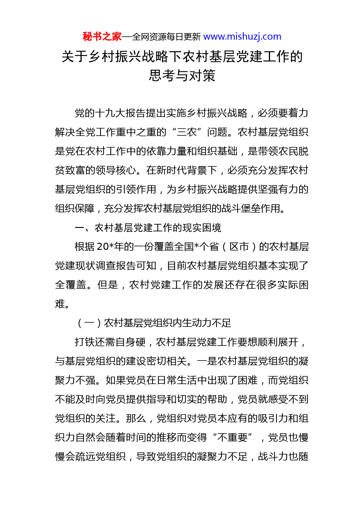 秘书之家—全网资源每日更新www.mishuzj.com关于乡村振兴战略下农村基层党建工作的思考与对策党的十九大报告提出实施乡村振兴战略,必须要着力解决全党工作重中之重的“三农”问题。农村基层党组织是党在农村工作中的依靠力量和组织基础,是带领农民脱贫致富的领导核心。在新时代背景下,必须充分发挥农村基层党组织的引领作用,为乡村振兴战略提供坚强有力的组织保障,充分发挥农村基层党组织的战斗堡垒作用。一、农村基层党建工作的现实困境根据20年的一份覆盖全国个省(区市)的农村基层党建现状调查报告可知,目前农村基层党组织基本实现了全覆盖。但是,农村党建工作的发展还存在很多实际困难。(一)农村基层党组织内生动力不足打铁还需自身硬,农村基层党建工作要想顺利展开,与基层党组织的建设密切相关。一是农村基层党组织的凝聚力不强。如果党员在日常生活中出现了困难,而党组织不能及时向党员提供指导和切实的帮助,党员就感受不到党组织的关注。那么,党组织对党员本应有的吸引力和组织力自然会随着时间的推移而变得“不重要”,党员也慢慢会疏远党组织,导致党组织的凝聚力不足,战斗力也随秘书之家—全网资源每日更新www.mishuzj.com之下降。继而“组织喊破嗓子,党员却无动于衷”时有发生。二是农村基层党组织在管理上缺乏活力。主要表现在:一些农村基层党员干部的文化程度偏低,党建工作方法比较传统陈旧,思想观念解放力度不够,导致党建工作的创新能力不足。在执行“三会一课”等制度方面,存在着轻内容重形式的问题,还停留在读读文件、看看报纸的表面上。党员教育活动不经常不规范,党组织对党员的教育内容与教育形式过于单一,与党员自身发展需要的多样化不相适应。三是农村基层党员的先锋模范作用不明显。首先是先进性不够。农村基层党员干部的思想和现有的工作方法很多都与时代脱节,有部分党员干部在触及到自身利益问题时不能自觉地代表党和人民的利益。其次是本领上发挥带头作用的程度不足。一些农民党员不愿意参加村级工作,不能率先参与组织生活,更不用说引导人们致富。(二)农村基层党组织建设队伍建设不力一是党建骨干人才匮乏。农村要想得到发展,要想实现全面振兴,必须牢牢抓住人才这个关键点。就全国而言,农村基层后备人才短缺是制约许多农村基层党组织发展的重要原因,这对农村基层党组织的健康发展非常不利。年轻人培养不上来,年老的精力不济,人才梯队常现“断层”的现象,很多农村基层党组织在搞党建方面后继秘书之家—全网资源每日更新www.mishuzj.com无人。二是农村党员队伍结构不合理。农村中有一定知识文化和技能的中青年农民主动或被动地选择离开农村在外谋生,而从农村走出去的大学生大多数也选择留在城市生活,导致农村的党员结构严重老化。三是农村发展党员难。尤其是在一些经济欠发达和偏远的农村地区,年轻人少,培养机制跟不上,很容易将一些党性并不强的“投机分子”发展成新党员。难以培养新的青年党员,已经成为制约农村基层党建工作发展迫切需要解决的问题。(三)农村基层党组织建设保障不足农村基层党组织的作用发挥离不开强大物质基础的支持。保障不足主要表现在:一是农村基层党组织活动经费不足。村级组织自身经济实力有限,财政收入的来源较少,难以提供充足的活动经费。另外,上层党组织拨给农村基层党组织的资金不足以适应当前新形势下农村党建活动的需要。二是,基层党组织工作力度不够。经费的紧张导致了基层党组织建设和党员教育管理工作经费投入不足,基层党员干部待遇普遍偏低,留住优秀党务人员难度较大。三是缺乏开展党建活动的基础设施。与城市的社区党建相比,农村基层党建工作仍存在较大差距。有的偏远农村地区连基本的党建工作办公设施都无法满足,组织生活更难以展开。在农村基层组织建设方面的资金投入较少,缺乏专项业务经费,远远满足不了当下农村党建发展秘书之家—全网资源每日更新www.mishuzj.com的现实需求。二、农村基层党建工作的制约因素农村基层党建工作出现上述问题的因素很多,主要集中表现在:(一)思想上不够重视农村跟城市相比无论是经济上还是社会建设等方面都存在很大的差距,导致农村的个别领导干部特别重视农村经济的发展,存在着轻党建重经济发展的倾向,因此对党建工作的重视程度还不够。思想上不重视,自然行动中更不会在意。村党支部书记没有深刻认识到党组织活动开展的重要性和必要性,领导班子发挥作用不够,没有按照组织规定的要求,严格执行“三会一课”制度,导致许多农村党员对党建工作和党组织的态度也是可有可无。(二)管理上不够严格随着农村改革的不断深入,农民对基层党组织的依赖逐渐减弱。在农民党员的日常管理方面,存在着宽松软的现象,党员管理比较松散。比如:在农村“流动党员”管理中,没有及时跟踪这些党员的去处,组织生活难以正常进行。对不能按时缴纳党费,不参加组织生活的党员没有进行下一步处理,导致党员的责任感、归属感降低。在党员的日常教育管理方面内容单调,活动形式不够丰富,主要以开会、远程视频学习为主,影响了党员参与的积极秘书之家—全网资源每日更新www.mishuzj.com性。(三)服务上不够完善随