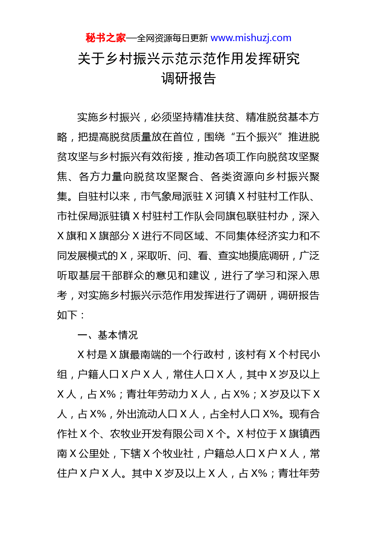 秘书之家—全网资源每日更新www.mishuzj.com关于乡村振兴示范示范作用发挥研究调研报告实施乡村振兴,必须坚持精准扶贫、精准脱贫基本方略,把提高脱贫质量放在首位,围绕“五个振兴”推进脱贫攻坚与乡村振兴有效衔接,推动各项工作向脱贫攻坚聚焦、各方力量向脱贫攻坚聚合、各类资源向乡村振兴聚集。自驻村以来,市气象局派驻X河镇X村驻村工作队、市社保局派驻镇X村驻村工作队会同旗包联驻村办,深入X旗和X旗部分X进行不同区域、不同集体经济实力和不同发展模式的X,采取听、问、看、查实地摸底调研,广泛听取基层干部群众的意见和建议,进行了学习和深入思考,对实施乡村振兴示范作用发挥进行了调研,调研报告如下:一、基本情况X村是X旗最南端的一个行政村,该村有X个村民小组,户籍人口X户X人,常住人口X人,其中X岁及以上X人,占X%;青壮年劳动力X人,占X%;X岁及以下X人,占X%,外出流动人口X人,占全村人口X%。现有合作社X个、农牧业开发有限公司X个。X村位于X旗镇西南X公里处,下辖X个牧业社,户籍总人口X户X人,常住户X户X人。其中X岁及以上X人,占X%;青壮年劳秘书之家—全网资源每日更新www.mishuzj.com动力X人,占X%;X岁及以下X人,占X%。两个村的主导产业是以种养殖业为主。二、发展现状乡村振兴产业发展是基层党组织的重要物质基础,是党组织有效发挥职能作用的前提和保障。从调研情况来看,X旗广大干部群众积极探索发展路子,推陈出新,X党组织正常运转,夯实党在农村的执政基础。随着改革的深入推进,针对发展壮大村级集体经济出台了一系列政策文件,但在农村发展过程中,一些X集体经济收入还比较薄弱,严重制约了农村经济社会事业发展,针对这些问题,也采取一些措施,目前取得了明显进展,后续从政策引导、产业培育等方面进一步强化措施,实现稳定增长。比如:X村X年开始进行产业结构调整,紧紧围绕X旗“党建引领,绿色崛起”的发展思路,充分发挥党支部+企业+合作社的作用,建成各类大棚X多栋,占地X亩的X栋现代化育苗中心,年育苗能力X万株,现代化设施农业不断发展壮大。X村现种植瓜果蔬菜X亩,为X河流域产业结构调整提供条件。X年建成专家工作站和X旗新型农牧民职业培训学校,聘请农牧业专家X人,年培训人次达X人次,为X旗农牧民提升职业技能发挥了重要作用。X年由于猪、牛、羊肉价格较高,X村养殖大户有X户毛收入过X万元,全村人均收入超过X万元,成为远近闻名的富裕秘书之家—全网资源每日更新www.mishuzj.com村,产业发展模式起到了很好的示范带动作用。三、存在的问题(一)村级集体经济经营性收入相对薄弱。部分X传统产业是以种养殖业为主,辅助产业为特色养殖、特色种植及乡村旅游。一是种养殖业未形成规模和品牌效应,一二三产业融合度不高,自身“造血”功能不足,大部分X以种植玉米和养殖牲畜为主,由于土地有限,每户种植玉米面积已达到极限值,按照目前现状村民在种养殖上增收很难有新的突破,收入值近年来趋于水平波动,产业发展增长放缓,玉米种植技术及适合本地发展的产业没有形成新的明确方向。二是在调整产业优化结构上,思考少,探索实践不够,农牧民增收渠道狭窄,全村经济发展稳步不前,专业人才匮乏,村民在规模化养殖上,缺少示范带动和引领作用,村级干部中真正懂产业、懂技术、懂经营的人少,能够担负起产业发展重任的人不多。三是旅游资源与乡土资源、文化资源关联度有待提升,对水库、稻田景观园等资源优势尚未凸显,旅游品牌辨识度不够强,X文化与农耕文化结合得不够好,吸引游客的黏性不强,回头客少。四是基础设施不完善,没有“梧桐树”招不来“金凤凰”。农村电商平台发展缓慢,现有的优质农畜产品还处在低端的销售模式,产品附加值不高。(二)X集体收入来源渠道单一,扶持难度大。一是无秘书之家—全网资源每日更新www.mishuzj.com集体经营性收益的X,固定收入还不够牢固,特别是近年来,长庆石油勘探开采少,部分村庄交通不便,仅靠财政拨付的村级集体经济发展资金额度有限,要形成持续长效的增长机制难度很大。二是全旗X党员年龄偏大,影响X集体组织的决策能力,多数只顾眼前利益,缺乏长远考虑。(三)村级集体经济增收难度加大,发展后劲不足。一是区域位置好有资源的X,依靠工业园区,通过承包经营、租赁经营、股份制合作等办法,多渠道获得稳定的收入来源,而靠自然资源开发的X,集体经济收入相对滞后。二是随着国家对自然生态环境保护力度的不断加大,一些X不在发展的范围内,收入来源渠道单一,增收后劲不足。三是部分X发展集体经济起步难,一些集体经济薄弱X创办集体经济项目门槛高,与先进X产业发展上有一定的差距。四、发展原因分析(一)发展环境的差异是制约X集体经济发展的客观原因。一是从调研情况来看,临近城镇、近郊的X,得益于优越区域位置、便利的交通条件、丰富的信息资源和较为先进的生产经营理念,村集体经济较为强壮,一、二、三产业健康发展,特别是二、三产业发展较好。二是位于偏远的部分X地处偏僻,住址分散,交通不便,信息闭塞,X秘书之家—全网资源每日更新www.mishuzj.com集体经济相对比较薄弱。(二)部分村干部群众盲目的攀比心理,阻碍了村级集体经济的发展步伐。一是从全旗的部分X和外出考察调研情况来看,农牧民群众对村级组织的要求以及对改善生产