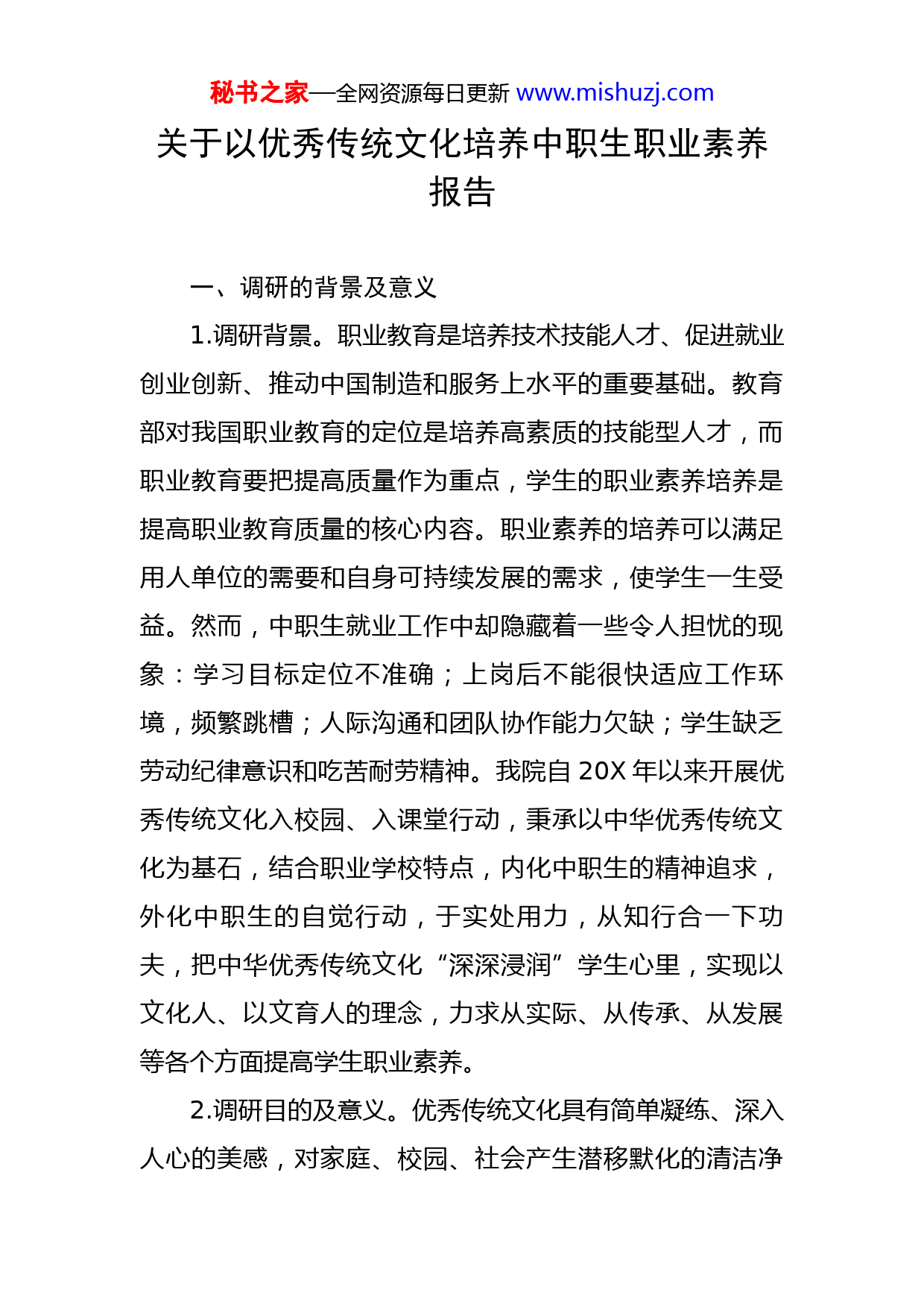 秘书之家—全网资源每日更新www.mishuzj.com关于以优秀传统文化培养中职生职业素养报告一、调研的背景及意义1.调研背景。职业教育是培养技术技能人才、促进就业创业创新、推动中国制造和服务上水平的重要基础。教育部对我国职业教育的定位是培养高素质的技能型人才,而职业教育要把提高质量作为重点,学生的职业素养培养是提高职业教育质量的核心内容。职业素养的培养可以满足用人单位的需要和自身可持续发展的需求,使学生一生受益。然而,中职生就业工作中却隐藏着一些令人担忧的现象:学习目标定位不准确;上岗后不能很快适应工作环境,频繁跳槽;人际沟通和团队协作能力欠缺;学生缺乏劳动纪律意识和吃苦耐劳精神。我院自20X年以来开展优秀传统文化入校园、入课堂行动,秉承以中华优秀传统文化为基石,结合职业学校特点,内化中职生的精神追求,外化中职生的自觉行动,于实处用力,从知行合一下功夫,把中华优秀传统文化“深深浸润”学生心里,实现以文化人、以文育人的理念,力求从实际、从传承、从发展等各个方面提高学生职业素养。2.调研目的及意义。优秀传统文化具有简单凝练、深入人心的美感,对家庭、校园、社会产生潜移默化的清洁净秘书之家—全网资源每日更新www.mishuzj.com化作用,可以在潜移默化中完成对人的塑造。优秀传统文化、前人的智慧在学生职业素养的培养中起到重要的作用,本文希望通过调研,探究出以优秀传统文化培养中职生职业素养的有效途径。二、调研对象与内容1.调研对象。调查对象。本调查研究的对象主要是我院顶岗、跟岗实习企业管理人士;省内外教育培训中心、教育咨询机构管理人员和培训教师;省内三家技师学院班主任以及我院试点班家长、学生,世界技能竞赛专家团队等,主要调查了企业的管理人员X人,院校班主任X人,学生家长X人,我院顶岗、跟岗实习学生和在校学生X人,世赛选手、教练、领队X人。2.调研方法及内容。(1)访谈法。调研组选择了X集团有限公司X迎宾馆、X有限公司、X国学启蒙中心、X教育科技有限公司四家企业、行业单位进行访谈,了解不同行业、不同性质的企业管理人士对学校培养中职生行为习惯的看法,并探讨进一步深化校企合作培养学生行为习惯的可行性,共同学习探索中职生行为习惯养成的培育方法。(2)问卷调查法。问卷1:中职生行为习惯调查问卷;问卷2:课堂行为规范养成教育调查问卷;问卷3:《综合素养》课堂教学效果调查问卷;问卷4:海南迎宾馆秘书之家—全网资源每日更新www.mishuzj.com15届订单班顶岗实习情况调查问卷(企业篇、学生篇);问卷5:跟岗实习行为习惯养成调查表(企业篇、学生篇)。三、调研分析1.从行为习惯养成方面分析。(1)职业学校的班主任普遍认为学生行为习惯养成需要正确引导,具体表现为:学生自律性差,不懂感恩,不服从管理,同学关系不和谐,言语不当等。(2)针对学生存在的问题X%以上的班主任认为在课堂教学管理中可以从教室、实训场地的物品摆放,学生与教师的言语应对,学生仪容仪表习惯、良好的学习习惯,班级风气等方面加强养成教育。在同学关系及早恋问题的教育上应该开展交友礼仪专题讲座,引导帮助学生建立正确的交友择偶观。(3)大部分学生能意识到要遵守课堂行为规范,但是在行动上做得还不够,X.X%的学生没办法做到每次课前要准备好学习用品整齐摆放,X.X%的学生上课的坐姿很随意,X.X%的学生上课会开小差。2.从课程教学效果学生方面分析。(1)X%以上的学生认为传统文化课程对个人行为习惯有改善的方面有:基本能按学校的规定作息;着装更注重干净整洁;会整理自己的衣服;在家起床会叠被子;课秘书之家—全网资源每日更新www.mishuzj.com桌抽屉的书籍和学习用具能够摆放整齐;见到长辈会主动问好;外出及回家会禀告父母或老师。(2)X%以上学生认为传统文化课程对提升专业素养有帮助的方面有:现场文明仪表端庄着装合理;布置并维护安全整洁高效的工作区域;提高学习领悟能力、专注力;提高规划和组织管理能力;提高交流与沟通能力;提高职业安全防护意识。3.从教学效果家长方面分析。受疫情影响,传统文化课程以线上授课的方式开展教学。X%的家长认为这次疫情与孩子共处时间最长。大部分家长感受到孩子个人行为习惯有改变,主要表现为着装注重干净整洁,衣服、被子、床铺会整理整齐;主动帮忙干家务;学习兴趣有所增强;见到长辈主动问好愿意与家人交流。从课程教学效果企业方面分析。企业管理人员对开设传统文化课程试点班的学生满意度高,主要体现在对人恭敬有礼,在工作上服从管理,顾全大局,有责任心;着装、内务整洁,能及时请教企业员工、领导。四、调研结论通过问卷调查、个案调查、访谈等方式全面地了解职业学校学生行为习惯方面的现状以及培养学生职业素养的需求,从学生、家长、企业的评价可以总结出以优秀传统文化培养中职生职业素养的有效教育途径。秘书之家—全网资源每日更新www.mishuzj.com1.建构传统文化课程打造职业素养教育第一课堂品牌特色。职业学校可以充分挖掘校内资源组建传统文化教学师资团队,选择符合时代要求和中职生特点的传统文化教育的内容将中华优秀传统文化教育融入职业素养教育课程体系各个环节。从文学、哲学、民俗、科技等方面将中华优秀传统文化融