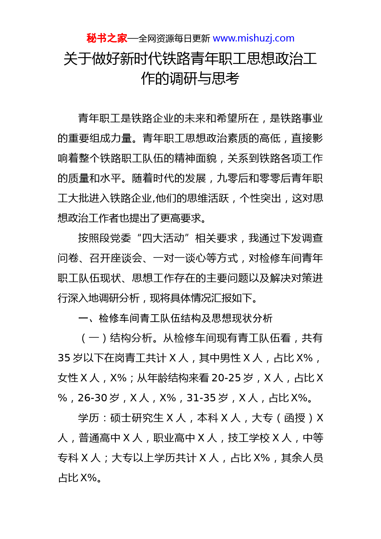 秘书之家—全网资源每日更新www.mishuzj.com关于做好新时代铁路青年职工思想政治工作的调研与思考青年职工是铁路企业的未来和希望所在,是铁路事业的重要组成力量。青年职工思想政治素质的高低,直接影响着整个铁路职工队伍的精神面貌,关系到铁路各项工作的质量和水平。随着时代的发展,九零后和零零后青年职工大批进入铁路企业,他们的思维活跃,个性突出,这对思想政治工作者也提出了更高要求。按照段党委“四大活动”相关要求,我通过下发调查问卷、召开座谈会、一对一谈心等方式,对检修车间青年职工队伍现状、思想工作存在的主要问题以及解决对策进行深入地调研分析,现将具体情况汇报如下。一、检修车间青工队伍结构及思想现状分析(一)结构分析。从检修车间现有青工队伍看,共有35岁以下在岗青工共计X人,其中男性X人,占比X%,女性X人,X%;从年龄结构来看20-25岁,X人,占比X%,26-30岁,X人,X%,31-35岁,X人,占比X%。学历:硕士研究生X人,本科X人,大专(函授)X人,普通高中X人,职业高中X人,技工学校X人,中等专科X人;大专以上学历共计X人,占比X%,其余人员占比X%。秘书之家—全网资源每日更新www.mishuzj.com(二)整体现状。近年来,在新进入铁路企业的青年职工当中,基本都是大专以上学历的,其中也不乏硕士研究生。他们思维活跃、思想多元,接受和学习新事物的能力较强,对新事物有自己的见解。此外,大多数青年职工充满激情,具有普遍的表现欲,渴望被认可和接受。但他们也存在一些较为突出的问题,具体表现在以下几个方面:一是功利性思想还较为突出。很多青年职工在日常工作中不够安心、脱离实际,存在好高骛远现象。他们不愿从基层工人做起,只想着一下子脱离工人队伍。导致大事做不来,小事不想做。很多青年职工认为自己有学历,和文化程度不如自己的老职工不一样,把学历当成资本,不安心学习技术,想当然的认为自己干不干活,学不学业务,未来企业最终都会给他们安排适当的工作岗位。二是职业精神缺失不容忽视。由于一些青年职工对职业的期望值过高,对于职业的判断缺乏理性,不切实际,再加之生产一线工作劳动强度大,作业环境相对较差等因素,导致其产生负面情绪。另外,一些老职工的负面言论,也在一定程度上干扰和影响了青年职工职业精神的树立。尤其是缺乏吃苦耐劳的精神,工作稍有压力就开始抱怨,不去想着怎么多承担工作任务来提高本领,而总想着少干活,图安逸。此外,部分青年职工没有更高层次的追求,干活只求过得去,不求过得硬。三是职业素养还不完全适应。部秘书之家—全网资源每日更新www.mishuzj.com分青工自由散漫、我行我素,不希望被各项管理制度所管束,导致他们的行为规范与企业要求相差甚大,职业素养难以适应企业管理要求。例如,有些青年职工经常存在迟到早退现象,或者没有请假便私自离开单位。有些青年职工职场作业文明化程度低,只想着快速把活干完,但却没有收拾好遗留配件、抹布和把机车部件擦拭干净。此外,还有些青年职工对单位的主流管理理念存在抵触情绪。二、青工思想政治工作存在的问题(一)齐抓共管的局面还没有形成。铁路企业政工干部与行政管理人员相比还比较少,且工作定量和标准正在逐年提高,这使得政工干部无暇去改进和创新思想政治工作方法,更没有太多精力对青年职工思想政治工作方法进行针对性研究。还有部分支部书记属于兼职工作,自身担当着自己的本职生产工作,这就分散了兼职支部书记的党务工作精力。而且,多数兼职支部书记为非政工专业出身,对他们缺乏系统培训,导致其对业务不够熟练,这也在很大程度上限制了思想政治工作的有效实施。此外,在青工的思想政治工作中,没有局外人和旁观者,党政工团各级组织都应担负起各自职责。然而现实中只抓生产、不过问思想工作,“一岗双责”落实不到位,把思想和生产分离开来,在参与上做的不主动等现象,割裂了思想工作与行政工作的有机联系。秘书之家—全网资源每日更新www.mishuzj.com(二)行之有效的方法还比较匮乏。根据现代青工成长环境以及思想特点,部分传统的思想政治工作方法已经很难适应。但实际我们在开展青工思想政治工作中经常是墨守成规,缺乏创新,习惯性运用以往的工作经验。没有把青工思想政治工作同本单位、部门日常实际工作情况结合起来。思想政治工作者往往掌握不好准确的切入点,一人一事的思想政治工作让青工难以找到共鸣。不了解青年职工的惯性思维,不迎合时代特点,对青年职工个人兴趣及心理特点没能很好掌握,与青年职工沟通交流不在一个频道,导致思想政治工作只停留在表面,不能深入青年职工内心,没有起到很好效果。(三)宣教阵地的覆盖还留有空白。开展思想政治工作时“大锅烩”,不考虑青年职工的个性差异,是青工思想工作效果不佳的又一问题。传统的宣传阵地和宣传手段已经完全不适合青工,青工日常更习惯从抖音、快手、知乎等APP上接收信息,而我们的宣传阵地上还没有延伸拓展于此,或者说已经拓展但还尚未完全占领。而且,受编制以及选人用人等条件限制,部分参加工作时间较长的大学生青工仍然在操作技能岗位工作,不同程度挫伤了他们的自信心。此外,只是一味重视青工岗位技能的培养,培训多以业务为主,忽略了青年职工职业道德和思想道德的教育。