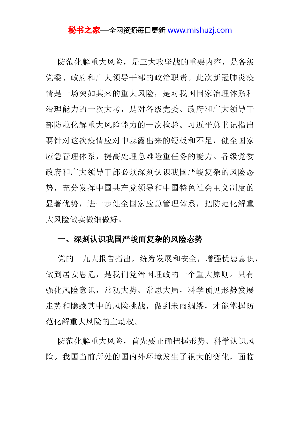 秘书之家—全网资源每日更新www.mishuzj.com防范化解重大风险,是三大攻坚战的重要内容,是各级党委、政府和广大领导干部的政治职责。此次新冠肺炎疫情是一场突如其来的重大风险,是对我国国家治理体系和治理能力的一次大考,是对各级党委、政府和广大领导干部防范化解重大风险能力的一次检验。习近平总书记指出要针对这次疫情应对中暴露出来的短板和不足,健全国家应急管理体系,提高处理急难险重任务的能力。各级党委政府和广大领导干部必须深刻认识我国严峻复杂的风险态势,充分发挥中国共产党领导和中国特色社会主义制度的显著优势,进一步健全国家应急管理体系,把防范化解重大风险做实做细做好。一、深刻认识我国严峻而复杂的风险态势党的十九大报告指出,统筹发展和安全,增强忧患意识,做到居安思危,是我们党治国理政的一个重大原则。只有强化风险意识,常观大势、常思大局,科学预见形势发展走势和隐藏其中的风险挑战,做到未雨绸缪,才能掌握防范化解重大风险的主动权。防范化解重大风险,首先要正确把握形势、科学认识风险。我国当前所处的国内外环境发生了很大的变化,面临秘书之家—全网资源每日更新www.mishuzj.com的风险态势也发生了很大的变化,集中呈现出各种风险复杂多样、连锁联动、极端风险更加凸显三大特点。(一)各种风险复杂多样中国特色社会主义进入新时代,我们今天开放发展的大环境总体上比以往任何时候都更为有利,同时面临的矛盾风险也前所未有。2015年10月,习近平总书记指出:“今后五年,可能是我国发展面临的各方面风险不断积累甚至集中显露的时期。我们面临的重大风险,既包括国内的经济、政治、意识形态、社会风险以及来自自然界的风险,也包括国际经济、政治、军事风险等。如果发生重大风险又扛不住,国家安全就可能面临重大威胁,全面建成小康社会进程就可能被迫中断。”党的十九大报告也强调:“更加自觉地防范各种风险,坚决战胜一切在政治、经济文化、社会等领域和自然界出现的困难和挑战。”风险是现代社会的重要特征。当前,我国面临对外维护国家主权安全、发展利益,对内维护政治安全和社会稳定的双重压力,各种可以预见和难以预见的风险因素明显增多。我们面临的风险是多种多样的,既包括自然风险、经济风险、技术风险,也包括健康风险、社会风险、政治风险,既包括在我国境内发生的本土性风险,也包括其他国家(地区)影响到我国的输入性风险。秘书之家—全网资源每日更新www.mishuzj.com(二)风险连锁联动当今社会是一个开放的巨系统,各种风险往往不是孤立出现的,很可能是你中有我、我中有你,相互交织并形成一个风险综合体。习近平总书记指出:“各种矛盾风险挑战源、各类矛盾风险挑战点是相互交织、相互作用的。如果防范不及、应对不力,就会传导、叠加、演变、升级,使小的矛盾风险挑战发展成大的矛盾风险挑战,局部的矛盾风险挑战发展成系统的矛盾风险挑战,国际上的矛盾风险挑战演变为国内的矛盾风险挑战,经济、社会、文化、生态领域的矛盾风险挑战转化为政治矛盾风险挑战,最终危及党的执政地位、危及国家安全。”伴随我国改革进入深水区,经济发展进入新常态,各种矛盾叠加,风险隐患集聚,很容易形成系统性风险,产生“涟漪效应”和“多米诺骨牌效应”。因此,我们要严密防范各种安全风险集聚交汇形成风险综合体,守住不发生系统性风险的底线。同时,在经济全球化时代,各国安全相互关联、彼此影响;没有一个国家能凭一己之力谋求自身绝对安全,也没有一个国家可以从别国的动荡中收获稳定。因此,我们要统筹国内、国际两个大局和发展、安全两件大事,既聚焦重点又统揽全局,有效防范各类风险连锁联动。秘书之家—全网资源每日更新www.mishuzj.com(三)极端风险更加凸显习近平总书记强调,“面对波谲云诡的国际形势、复杂敏感的周边环境、艰巨繁重的改革发展稳定任务,我们必须始终保持高度警惕,既要高度警惕‘黑天鹅’事件,也要防范‘灰犀牛’事件;既要有防范风险的先手,也要有应对和化解风险挑战的高招;既要打好防范和抵御风险的有准备之战,也要打好化险为夷、转危为机的战略主动战。”防范极端风险必须守住底线,决不能在根本性问题上出现颠覆性错误,一旦出现就无法挽回、无法弥补。新形势下我国国家安全和社会安定面临的重大风险明显增多,各种“黑天鹅”事件和“灰犀牛”事件造成的影响明显加大因此,防范化解重大风险,对决胜全面建成小康社会、夺取新时代中国特色社会主义伟大胜利、实现中华民族伟大复兴的中国梦十分紧要。各种风险我们都要防控,但重点要防控那些可能迟滞或中断中华民族伟大复兴的全局性风险。二、充分发挥中国特色社会主义制度的显著优势习近平总书记指出,打赢防范化解重大风险攻坚战,必须坚持和完善中国特色社会主义制度、推进国家治理体系和治理能力现代化,运用制度威力应对风险挑战的冲击。秘书之家—全网资源每日更新www.mishuzj.com中国特色社会主义制度具有明显制度优势。事实证明,中国特色社会主义制度能够战胜面临的国内外各种风险挑战并在这个过程中不断完善和发展。站在新的历史起点上,有效应对日益复杂严峻的风险挑战,必须更加充分地发挥我国强