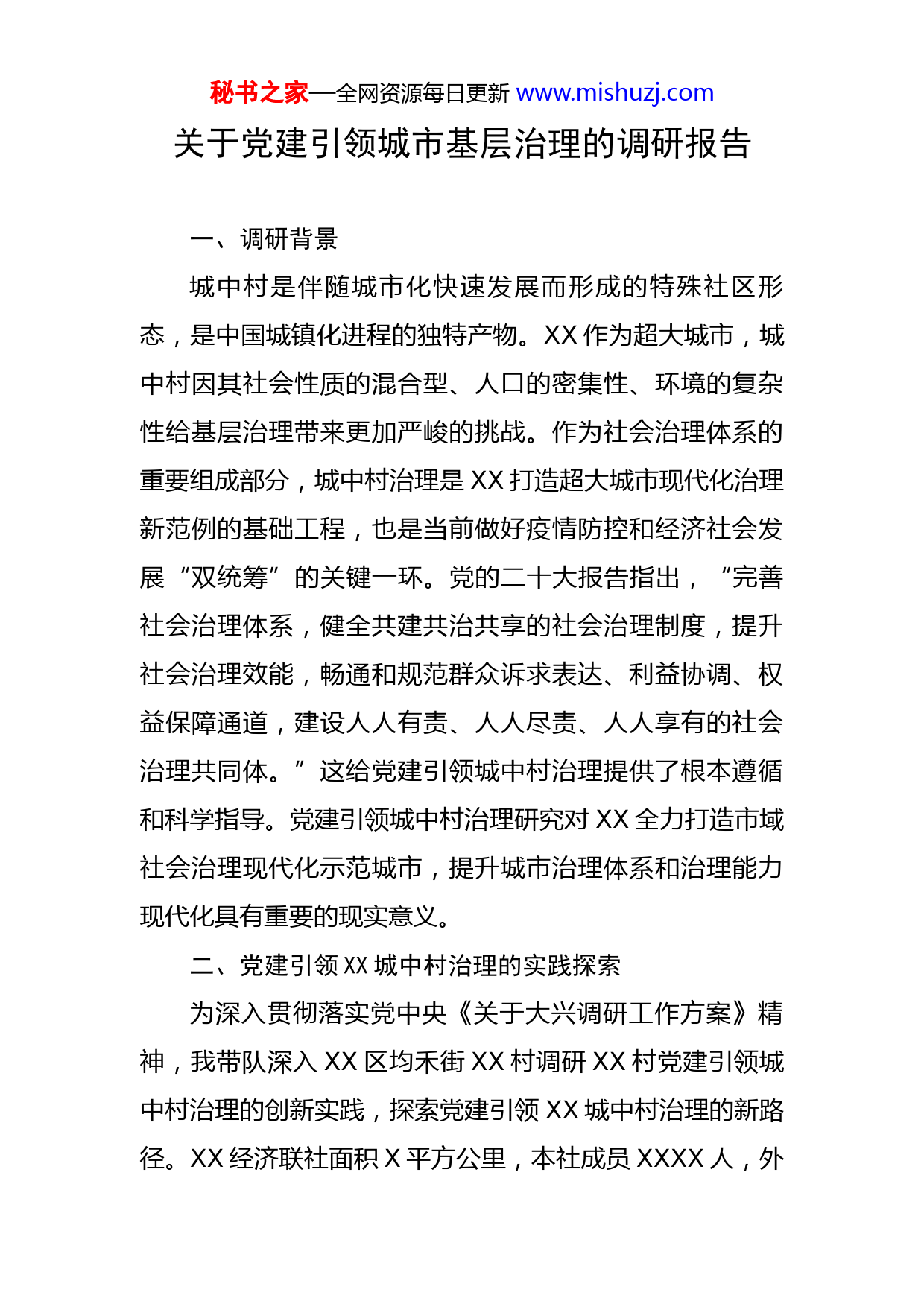 秘书之家—全网资源每日更新www.mishuzj.com关于党建引领城市基层治理的调研报告一、调研背景城中村是伴随城市化快速发展而形成的特殊社区形态,是中国城镇化进程的独特产物。XX作为超大城市,城中村因其社会性质的混合型、人口的密集性、环境的复杂性给基层治理带来更加严峻的挑战。作为社会治理体系的重要组成部分,城中村治理是XX打造超大城市现代化治理新范例的基础工程,也是当前做好疫情防控和经济社会发展“双统筹”的关键一环。党的二十大报告指出,“完善社会治理体系,健全共建共治共享的社会治理制度,提升社会治理效能,畅通和规范群众诉求表达、利益协调、权益保障通道,建设人人有责、人人尽责、人人享有的社会治理共同体。”这给党建引领城中村治理提供了根本遵循和科学指导。党建引领城中村治理研究对XX全力打造市域社会治理现代化示范城市,提升城市治理体系和治理能力现代化具有重要的现实意义。二、党建引领XX城中村治理的实践探索为深入贯彻落实党中央《关于大兴调研工作方案》精神,我带队深入XX区均禾街XX村调研XX村党建引领城中村治理的创新实践,探索党建引领XX城中村治理的新路径。XX经济联社面积X平方公里,本社成员XXXX人,外秘书之家—全网资源每日更新www.mishuzj.com来人口超过XX万人,还有XXX余家小型企业、作坊工厂。结合XX实际,建立以XX联社党委为领导的领导体系、创新“户组制”延伸网格化治理触角、推行“三问”群众工作法、建立“村企联盟”共建共治共享机制、用“绣花”功夫建设文化生活环境、应用广视角多维度信息化管理平台,推动XX治理往精细化品质化道路不断前进。(一)构建以集体经济组织党组织为领导的城中村领导体系城中村社会主体多元,有村改居后的社区居委会,有各类租赁其土地、物业的新经济组织,还有租住的外来人口。而原来的村民既是被服务对象,又是出租屋管理主体,多元聚集,如何融合,需要建立一个强有力的领导核心。虽然集体经济组织理论上与辖内社区、各类主体应是平行关系,但因为处于经济上的主导地位,实际上又承接着社会管理职能,需要重新构建适应城中村治理的领导框架,解决领导核心不突出问题。一是联社党委牵头构建区域化大党建格局。由联社党委为总牵头,发动辖内X个社区党支部组建XX片区大党委,明确社区党组织主要负责居民服务,联社党委履行经济发展职能,兜底辖内社会管理各项事务。条块结合,确保党的组织和工作全覆盖,把支部建在经济社上,发动居住地党员到社区报到,组建经济社网格党支部,结合群众需求和工作需要,通过选、派、秘书之家—全网资源每日更新www.mishuzj.com挂等方式,组建安全生产企业创建党支部、精品路治理党支部、老人关爱站党支部、妇女儿童关爱站党支部,让辖内每名党员都纳入组织管理,每寸土地都有党组织领导。二是多渠道选才配好高素质专业化领头羊。启动人才回村计划,将符合条件的党员组织关系转回联社党委,联社年轻党员比例从XX%上升到XXX%,大专以上学历从XX%提升到XX%,为城中村人才蓄水池引入源头活水。由第一书记亲自教育、亲自培养,创造机会帮助年轻党员融入集体、服务群众,特别是在疫情防控期间,带着年轻党员冲在前面,厚植群众基础。新当选党委班子年龄、结构得到根本改变,平均年龄由原来的XX岁下降到XX岁,专业背景涵盖物业管理高层、企业销售主管、社区工作者、经济社社长等。三是改革选举制度巩固党委对经济社的领导权。经济社直接掌握大量资产、土地以及集体收益初次分配权,经济社的领导权尤为重要。从党管干部入手,改革经济社一级选举制度,将经济社干部任命权牢牢抓在联社党委手中,从根本上加强联社党委的领导力。充分利用集体经济组织换届选举的自治性,依法依规重新制定选举规则,严格落实“六公开”,明确由党组织提名候选人,约定未经公开报名及上级党委政审当选无效。实行社长任命制、选任分离,改变“票多即社长、当选即当权”的旧选举格局,让群众都意识到,当选只是入围,未经任命或聘秘书之家—全网资源每日更新www.mishuzj.com任,不享受工资待遇,不参与分工,只有成员代表身份。选举规则的重新制定,清除了基层换届选举的各种不良风气,让拉票贿选变得毫无意义,并极大提高了参选者投入基层治理工作的积极性。在疫情防控工作中,更多的报名参选者通过积极投身抗疫工作,争取被党组织发现、肯定。(二)创新“户组制”最小治理单元,延伸城中村网格治理触角XX村下辖X个经济社,共有XXX条街巷,合计XXXX栋出租屋,每个经济社平均约需管理XXX栋出租屋、XXXX人。在疫情防控过程中,经济社干部与房东(出租屋主)之间缺乏有力的固定机构来链接,上级指令下达经济社后,经济社再以简单方式传达,但有多少人接受指令、多少人贯彻落实,就成了一笔糊涂账。对此,XX联社党委提出“户组制”管理思路,制定出台“户组制”十条意见,实行依巷划组、分治到户、责任上楼,切割经济社二级治理网格责任田,把工作机构、专项力量下沉到户组这个最小治理单元,做到每条街巷、每栋出租屋、每名房东(出租屋主)、每位居住人员都有人员管理,用“绣花”功夫夯实基层组织基础。一是建立“经济社-户组长-栋长-外来人员”四级责任体系。科学设置经济社一级管理架构,