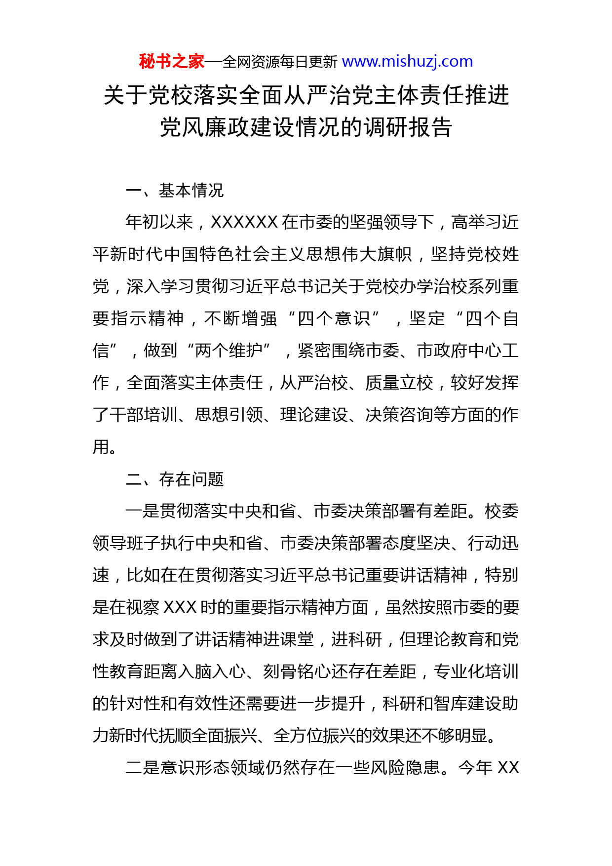 秘书之家—全网资源每日更新www.mishuzj.com关于党校落实全面从严治党主体责任推进党风廉政建设情况的调研报告一、基本情况年初以来,XXXXXX在市委的坚强领导下,高举习近平新时代中国特色社会主义思想伟大旗帜,坚持党校姓党,深入学习贯彻习近平总书记关于党校办学治校系列重要指示精神,不断增强“四个意识”,坚定“四个自信”,做到“两个维护”,紧密围绕市委、市政府中心工作,全面落实主体责任,从严治校、质量立校,较好发挥了干部培训、思想引领、理论建设、决策咨询等方面的作用。二、存在问题一是贯彻落实中央和省、市委决策部署有差距。校委领导班子执行中央和省、市委决策部署态度坚决、行动迅速,比如在在贯彻落实习近平总书记重要讲话精神,特别是在视察XXX时的重要指示精神方面,虽然按照市委的要求及时做到了讲话精神进课堂,进科研,但理论教育和党性教育距离入脑入心、刻骨铭心还存在差距,专业化培训的针对性和有效性还需要进一步提升,科研和智库建设助力新时代抚顺全面振兴、全方位振兴的效果还不够明显。二是意识形态领域仍然存在一些风险隐患。今年XX秘书之家—全网资源每日更新www.mishuzj.com月,在校园网站发生了“XXXXXX错误”。虽然立即进行了整改,并对相关人员进行了处理。但也暴露出在落实网络意识形态工作责任制、强化网络安全保障、加强舆情监控处置等方面还存在薄弱环节。三是党内组织生活制度落实质量不高。“三会一课”开展质量不高,基层党支部主动谋划活动偏少、针对性不强。党员学习教育形式和内容设计比较单一,更多为集体学习,习惯于念报纸、读文件、传达领导讲话,与实际联系不紧密,缺乏吸引力和凝聚力。谈心交流偏少。班子成员之间、班子成员与分管科室人员,面对面相互沟通思想偏少,对党员干部日常关心关爱不到位,在多渠道了解掌握干部思想动态、精神状态方面做得还不够。三、原因分析一是党的领导弱化。机构改革后,“机关党委”与“人事科”合并成“党群工作部”,原人事科科长担任党群工作部部长,副科长担任党群工作部副部长,机关党委专职副书记身份尴尬。同时,机关党委会从XX年XX月XX日成立至今,已有近XX年时间没有换过届。目前,专职副书记人选不确定、部分委员空缺,党委会软弱涣散,管理混乱。二是监督职责缺失。派驻机构对纪检工作指导和管理力度不够、办法不多;校内纪检工作由机关党委负责,职秘书之家—全网资源每日更新www.mishuzj.com责定位不清、形同虚设,对教职工反映的“带病提拔”、违规用人、等问题处理不及时,解决不到位。三是领导干部素质能力较低。现任领导班子是今年XX月份新组建的。班子成员各司自职,还没有形成合力,凝聚力不够。中层干部担当进取意识不强,遇到难题绕着走、遇到任务推着干,工作态度不积极、办法不多。个别干部私心严重,拉帮结伙,不同程度存在“小圈子”、搞“帮派”现象。四、改进措施一是要进一步强化政治机关、政治学校建设。作为党的政治机关、政治学校,必须树牢政治机关意识,勇担政治学校使命,坚持党的领导,自觉同党中央保持高度一致,深刻领会“两个确立”的决定性意义,不断增强“四个意识”,坚定“四个自信”,做到“两个维护”。同时,要认真落实意识形态工作责任,不断加强阵地管理,进一步规范完善网上信息报送、发布、管理办法,对相关工作人员严格要求、加强监管,切实做到校园网站、微信平台等各类意识形态阵地可管可控,确保不再出现任何负面影响。二要进一步加强党的组织建设。首先要解决好提高党内组织生活实效性的问题。在内容上,就是要把学习内容跟工作实际有机结合。在形式上,就是要充分发挥校委理秘书之家—全网资源每日更新www.mishuzj.com论学习中心组的示范引领作用和党支部的主体作用,创新学习方式,通过中心组学习会议、党支部“三会一课”、主题党日、专题报告会、理论研讨会等多种方式,确保学习取得实效。同时,要努力打造好具有XX特色的党建品牌。要立足职能定位,结合自身的理论优势、学科优势、人才优势,创新“自选动作”,丰富载体,推进“一支部一品牌”建设。其次要做好教职工思想政治工作。思想政治工作是一切工作的生命线。党支部担负着直接教育、管理、监督党员和组织、宣传、凝聚、服务群众的职责,做好支部层面的思想政治工作是应有之义。具体来说,就是要统一党员的思想认识和行动,及时准确掌握党员的思想状况,有针对性地做好理顺情绪、解疑释惑、化解矛盾等工作。三是要提升纪律规矩意识,全面加强党风廉政建设。XX绝不是清水衙门,大到基本建设、资金流转、晋职晋级,小到采购招标、财务报销,都存在廉政风险点;无论是“8小时”以内,还是“8小时”以外,所代表的都是XXX形象,必须始终筑牢思想防线,严守规矩和底线。要完善制度机制。用制度管物、管人、管事,严格依法、依规、依程序办事。要抓好风险排查。要完善风险防控机制,全面排查党风廉政建设风险点,把防控关口前移,抓早抓小抓苗头,把风险解决在未萌和萌芽状态,尤其是紧秘书之家—全网资源每日更新www.mishuzj.com盯重点部位、重点工作。同时,要落实好中央八项规定和市委实施细则精神。严格“三公”经费管理,严防“四风”反弹。要抓好巡察整