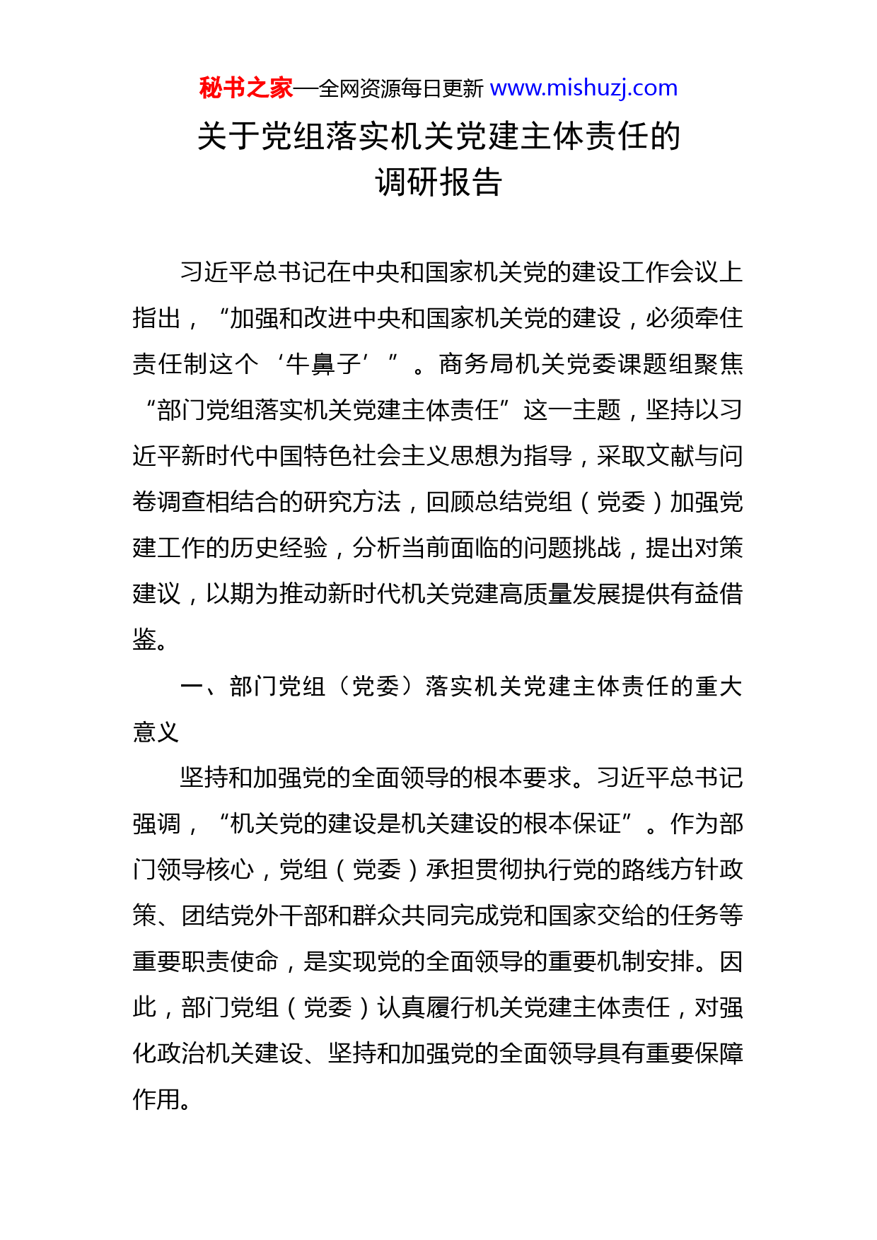 秘书之家—全网资源每日更新www.mishuzj.com关于党组落实机关党建主体责任的调研报告习近平总书记在中央和国家机关党的建设工作会议上指出,“加强和改进中央和国家机关党的建设,必须牵住责任制这个‘牛鼻子’”。商务局机关党委课题组聚焦“部门党组落实机关党建主体责任”这一主题,坚持以习近平新时代中国特色社会主义思想为指导,采取文献与问卷调查相结合的研究方法,回顾总结党组(党委)加强党建工作的历史经验,分析当前面临的问题挑战,提出对策建议,以期为推动新时代机关党建高质量发展提供有益借鉴。一、部门党组(党委)落实机关党建主体责任的重大意义坚持和加强党的全面领导的根本要求。习近平总书记强调,“机关党的建设是机关建设的根本保证”。作为部门领导核心,党组(党委)承担贯彻执行党的路线方针政策、团结党外干部和群众共同完成党和国家交给的任务等重要职责使命,是实现党的全面领导的重要机制安排。因此,部门党组(党委)认真履行机关党建主体责任,对强化政治机关建设、坚持和加强党的全面领导具有重要保障作用。秘书之家—全网资源每日更新www.mishuzj.com推动全面从严治党向纵深发展的必然要求。习近平总书记强调,“各部门党组(党委)要加强对本单位党的建设的领导,履行好全面从严治党责任”。2020年中央办公厅印发《党委(党组)落实全面从严治党主体责任规定》,明确在推动机关党的建设和全面从严治党的伟大实践中,党组(党委)既是双“责任主体”,又承担着双“主体责任”。因此,部门党组(党委)落实机关党建主体责任与落实全面从严治党主体责任相互促进,都是推动全面从严治党向纵深发展的关键举措。推动机关党建高质量发展的重要保障。2019年新修订的《中国共产党党和国家机关基层组织工作条例》规定,“机关党建工作在各级党委领导下,由同级党的机关工作委员会统一领导、单位党组(党委)具体领导和管理,有关部门各负其责、密切配合,形成工作合力”,进一步理顺了机关党建的领导体制和运行机制,有效厘清不同主体的责任边界。依据上述规定,党组(党委)是本部门落实机关党建工作责任制的关键环节,也是牢牢牵住责任制“牛鼻子”、推动机关党建高质量发展最重要的责任主体。二、党组(党委)开展党建工作的历史考察新民主主义革命时期:应运而生并初步探索。1925年党的四大正式提出组建中共党团,并明确“吾党在国民党秘书之家—全网资源每日更新www.mishuzj.com及其他有政治性质的重要团体中,应组织党团,从中支配该党和该团体的活动”。这就是党组前身。1928年,党的六大党章再次细化党团的任务,即“在于非党的组织中,加强党的影响,实行党的政策,并监督党员在非党组织中之工作”。抗日战争时期,党制定发布《关于统一抗日根据地党的领导及调整各组织间关系的决定》,将党团作用发挥作为关键点进行系统规定。1945年,党的七大全面正式将“党团”改为“党组”,规定“党组的任务,是在各该组织的领导机关中指导党员为加强党的影响、实现党的政策而工作”。从探索成立到逐步发展,党组始终担负着宣传党的政策、壮大党的力量等重要职责,对加强党的建设、强化党的领导和推动中国革命迅速发展产生了巨大作用。社会主义革命和建设时期:逐步规范发展。新中国成立后,党组在机关党建中的作用进一步规范和细化。1949年党中央印发《关于在中央人民政府内建立中国共产党党组的决定》,要求在中央人民政府中担任负责工作的共产党员组成党组,以在政府工作中贯彻党的政治路线及各项政策。1956年党的八大党章规定,机关党的基层组织“应当对于机关中每一个党员(包括行政负责人)的思想政治情况进行监督”。赋予机关党组织对本机关党员监督的职责,是我们党加强自身建设的重要创新,党组承担的具体秘书之家—全网资源每日更新www.mishuzj.com党建工作责任进一步明确。改革开放和社会主义现代化建设新时期:在调整探索中实现制度化发展。随着改革开放深入推进,1987年党的十三大报告提出要逐步撤销政府部门中共党组。随后,党中央认识到党的领导被削弱和党的建设弱化会带来不良后果,本已处在被撤销过程之中的党组又开始逐渐恢复。1998年党中央印发《中国共产党党和国家机关基层组织工作条例》,规定部门党组(党委)对本机关和直属单位党的工作负有指导责任。2006年党中央印发《关于建立健全地方党委、部门党组(党委)抓基层党建工作责任制的意见》,要求部门党组(党委)抓基层党建工作要“努力形成责任明确、领导有力、运转有序、保障到位的工作机制,促进基层党建工作科学化、制度化和规范化”,这标志着党组(党委)抓机关党建工作正式迈入制度化和规范化阶段。中国特色社会主义新时代:不断强化并开创新的局面。党的十八大以来,我们党系统总结党的建设成功经验,大力加强党组(党委)履行机关党建工作责任的制度化和规范化建设。2015年以来党中央先后印发《中国共产党党组工作条例》《中国共产党党委(党组)理论学习中心组学习规则》《党委(党组)落实全面从严治党主体责任规定》《中国共产党党和国家机关基层组织工作条例》秘书之家—全网资源每日更新www.mishuzj.com等制度文件,将党组对机关党建工作的责任由“指导”改为“具体领