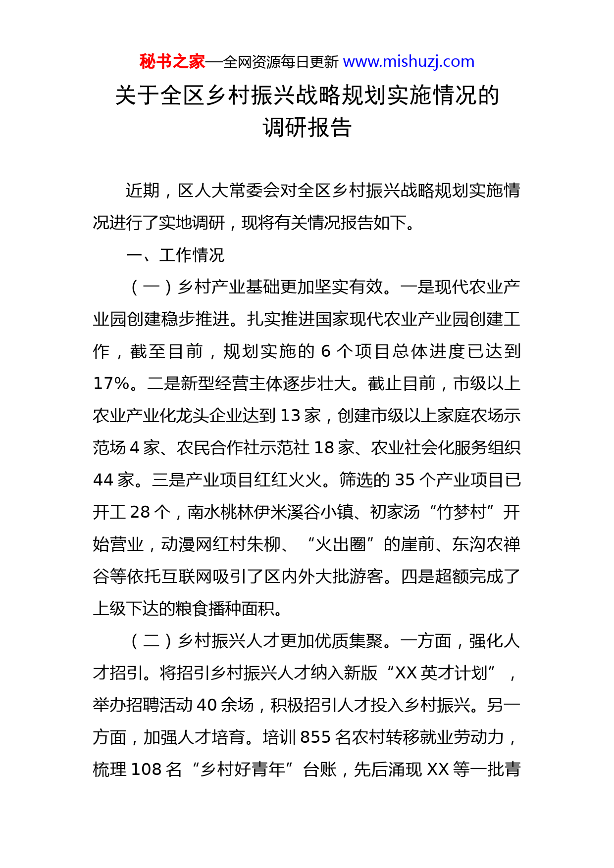 秘书之家—全网资源每日更新www.mishuzj.com关于全区乡村振兴战略规划实施情况的调研报告近期,区人大常委会对全区乡村振兴战略规划实施情况进行了实地调研,现将有关情况报告如下。一、工作情况(一)乡村产业基础更加坚实有效。一是现代农业产业园创建稳步推进。扎实推进国家现代农业产业园创建工作,截至目前,规划实施的6个项目总体进度已达到17%。二是新型经营主体逐步壮大。截止目前,市级以上农业产业化龙头企业达到13家,创建市级以上家庭农场示范场4家、农民合作社示范社18家、农业社会化服务组织44家。三是产业项目红红火火。筛选的35个产业项目已开工28个,南水桃林伊米溪谷小镇、初家汤“竹梦村”开始营业,动漫网红村朱柳、“火出圈”的崖前、东沟农禅谷等依托互联网吸引了区内外大批游客。四是超额完成了上级下达的粮食播种面积。(二)乡村振兴人才更加优质集聚。一方面,强化人才招引。将招引乡村振兴人才纳入新版“XX英才计划”,举办招聘活动40余场,积极招引人才投入乡村振兴。另一方面,加强人才培育。培训855名农村转移就业劳动力,梳理108名“乡村好青年”台账,先后涌现XX等一批青秘书之家—全网资源每日更新www.mishuzj.com年人才投身XX乡村振兴。(三)乡风文化氛围更加淳朴厚重。一是打牢新时代文明实践基础。充分利用1个中心、7个所、102个文明实践站,上半年,开展线上线下各类活动230余场,放映公益电影600余场。二是积极开展丰富多彩文体活动。举办全区健身骨干培训班30余次,累计培训1000余人次。举办“美育大讲堂”3期,组织首届乡村美学大赛等活动,推选XX市“美丽人家”8户。三是积极涵育新时代文明乡风。启动区街村三级公益性墓地建设,累计培训红白理事会骨干成员357人次,成功举办XX市第二届海葬公祭活动。(四)农村人居环境更加生态宜居。一是大力开展人居环境整治。设计印制了《XX区农村人居环境整治标准手册》,出台了《XX区农村人居环境整治提升督导考核方案》,加大督导力度,实行立知立改,有力促进了各项整治任务的落实。二是扎实推进美丽乡村建设。制定出台《XX区美丽乡村示范片奖补办法》,确定了优先打造的41个美丽乡村,涉及的109个项目,目前已完工106个。三是积极推进“美丽庭院”建设。美丽庭院示范户创建比例达到53%。今年计划打造的26个美丽庭院示范村,目前已建成19个,同步建成美丽超市19个。四是全力改善农村公共服务。高标准完成农村改水改厕工程。全秘书之家—全网资源每日更新www.mishuzj.com域实行了生活垃圾分类,所有村居生活垃圾实行了每天2轮的常态化覆盖式上门收运服务。(五)乡村治理保障更加和谐有序。软弱涣散村突出问题整改验收率达100%。“双清强基”攻坚行动中,清理不规范合同218个,增加集体收入3472万元。全区24个村完成村改社区转型,招录社区工作者150人,招录转型分流村干部50人。南部三个街道所有行政村已配备1名“法治带头人”和3名“法律明白人”,59个行政村在图书馆内打造“法治角”,实现一村一法治文化阵地。二、主要问题(一)部分村集体经济薄弱,村干部发展乡村产业主动性不足。不少村集体经济收入主要依靠村办公大院或者旧厂房出租,持续增收渠道少。一方面,部分村干部存在畏难发愁情绪,等靠要思想严重。有的村对看好的项目,一味的等靠要上级资金支持,导致项目久拖不决或决而不干。另一方面,部分村干部缺乏产业振兴的经验和本领。部分项目由于缺乏专业的管理团队、人员,项目重建设轻管理现象比较突出,项目没有取得最大收益。(二)农村产业项目不大不强。一是涉农龙头企业带动性不强,村民增收主要靠在涉农企业打工的收入。二是项目三产融合程度低,农业+旅游+文化、互联网+农业等产业融合发展不够。三是项目同质化较重,农业项目大都秘书之家—全网资源每日更新www.mishuzj.com仍处于低小散状态,没有形成规模化效益。(三)农村人居环境提升还需持续发力。一方面农村人居环境整治氛围不浓。部分村民认为环境整治是政府的事,参与度不高,“上热下冷”和“政府干、农民看”等现象依然存在。另一方面农村环境整治长效维护机制亟需完善。农村人居环境整治之后,由于管护工作跟不上,整治效果难以持久;改水改厕工程完工后,亟需建立长期的维护机制。(四)要素保障和部门协调推进机制仍需完善。农村居住人口老龄化问题越来越突出,乡村振兴人才匮乏,新型职业农民群体尚未形成,导致乡村振兴后劲不足,仍需继续加大乡村振兴人才的招引、培育力度;各部门推动乡村振兴的合力仍需加强。三、几点建议(一)发挥区位优势,继续打牢产业基础。一要全力创建国家现代农业产业园。在配齐配强现代农业产业园管理团队的基础上,加快创建国家现代农业产业园进程,按时完成创建任务。同时,以创建国家现代农业产业园为契机,辐射带动产业园范围内的产业升级,农民增收。二要做好城郊型农业文章。发挥区位和环境优势,立足城乡融合,大力发展旅游观光、农事体验、休闲康养、高端农产品等项目;发挥国有文旅企业管理优势,整合文旅资源好秘书之家—全网资源每日更新www.mishuzj.com产分,打造近郊游精品线路;大力发展农村电商,扩大宣传和销售渠道,各方合力推进一二三产业深度融合发展。三要加大招引力度。摸清农