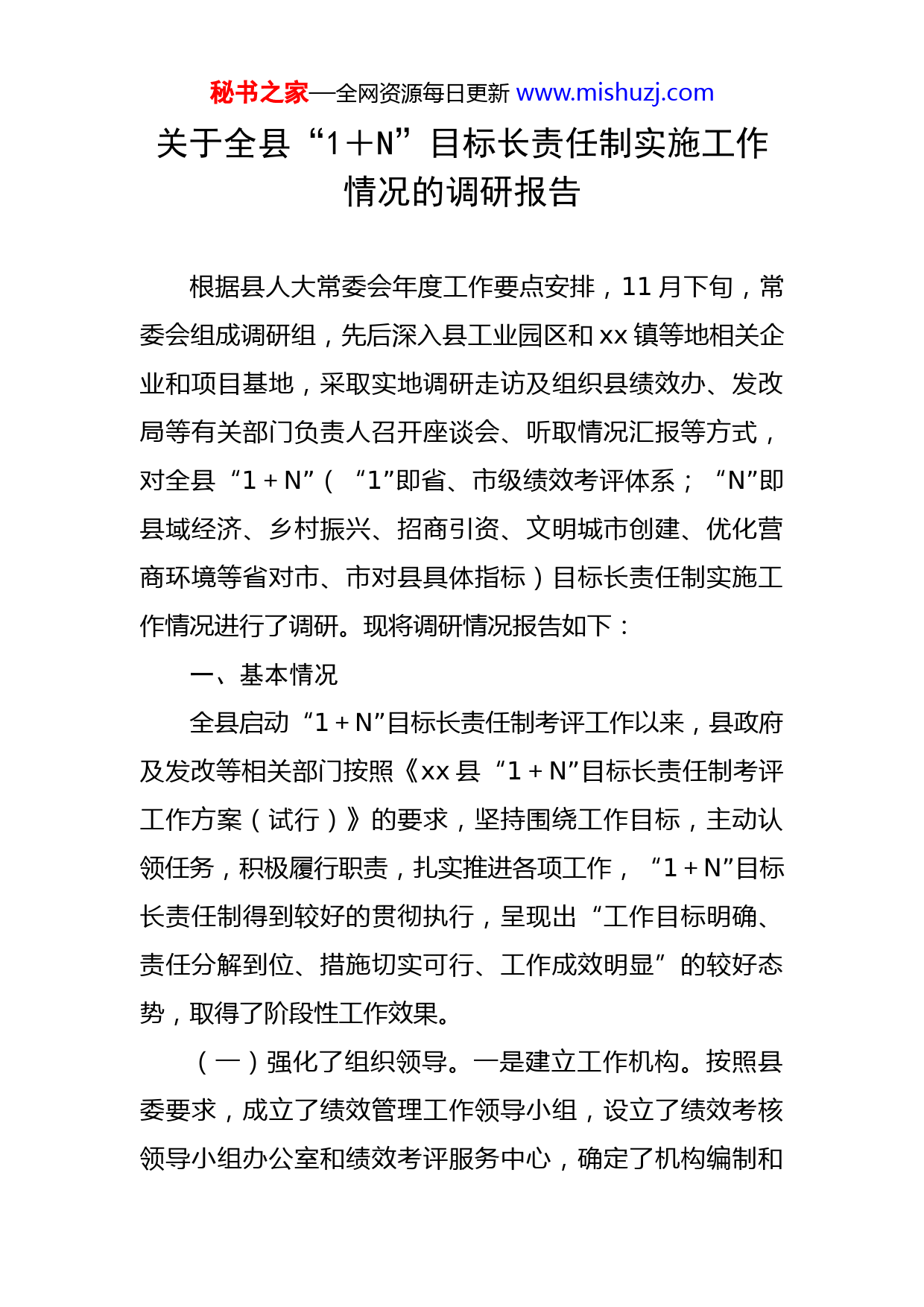 秘书之家—全网资源每日更新www.mishuzj.com关于全县“1+N”目标长责任制实施工作情况的调研报告根据县人大常委会年度工作要点安排,11月下旬,常委会组成调研组,先后深入县工业园区和xx镇等地相关企业和项目基地,采取实地调研走访及组织县绩效办、发改局等有关部门负责人召开座谈会、听取情况汇报等方式,对全县“1+N”(“1”即省、市级绩效考评体系;“N”即县域经济、乡村振兴、招商引资、文明城市创建、优化营商环境等省对市、市对县具体指标)目标长责任制实施工作情况进行了调研。现将调研情况报告如下:一、基本情况全县启动“1+N”目标长责任制考评工作以来,县政府及发改等相关部门按照《xx县“1+N”目标长责任制考评工作方案(试行)》的要求,坚持围绕工作目标,主动认领任务,积极履行职责,扎实推进各项工作,“1+N”目标长责任制得到较好的贯彻执行,呈现出“工作目标明确、责任分解到位、措施切实可行、工作成效明显”的较好态势,取得了阶段性工作效果。(一)强化了组织领导。一是建立工作机构。按照县委要求,成立了绩效管理工作领导小组,设立了绩效考核领导小组办公室和绩效考评服务中心,确定了机构编制和秘书之家—全网资源每日更新www.mishuzj.com人员(实行两块牌子、一套人员),并已落实到位。二是明确具体职责。明确了绩效考核领导小组办公室(绩效考评服务中心)承担的职能职责,并认真开展建立绩效考评评价机制、拟定绩效考核目标体系、分解目标任务,做好与上级的沟通联系、承担上级绩效考核迎检、指导全县机关事业单位全过程绩效管理和对全县重点考核目标的督办、考评通报、落实奖惩机制等工作。(二)完善了工作机制。一是构建管理体系。根据县委提出的“综合考评跻身全市前三,重要指标跻身省市第一方阵”的目标,精准设置目标体系,切实明确责任体系,不断完善管理体系,工作导向更加清晰。全县“1+N”目标长工作机制在以市绩效考评指标框架为总指向的前提下,形成“1托8”的绩效管理体系,将全县重点核心工作应纳尽纳,全方位、多角度设计考核内容,考核体系更加全面。二是落实工作责任。建立“目标长”“目标人”“承担人”和“落实人”的“四级工作负责制”,坚持把目标长制各项指标目标责任落实到人到岗,全县共将62项绩效考评指标分解到xx位目标长、xx位目标人、xx位承担人、xx位落实人,制定《“1+N”目标长责任制重点工作项目分解表》,对分解表实行动态调整并送至各目标长、责任单位,确保各级指标责任人对指标内容更加清楚,任务更加明确,为推动全县绩效管理工作上台阶提供秘书之家—全网资源每日更新www.mishuzj.com了机制保障。三是注重过程督导。通过建立县委政府主要领导每月集中调度“目标长”、“目标长”每月调度“目标人”的机制,定期召开调度会,研究解决重点问题以助推工作;建立全县重点实施项目亮灯预警管理机制,每半个月对全县重点项目进行一次集中亮灯,进行预警管理以倒逼工作;建立定期分析研判通报机制,县绩效办定期收集汇总各责任单位指标对接、落实情况,形成专报进行通报,对指标进度慢、差距较大的,及时发函提醒以“补强”工作。四是实行奖惩兑现。第一,强化跟踪问效。成立绩效考核专项督查小组,通过专项督查、座谈会、个人访谈等方式,对不作为、慢作为、乱作为的现象进行督查,对督查中发现的问题,实行“红黑榜”通报制度,制定整改措施,明确到具体责任和整改时限,推动工作任务落实;由县绩效考评中心牵头负责,县发改局项目办配合,对全县年度重大实施项目按照必达目标及季度、月度目标,进行动态监测预警,并持续跟踪工作推动情况;以季度、年度综合考评为节点,根据市对县考核通报,对指标成绩排名靠后的“1+N”目标长四级责任人到县委党校跟班学习,邀请市直单位业务精英进行业务专题点对点授课培训;对排名较上一次出现后退的指标四级责任人,组织到市直主管部门具体业务科室跟班学习。第二,突出正向激励。把绩效指标考核成绩作为衡量各单位工作表现的一秘书之家—全网资源每日更新www.mishuzj.com部分,将指标任务完成情况纳入党政领导班子履职尽责考察范围,充分调动各级干部工作的积极性和主动性。按照“优绩优酬、责益相符”的原则,把考评结果与干部工资、人员考核、干部调整、职级晋升、评先评优挂钩,激励干部善于谋事、勇于干事、积极成事。在二季度考核中,拟对市对县三季度考评第一方阵的xx名干部进行职级职员晋升。(三)助推了整体工作。“1+N”目标长责任制的实施,树立了改革创新、选贤任能、争先创优的积极导向,有力的促进了全县各项工作。一是主体责任有加强。在考评体系的指引下,结合指标内容及单位职能,分层、分级、科学落实“1+N”目标长工作责任,建立考评结果反馈与整改、激励与问责的长效机制,形成了“高位引领、上下联动、统分结合、协同推进”的工作格局,夯实了各部门工作责任。二是沟通对接有改善。通过“1+N”目标长制,既督促了各责任单位与市级部门的联系沟通,使上级领导、科室对下指导交流更加密切,对xx亮点工作更加了解,也推动了县内各部门间通力合作,强化了“一盘棋”思想,促进各项目标任务落实落细,同时也与其他县市区实现了良性竞争,也在省市产生了