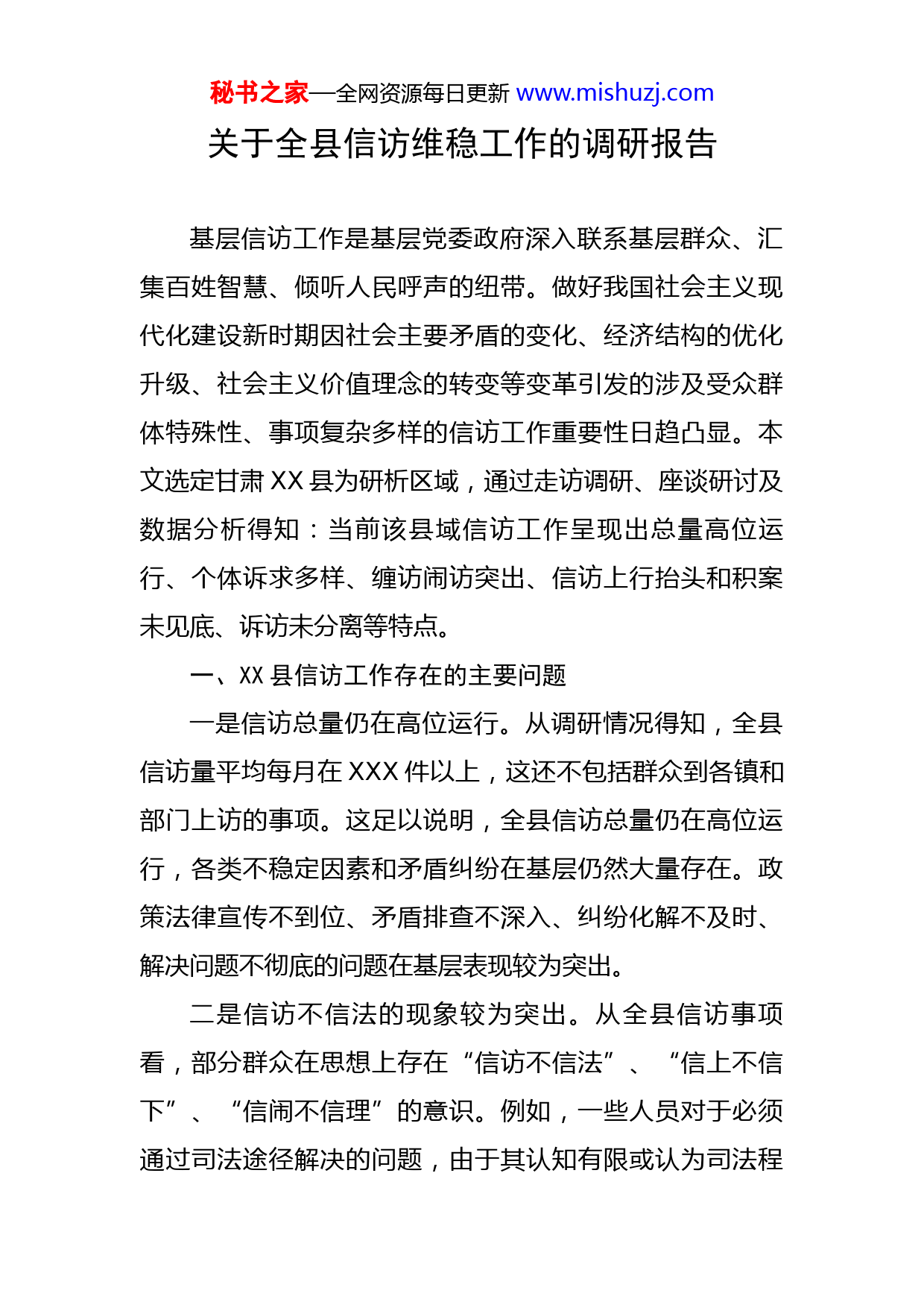 秘书之家—全网资源每日更新www.mishuzj.com关于全县信访维稳工作的调研报告基层信访工作是基层党委政府深入联系基层群众、汇集百姓智慧、倾听人民呼声的纽带。做好我国社会主义现代化建设新时期因社会主要矛盾的变化、经济结构的优化升级、社会主义价值理念的转变等变革引发的涉及受众群体特殊性、事项复杂多样的信访工作重要性日趋凸显。本文选定甘肃XX县为研析区域,通过走访调研、座谈研讨及数据分析得知:当前该县域信访工作呈现出总量高位运行、个体诉求多样、缠访闹访突出、信访上行抬头和积案未见底、诉访未分离等特点。一、XX县信访工作存在的主要问题一是信访总量仍在高位运行。从调研情况得知,全县信访量平均每月在XXX件以上,这还不包括群众到各镇和部门上访的事项。这足以说明,全县信访总量仍在高位运行,各类不稳定因素和矛盾纠纷在基层仍然大量存在。政策法律宣传不到位、矛盾排查不深入、纠纷化解不及时、解决问题不彻底的问题在基层表现较为突出。二是信访不信法的现象较为突出。从全县信访事项看,部分群众在思想上存在“信访不信法”、“信上不信下”、“信闹不信理”的意识。例如,一些人员对于必须通过司法途径解决的问题,由于其认知有限或认为司法程秘书之家—全网资源每日更新www.mishuzj.com序繁杂、流程颇多而有意上访。若对其思想疏导和教育稳控过于严格,又会使得这些人层层向纪检监察部门反映,使一个问题变成多个问题,老问题未解决又产生了新的矛盾,重信重访问题突出。还有部分人员明知诉求事项无理,却多次缠访闹访、串联上访、越级上访,认为“大闹大解决、小闹小解决、不闹不解决”,不断给政府施加压力。三是历史遗留问题解决难度较大。对于各行业深化改革、政策阶段性优化调整产生的差异性问题,部分群众按照当时政策已全部兑现且都已接受,但随着社会不断发展进步和各项惠民政策的实施,这些人员认为他们当时的待遇兑现较低或没有落实到位,要按现在的新政策、新标准来兑现落实,但新政策又没有对反映的问题作出明确规定,解决这些问题难度较大,让政府无策、干部头痛、群众不满。同时,解决拖欠农民工工资问题政府压力较大,经了解,全县内拖欠农民工工资主要发生在新农村社区建设项目,因资金链断裂,工程款不到位,使政府部门、建设企业与农民工之间形成了很长的“债务链”,解决拖欠农民工工资问题难度较大。四是重点人员稳控让基层头痛。全县摸排出的XXX名重点人员和XX个重点群体,他们的诉求都超越政策界线,多次调解都无济于事。这些人往往情绪激动、行为过激,秘书之家—全网资源每日更新www.mishuzj.com多选择在重要节会期间上访,给政府施加压力,并且在上访过程中有意规避法律风险,政府依法处理取证难。基层工作人员稳控只能侧面了解情况,借助其他工作入户掌握动态。因此,要做好稳控工作着实让基层头痛。五是基层矛盾纠纷排查化解组织不够健全。从调研走访看,当前村(社区)一级矛盾纠纷排查化解组织名存实亡,更谈不上发挥作用,大量矛盾纠纷和信访问题不能及时排查出来,不能按时上报上去,更得不到及时化解。加之一些基层干部对信访问题和矛盾纠纷的普遍性、尖锐性、复杂性缺乏思想和心理准备,对容易酿成大事端的倾向性、苗头性问题缺乏科学预判和预见,使一些问题一拖再拖,让小问题变成大问题才能解决,让小矛盾变成上访问题才去处理。因此,健全基层矛盾纠纷排查化解组织是当务之急,更是迫切需要。二、产生问题的原因一是重视程度不够高。从全县信访情况看,一些信访问题的发生往往都是基层工作人员重视程度不高引发的。例如,农村低保、村务财务类、家庭矛盾纠纷等信访问题,基层工作人员明知一些群众有不满情绪和抱怨心理,但思想上重视程度不高,没有及时去疏导,没有从群众的不满和抱怨中查找问题症结,帮助消除思想疑虑、平复心理顾虑,而是绕着问题走,使群众有怨言、有想法,使本秘书之家—全网资源每日更新www.mishuzj.com不应该上访的问题变成了上访问题,使工作很被动。二是政策执行不严格。从信访问题发生的深层原因来看,多由于执行程序不规范、政策标准解释不清楚造成群众心理失衡,引发上访问题。例如,一些土地流转信访问题都是因执行农村土地三十年不变政策不严引发的。一些村社沿用“土政策”在圈子内调地,一些群众为求方便相互换地,还有个别群众把土地自愿撂荒。如今随着土地价值的提升,土地矛盾也日益凸显,这都是我们对土地三十年不变政策执行不严的结果。低保政策、惠农政策类信访问题,还有拖欠农民工工资问题,一定程度上都是政府监管部门没有严格落实农民工工资保证金制度,施工单位又违法转包、分包,工程停工或完工后无法足额支付农民工工资,造成农民工集体上访。三是解决问题不彻底。从当前遗留的信访积案来看,大多数信访事项是在初访时解决不到位、处理不彻底造成的。例如,农电工、农机拖拉机手、企业厂长经理、计生下岗人员,这些人之所以长期上访,主要是这些人脱离工作岗位时,相关部门对这些群体反映的问题解决不彻底,为了一时安宁,没有从根本上解决问题。过一个阶段,这些群体再上访,相关部门再给一些承诺,只求一时平安,未顾长久稳定,