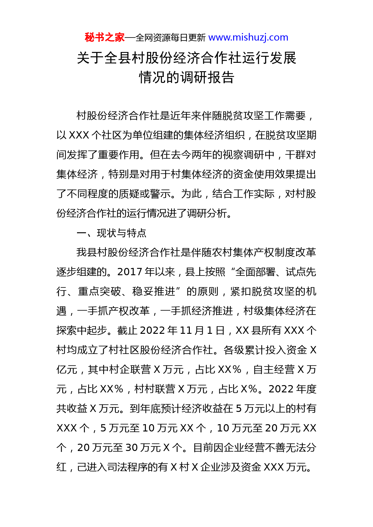 秘书之家—全网资源每日更新www.mishuzj.com关于全县村股份经济合作社运行发展情况的调研报告村股份经济合作社是近年来伴随脱贫攻坚工作需要,以XXX个社区为单位组建的集体经济组织,在脱贫攻坚期间发挥了重要作用。但在去今两年的视察调研中,干群对集体经济,特别是对用于村集体经济的资金使用效果提出了不同程度的质疑或警示。为此,结合工作实际,对村股份经济合作社的运行情况进了调研分析。一、现状与特点我县村股份经济合作社是伴随农村集体产权制度改革逐步组建的。2017年以来,县上按照“全面部署、试点先行、重点突破、稳妥推进”的原则,紧扣脱贫攻坚的机遇,一手抓产权改革,一手抓经济推进,村级集体经济在探索中起步。截止2022年11月1日,XX县所有XXX个村均成立了村社区股份经济合作社。各级累计投入资金X亿元,其中村企联营X万元,占比XX%,自主经营X万元,占比XX%,村村联营X万元,占比X%。2022年度共收益X万元。到年底预计经济收益在5万元以上的村有XXX个,5万元至10万元XX个,10万元至20万元XX个,20万元至30万元X个。目前因企业经营不善无法分红,己进入司法程序的有X村X企业涉及资金XXX万元。秘书之家—全网资源每日更新www.mishuzj.com主要特点呈现以下几个方面:(一)行政推动有力。2017年以来,XX县被国、省列为产权改革试点县后,县委、政府高度重视,县委常委会、县政府常务会多次进行专题研究,及时成立了县镇村三级产权制度改革领导机构,制定了产权制度改革实施方案和股份经济合作社章程制度、登记管理办法,在XXX个村(社区)全面开展清产核资工作,在XX个村进行了产权制度改革试点,将村集体经济发展成效列为部门和镇办脱贫攻坚的重要指标强化考核,产权制度改革和集体经济发展推进有力。XXX镇为支持XXX村股份合作社发展,将镇政府所有的闲置房屋、观光车、停车场移交由合作社运营管理,即支持了合作社发展,又解决了政府管理成本过高的问题。我县实施产权制度改革,发展集体经济的做法受到了国省市的好评,被国省列为重点推进县,省市现场会相继在我县召开。(二)政策规范有效。为了鼓励盘活集体资产、资金、资源,县上出台了《关于在全县开展农村集体产权制度改革的实施意见》,明确了农业、林业、水利、教育、国土等部门分别在承包地、林地、水利设施、闲置校产、集体房产等行业的改革职责,为集体“三资”赋权提供了良好服务;配合脱贫攻坚工作开展,制定印发了《关于农村集体经济项目资金使用管理有关事项的通知》,各级以秘书之家—全网资源每日更新www.mishuzj.com扶贫专项、苏陕协作、农业专项、县本级财政专项等名义注入的扶持资金累计为XX亿元基本解决了起步资金短缺的问题;下发了《关于加强村(社区)股份经济合作社规范化建设的通知》,进一步明确了清产核资、身份界定、股权配置、折股量化等关键环节的操作办法,规范了股东会、理事会、监事会的职能定位、制度建设、经济运行、财务监督、盈余分配、换届选举等项工作的流程,为村集体组织的组建、运行提供了及时有效的制度保障。(三)模式探索有益。围绕“3+3+3”产业体系,村股份合作社以田园综合体、观光旅游、茶叶种植、物业管理、农产品购销、光伏发电等为经营内容,采取自主经营、社企合作、定比分红等方式,进行了大胆的探索,探索出了抱团结盟的“XXX模式”,集体带动的“XX模式”,园区承载的“XX模式”,党建领航的“XX模式””,特色种植的“XXX模式”,加工带动的“XX模式”,社企合作的“XXX模式”,多业融合型的“XXX模式”以及文旅活村的“XX模式”等一批可复制借鉴的经验和模式,这些新产业、新业态、新模式的形成,开创了我县农村集体经济发展新局面。二、问题与困难近年来,在村级集体经济发展上付出的努力获得了一定成效,但也存在不少困难和问题。主要表现:秘书之家—全网资源每日更新www.mishuzj.com(一)股份合作不实。调研发现,县镇村干部基于考核的约束,出政策、建机构、给资金,强力推动改革和发展,而群众因为合作社运营资金不是自己直接出的,投资收益多是直接给了贫困户,利益不够直接并不关心改革的进程,运营的好坏。股份合作社与村民之间两张批皮的现象十分突出,股份合作社经营乃至村集体经济发展在县内表现为上级热基层凉、干部热群众凉的状态。(二)科学管理缺位。调研发现,运行的合作社中,在决策层面,有的运营项目未经过股东大会审批,有的合作项目未签订投资合同,有的未建立规范的财务帐套,大多数股份合作社还未真正成为一个独立规范的市场法人;在经营层面,自主经营的主要从事种植养殖,加工、服务业比重很小,基本上都是小规模、低层次的产业项目,活力不足,竞争力很差;在管理层面,管理人员报酬低,积极性不高,生产人员报酬是按时取酬,没有与工作量挂钩,“大锅饭”混工资的现象严重。这种决策上不规范、经营上的低层次、利益关系的不明确,严重制约着村集体经济发展的可持续。(三)管理人才短缺。合作社理事会、监事会组成人员基本上都是由村两委会成员兼任,财务、技术人员尤为稀缺,不懂经营、不敢经营、不愿经营的现象非常突出。(四)项目见效缓慢。到今年10月底,全县村股份合秘书之家—全网资源每日更新www.mishuzj.com作社实现经营收入X万元,仅占扶持资金X亿元的X
