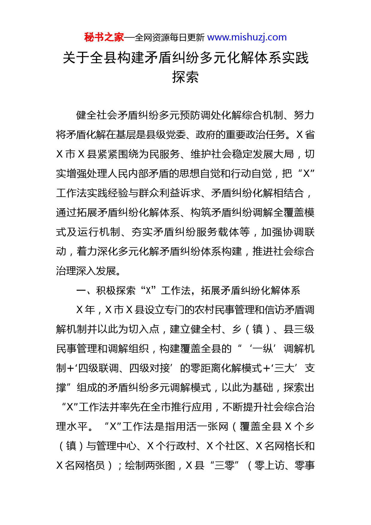 秘书之家—全网资源每日更新www.mishuzj.com关于全县构建矛盾纠纷多元化解体系实践探索健全社会矛盾纠纷多元预防调处化解综合机制、努力将矛盾化解在基层是县级党委、政府的重要政治任务。X省X市X县紧紧围绕为民服务、维护社会稳定发展大局,切实增强处理人民内部矛盾的思想自觉和行动自觉,把“X”工作法实践经验与群众利益诉求、矛盾纠纷化解相结合,通过拓展矛盾纠纷化解体系、构筑矛盾纠纷调解全覆盖模式及运行机制、夯实矛盾纠纷服务载体等,加强协调联动,着力深化多元化解矛盾纠纷体系构建,推进社会综合治理深入发展。一、积极探索“X”工作法,拓展矛盾纠纷化解体系X年,X市X县设立专门的农村民事管理和信访矛盾调解机制并以此为切入点,建立健全村、乡(镇)、县三级民事管理和调解组织,构建覆盖全县的“‘一纵’调解机制+‘四级联调、四级对接’的零距离化解模式+‘三大’支撑”组成的矛盾纠纷多元调解模式,以此为基础,探索出“X”工作法并率先在全市推行应用,不断提升社会综合治理水平。“X”工作法是指用活一张网(覆盖全县X个乡(镇)与管理中心、X个行政村、X个社区、X名网格长和X名网格员);绘制两张图,X县“三零”(零上访、零事秘书之家—全网资源每日更新www.mishuzj.com故、零隐患)重点单位创建及攻坚示意图;推行“三三”制,即每季度评选出三个先进乡(镇)、三个落后乡(镇),三名优秀网格长和三名落后网格长;设置“四色”预警,每个“三零”单位创建主体对单位的风险隐患进行颜色预警,以“绿、蓝、黄、红”分别标注“风险苗头、风险显现、风险升级、风险爆发”;做实“五个法治”,即法治扫黑、法治禁毒、法治环境、法治扶贫、法治防范。第一,“热线”受理汇民意。为进一步拓宽民意诉求渠道,健全政府快速服务机制,中共X县委、X县人民政府开通可同时接转X、X、X、X、X、县委书记县长热线等电话的政务服务热线X,各乡(镇)设立尾号为“X”的乡(镇)公开接诉电话,各行政村公开民事管理委员会主任手机号,各网格公开网格长手机号,X小时电话受理影响群众生产生活的各类民意诉求。第二,以案说法聚民情。X县聘用专业人士打造法治电视栏目——《法治在线》,采用“案情报道+专家演播厅访谈”的模式,深层剖析事件背后蕴含的法律意义和道德价值,截至X年底,累计播出X期,深受人民群众好评。第三,做实治理解民忧。遵循“政事分开民事民办”的原则,由选举出的X名网格员实行X小时坐班工作制,在村“两委”领导下专门负责农村信访矛盾排查调处、建秘书之家—全网资源每日更新www.mishuzj.com房管理等各类民事问题,从小切口入手服务群众,切实增强民事管理委员会调解纠纷的权威。二、构筑矛盾纠纷调解全覆盖模式及运行机制,激发矛盾纠纷化解活力X县积极推进“X”工作法,着力建立健全覆盖县、乡(镇)、村三级民事管理和矛盾纠纷调解组织,构建“‘一纵多横’调解机制+‘四级联调、四级对接’+‘三大’支撑”的零距离化解模式,积极化解社会矛盾纠纷,推动基层社会有效治理。第一,构筑“一纵多横”的矛盾调解模式。“一纵多横”是X县以夯实政治引领,认真落实新时代“枫桥经验”,推动社会有效治理的创新探索。“一纵”,即建立县、乡(镇)、村三级综治中心和矛盾调解中心全覆盖,“多横”涵盖了行政调解、司法调解、信访调解、人民调解、社会调解等多种调解方式。具体来说,“一纵”,以县调解中心为全县矛盾纠纷调解工作中枢,通过县综合治理中心、乡(镇)政府、村委会构建一张大网,实现调解中心全覆盖。“多横”,是行政调解、司法调解、信访调解、人民调解、社会调解等多种调解模式共同作用,形成合力,有效调解,达到有效治理的目标。第二,建立“四级联调”“四调对接”机制。“四级联调”机制,是经过网格“格长”的网格调解—民事管理秘书之家—全网资源每日更新www.mishuzj.com委员会调解—乡(镇)信访矛盾纠纷调解委员会调解—县信访服务中心调解的四级调解,变上访为下访,实行信访矛盾由下而上分级上门的调处机制。“四调对接”机制,即建立县、乡(镇)、村三级网格支撑的矛盾纠纷调解体系。按照X省和X市有关文件要求,X县积极推动县、乡(镇)和村三级矛盾调解中心规范化建设。建立行业调解机制。在国土、人社、卫生等矛盾多发行业,征地拆迁、劳资纠纷、村企矛盾、医患纠纷、交通事故、环境污染六类矛盾多发领域,成立行业调解组织或行业调解委员会。在法院和基层法庭设立诉调对接办公室和人民调解工作室。与基层民事管理人员主动对接,专门对进入司法程序的民事纠纷、一般治安案件进行调处。建立公安局与基层派出所公调对接办公室。建立乡村调解员随X接处警联合调处,公安部门将适宜调解的一般治安案件移至乡村民调组织调处,公安部门邀请民调员进驻派出所联合调处等公调对接机制。第三,强化“三大”支撑机制。运行“财政支撑+管理服务支撑+运行机制支撑”机制。县财政每年拿出X万元财政经费足额保证各项工作的必须支出,每年给各乡(镇)划拨X万元专项经费,用于调解机制正常运转。投资X万元为乡(镇)配备流动调解专用车、电脑、摄像机、照相机等装备。乡(镇)专职调解员每人每月发秘书之家—全网资源每日更新www.mishuzj.com放X元补贴,