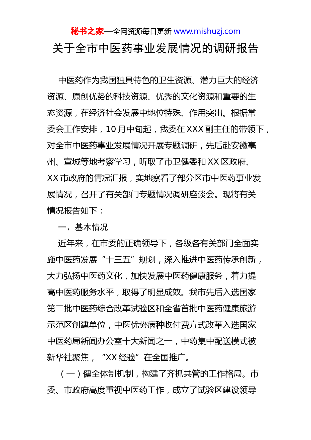 秘书之家—全网资源每日更新www.mishuzj.com关于全市中医药事业发展情况的调研报告中医药作为我国独具特色的卫生资源、潜力巨大的经济资源、原创优势的科技资源、优秀的文化资源和重要的生态资源,在经济社会发展中地位特殊、作用突出。根据常委会工作安排,10月中旬起,我委在XXX副主任的带领下,对全市中医药事业发展情况开展专题调研,先后赴安徽亳州、宣城等地考察学习,听取了市卫健委和XX区政府、XX市政府的情况汇报,实地察看了部分区市中医药事业发展情况,召开了有关部门专题情况调研座谈会。现将有关情况报告如下:一、基本情况近年来,在市委的正确领导下,各级各有关部门全面实施中医药发展“十三五”规划,深入推进中医药传承创新,大力弘扬中医药文化,加快发展中医药健康服务,着力提高中医药服务水平,取得了明显成效。我市先后入选国家第二批中医药综合改革试验区和全省首批中医药健康旅游示范区创建单位,中医优势病种收付费方式改革入选国家中医药局新闻办公室十大新闻之一,中药集中配送模式被新华社聚焦,“XX经验”在全国推广。(一)健全体制机制,构建了齐抓共管的工作格局。市委、市政府高度重视中医药工作,成立了试验区建设领导秘书之家—全网资源每日更新www.mishuzj.com小组,建立中医药工作联席会议制度,出台《XX市国家中医药综合改革试验区建设工作任务责任分工》《关于进一步发挥中医药作用做好职工基本医疗保险工作的通知》等政策,积极推动中医药工作;不断加大投入,设立1300万元的中医药“十三五”发展专项资金,近三年中医药事业费财政预算年均增长20.11%,高于卫生健康事业费13个百分点;不断优化医保政策,将中医服务价格整体上调22%,较省级标准高10%,中医收费项目由97个增加至139个;在全国率先开展中医优势病种支付方式改革和“中医日间病房”试点,探索出一条“医院得发展、医保得节省、患者得实惠、政府得民心”多方共赢的医保支付路径。(二)注重能力提升,完善了覆盖基层的服务网络。由XX市中医院牵头,与基层医疗机构合作,开展中医诊疗、医养结合和老年护理,逐步完善了“集团—医院—社区”三级医疗网络;着力提升基层服务能力,实现基层医疗机构国医堂建设全覆盖,目前,90%以上的基层医疗卫生机构提供中医药服务,基层中医药服务量占总服务量由不到30%发展到34%,其中,部分基层医疗机构达到60%以上。依托国家和省级高层次中医临床人才培养及名老中医学术经验传承项目,在全省率先实施相应的市级人才培养项目,先后评选培养国家级、省级和市级高层次中医临床秘书之家—全网资源每日更新www.mishuzj.com人才33名,各级名中医药学术经验指导老师和学术经验传承人252名,省级和市级名中医药专家111名。XX区建设了全省首家中药集中配送中心,实行中药饮片集中采购、煎制、配送、追溯,保证了中药质量,降低了饮片价格和医疗机构的运营成本;XX、乳山中药饮片配送中心正在试运行,年底前将全面投入使用。(三)创新发展模式,实现了城乡一体的诊疗服务。发挥中医药在推动建立分级诊疗模式中的优势,通过搭建医联体、引进名专家、招培高人才等途径,为群众提供高质量、低成本、便捷可及的中医药服务。目前,全市有70处基层医疗机构与市中医院建立医联体,市中医院定期选派专家坐诊,让基层群众在家门口享受到三甲医院的技术服务。通过京威中医药战略合作等多种形式,聘请名中医专家团队来威带徒,建立工作室,引进高层次中医药人才,全面提升中医药服务能力与水平。以XX区为试点,开展中医健康小镇建设,依托国医堂设置免费艾灸体验馆,建设镇、村级热敏灸体验室,有效预防和治疗常见病、慢性病,发放艾灸器具近2万余份,灸治群众10万余人次,疗效确切率达60%。(四)推动跨界融合,打造了“中医药+”的发展模式。大力挖掘中医特色优势,逐步形成以孙家疃社区卫生服务中心等为代表的中医药与医养相结合的典范,打造了“中秘书之家—全网资源每日更新www.mishuzj.com医药+医养”服务模式。大力推行中药材标准化生产,制定了15项中药材生产省级标准,全市中药材种植面积达8万余亩,其中“XX西洋参”获国家地理标志农产品认证,总产量9000吨,占全国70%以上,品牌价值116.4亿元,发展了“中医药+农业”模式。依托我市旅游资源,推动中医药和旅游相结合,建设省市级中医药健康旅游示范基地21处,获评山东省首个中医药健康旅游示范区,2018年共接待游客122万人次,实现中医药旅游收入7615万元,“中医药+旅游”特色模式初见成效。二、存在的问题尽管中医药工作取得了较大成绩,但与国家促进中医药事业发展的要求和群众的实际需求相比,与经济社会创新发展的形势要求相比,还存在不少问题,需要认真研究解决。一是中医药发展机制有待进一步完善。从财政扶持看,“十二五”以来,除XX区2019年设立中医药专项发展资金,其他区市财政均缺少中医药专项资金支持,各级财政支持力度需进一步加强。从价格形成机制看,中医药价格核定偏重“以物定价”,而不是“以技术定价”,中医医务人员的劳动价值得不到合理体现。从医保政策看,医保对于医院医保总额的核定均以历史基数为基础,而中医医疗费用历史基数低,导致医保总额低。实行定额结算的中秘书之家—全网资源每日更新www.mishuzj.com