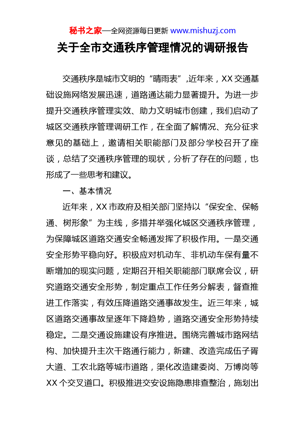 秘书之家—全网资源每日更新www.mishuzj.com关于全市交通秩序管理情况的调研报告交通秩序是城市文明的“晴雨表”,近年来,XX交通基础设施网络发展迅速,道路通达能力显著提升。为进一步提升交通秩序管理实效、助力文明城市创建,我们启动了城区交通秩序管理调研工作,在全面了解情况、充分征求意见的基础上,邀请相关职能部门及部分学校召开了座谈,总结了交通秩序管理的现状,分析了存在的问题,也形成了一些思考和建议。一、基本情况近年来,XX市政府及相关部门坚持以“保安全、保畅通、树形象”为主线,多措并举强化城区交通秩序管理,为保障城区道路交通安全畅通发挥了积极作用。一是交通安全形势平稳向好。积极应对机动车、非机动车保有量不断增加的现实问题,定期召开相关职能部门联席会议,研究道路交通安全形势,制定重点工作任务分解表,督查推进工作落实,有效压降道路交通事故发生。近三年来,城区道路交通事故呈逐年下降趋势,道路交通安全形势持续稳定。二是交通设施建设有序推进。围绕完善城市路网结构、加快提升主次干路通行能力,新建、改造完成伍子胥大道、工农北路等城市道路,渠化改造建委岗、万博岗等XX个交叉道口。积极推进交安设施隐患排查整治,施划出秘书之家—全网资源每日更新www.mishuzj.com新交通标线X万平方米。规划建成公共停车场、临时停车场XX个,道路交通建设水平和承载能力得到提升。三是交通组织优化成效初显。立足提升道路通行效率、保障出行安全,定期对重点区域开展“马路会诊”,通过设置限行、禁停、“禁左”、右转“红月”等方式,逐点制定优化方案。积极开展酒驾、超载、超员等交通违法行为集中整治,今年以来查处各类交通违法行为XXXXX起。相关做法得到上级认可,交警大队先后被表彰为全省超限超载运输治理工作优秀集体、XX市危化品运输安全管理工作先进单位,自主研发的“仪安行”APP获全省公安机关优秀移动警务应用奖。四是交通文明宣传持续开展。坚持以交通秩序整治为抓手助推文明城市创建,组织XX支志愿队伍、XXXX多名志愿者走上街头开展文明交通劝导。强化青少年交通安全教育,在实验小学建立青少年交通安全宣传教育基地,辖区交警常态化走进校园讲解安全出行常识。多渠道开辟文明城市创建工作曝光台,今年以来曝光各类交通违法行为XXXX余起。积极拓宽宣传载体,拍摄的短视频《被忽略的安全守护》获中国警务视频“公益宣传奖”。二、存在问题1.规划建设存在不足。城市道路改造工作缺乏规划层面的系统指导,路网先天不足,内部道路等级不高,东西秘书之家—全网资源每日更新www.mishuzj.com向的通行能力明显弱于南北向,城区部分路段甚至仅有双向两车道,通行效率明显欠缺。城区断头路较多,交通微循环不够通畅。S125穿城而过,常有大货车、危化品车辆过境,高峰时段交通压力集中,容易发生拥堵现象和安全事故。2.泊位资源配置不优。保守统计,全市机动车保有量已超过XX万辆,城市停车资源日益稀缺,停车难成为城市建设和管理的一大短板。城区停车资源缺乏,时空分布不均现象较为明显,现有停车资源难以满足实际需求。停车泊位的周转率相对偏低,城区一些主干道沿街停车位施划后,经常被附近的居民、商户长期占用,周转率长期处于较低水平。3.综合治理力度不均。在学校周边警力配置不够优化,城区除实验小学外,其余学校在高峰时段基本都只配备了一名辅警执勤,高峰时段人流、车流大量聚集,通行比较困难。同时,目前城区仍存在从事载客运营的非标电动三、四轮车,该部分车辆无法上牌、购买保险,加之驾驶员多为下岗职工、残疾人等群体,事故隐患、赔偿难度较大。4.文明宣传力量不强。机动车不礼让行人、摩托车和电动自行车驾驶员不佩戴头盔等交通违法行为仍然不同程度存在,社会信用体系建设不足,交通失信者的违法成本秘书之家—全网资源每日更新www.mishuzj.com低,交通违法行为屡禁不绝。文明交通志愿劝导活动时紧时松,培训管理制度不够健全,个别志愿者精神面貌不佳、责任落实不到位,文明劝导的作用发挥不够明显。三、对策建议1.坚持系统谋划,进一步破解“协调难”。一要完善管理体制。充分发挥市道路交通安全管理委员会的组织、协调、指导作用,加强对各相关职能部门的协调,进一步明确“谁来规划、谁来建设、谁来管理、谁来维护”的问题。强化职能部门的牵头指导和城发集团等国有企业的建设主体作用,努力实现方案最优化、效益最大化。二要完善规划体系。坚持以规划为统领,深入研究、科学判断城市交通的发展趋势,抓紧编制城市综合交通专项规划,推动各项规划有机衔接、深度融合。围绕完善城市路网结构,结合新城开发和老城改造,合理制定城区新建、改造道路分年度实施方案,最大限度打通断头路、畅通微循环。三要完善交安设施。尽快出台关于加强市区道路交通安全设施建设和维护工作的实施意见,明确交警部门对交安设施设计方案的审核权限,超前开展调查研究,确保交安设施与道路、学校、医院等政府投资的重大项目同步设计、同步施工、同步验收、同步使用。健全完善交安设施定期巡查、及时修复、常态保养工作机制。统筹推进主次干道中央分隔护栏安装工作,统一把关颜色、式样、高秘书之家