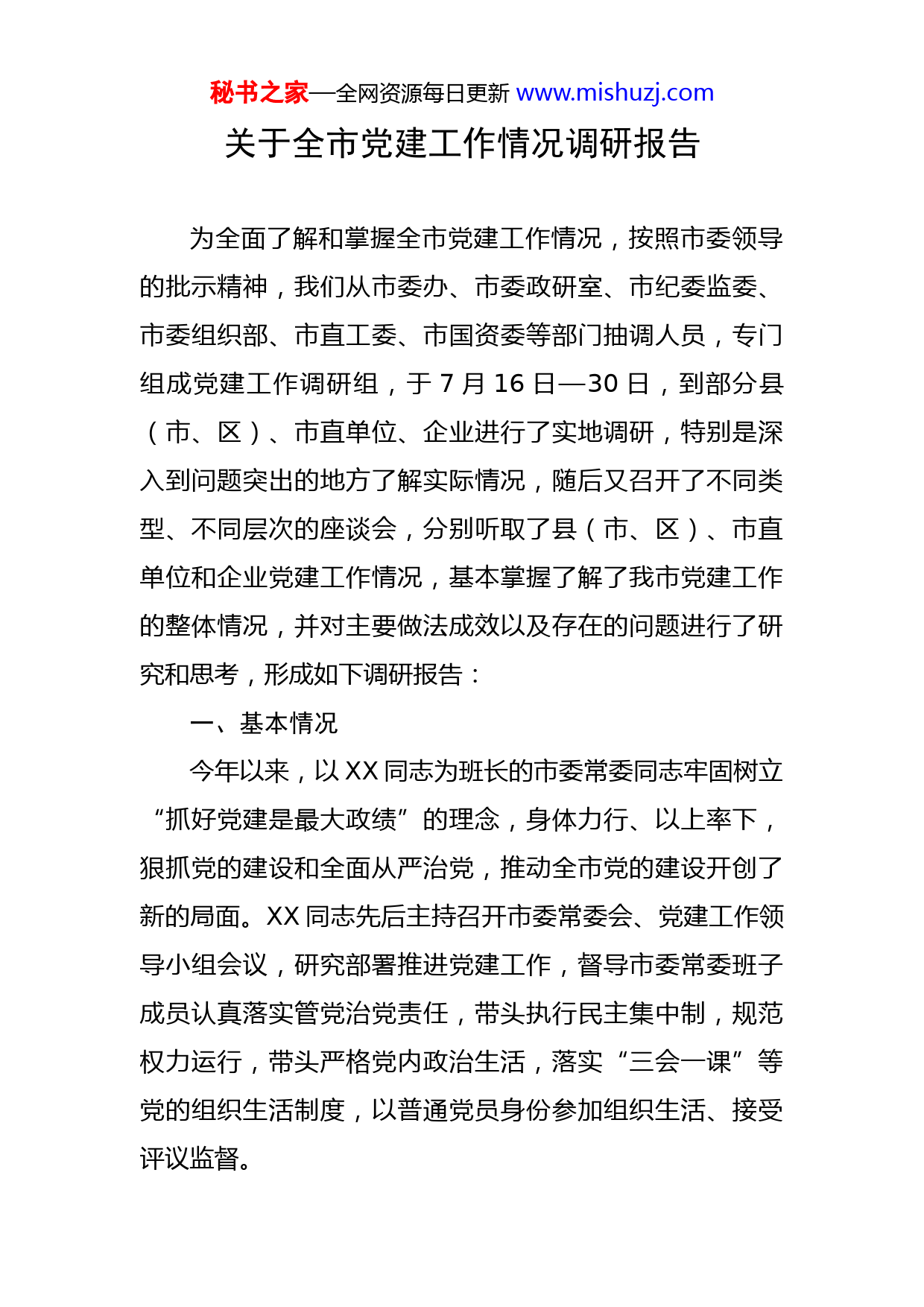 秘书之家—全网资源每日更新www.mishuzj.com关于全市党建工作情况调研报告为全面了解和掌握全市党建工作情况,按照市委领导的批示精神,我们从市委办、市委政研室、市纪委监委、市委组织部、市直工委、市国资委等部门抽调人员,专门组成党建工作调研组,于7月16日—30日,到部分县(市、区)、市直单位、企业进行了实地调研,特别是深入到问题突出的地方了解实际情况,随后又召开了不同类型、不同层次的座谈会,分别听取了县(市、区)、市直单位和企业党建工作情况,基本掌握了解了我市党建工作的整体情况,并对主要做法成效以及存在的问题进行了研究和思考,形成如下调研报告:一、基本情况今年以来,以XX同志为班长的市委常委同志牢固树立“抓好党建是最大政绩”的理念,身体力行、以上率下,狠抓党的建设和全面从严治党,推动全市党的建设开创了新的局面。XX同志先后主持召开市委常委会、党建工作领导小组会议,研究部署推进党建工作,督导市委常委班子成员认真落实管党治党责任,带头执行民主集中制,规范权力运行,带头严格党内政治生活,落实“三会一课”等党的组织生活制度,以普通党员身份参加组织生活、接受评议监督。秘书之家—全网资源每日更新www.mishuzj.com在市委常委班子率先垂范下,全市各级党组织和广大党员干部认真贯彻落实中央、省委、市委关于党建工作的一系列部署要求,把党要管党、从严治党作为重要政治任务,采取多种有效措施,严格落实管党治党责任,狠抓思想建党,统筹推进党建各项工作落实:胜利召开市第十一次党代会,圆满完成了市县乡党委换届,选人用人机制不断完善,干部队伍建设和干部教育管理监督得到加强;正风肃纪力度前所未有,“清新简约、务本责实”的作风导向得到倡树,政治生态不断净化,各级党组织和干部队伍的凝聚力战斗力进一步提升;党员干部“四个自信”更加坚定,“四种意识”不断增强,干事创业热情不断激发。总体上,全市呈现出了党风政风好转,政治生态净化,人民群众信任和支持提振的好气象,为经济社会发展提供了坚强保证。虽然我市党建工作的成绩值得肯定,但是在调研中也发现仍然存在着一些薄弱环节和问题,主要是部分党组织负责人对管党治党重要性认识不清,部分党组织组织生活不严;一些基层党组织建设还存在困难和薄弱环节等等。这些问题有的是新形势下出现的新情况,有的是长期未能得到有效解决的老问题,都需要引起充分重视和认真研究解决。二、主要做法和成效秘书之家—全网资源每日更新www.mishuzj.com(一)党员干部思想理论武装进一步强化,思想更加统一、步调更加一致。强化理论武装。以“能力作风建设年”活动为抓手,出台“1+3”学习方案,分层分类、统筹兼顾、务求实效,实现了全市40余万名党员学习教育全覆盖。用党章党规和习近平总书记重要讲话精神教育引导党员干部学思深悟,实干笃行,做合格党员。拓宽教育渠道。推出“清新简约、务本责实”特色专题教育,市、县两级分层分类开展专题培训193期,培训党员2.4万余人,推动作风建设不断好转。丰富创新载体。通过发放“口袋书”、手抄党章、知识竞赛、演讲比赛、征文、主题日、媒体宣传专栏、选树先进典型等形式营造浓厚学习氛围;充分运用微信、手机APP等新载体平台强化学习效果。严格整改落实。突出问题导向,查改合一,开展“六对照六联系六查找”,党风党纪专题民主生活会,全市各级党组织建立问题整改台账1.3万个,整改事项5.8万项。开展专项督导、专题推进,落实责任、传导压力,确保学习教育整改扎实开展、取得实效。通过学习教育,全市广大党员干部进一步加深了对党章党规和习近平总书记重要讲话精神科学内涵、精神实质的理解,坚定了中国特色社会主义道路自信、理论自信、制度自信,增强了在思想上政治上行动上同以习近平同志为核心的党中央保持高度一致的自觉性坚定性。同时,推动本地本部门发展的思秘书之家—全网资源每日更新www.mishuzj.com路也进一步清晰,推进“9+2”工作布局、实现“四高一强一率先”奋斗目标的合力得到进一步增强。(二)全面从严治党扎实推进,党内政治生活不断规范。落实“两个责任”。在全市推行主体责任清单制度;制定出台《全市县(市、区)党(工)委书记向市纪委全会述责述廉实施意见》,坚持开展述责述廉活动;落实约谈制度,共约谈市管干部X人(次);强化问责追究,查处落实主体责任不力问题X起、X人,落实监督责任不力问题X起、X人。在全市部署开展了“两个责任”示范点创建和严查“微权”腐败工作,共确定示范点168个,其中市直单位示范点10个、乡(镇、办事处)示范点72个、县(市、区)直部门和单位示范点86个,将全面从严治党的压力向基层传导。构建“大党建”工作格局。发挥各级党建工作领导小组作用,形成了党委统一领导、成员单位各负其责、市委党建办统筹协调的“大党建”工作格局。研究出台了《XX市党建工作综合考核办法(试行)》,将党建工作纳入绩效考评体系,推进全面从严治党向纵深发展。完善民主集中制。坚持“集体领导、民主集中、个别酝酿、会议决定”的原则,把民主集中制执行情况作为领导班子和领导干部考核评价的重要内容,规范党代会、党委全委会、常委会、党委(党组)会的职责权限、议事规则,构建分工合理