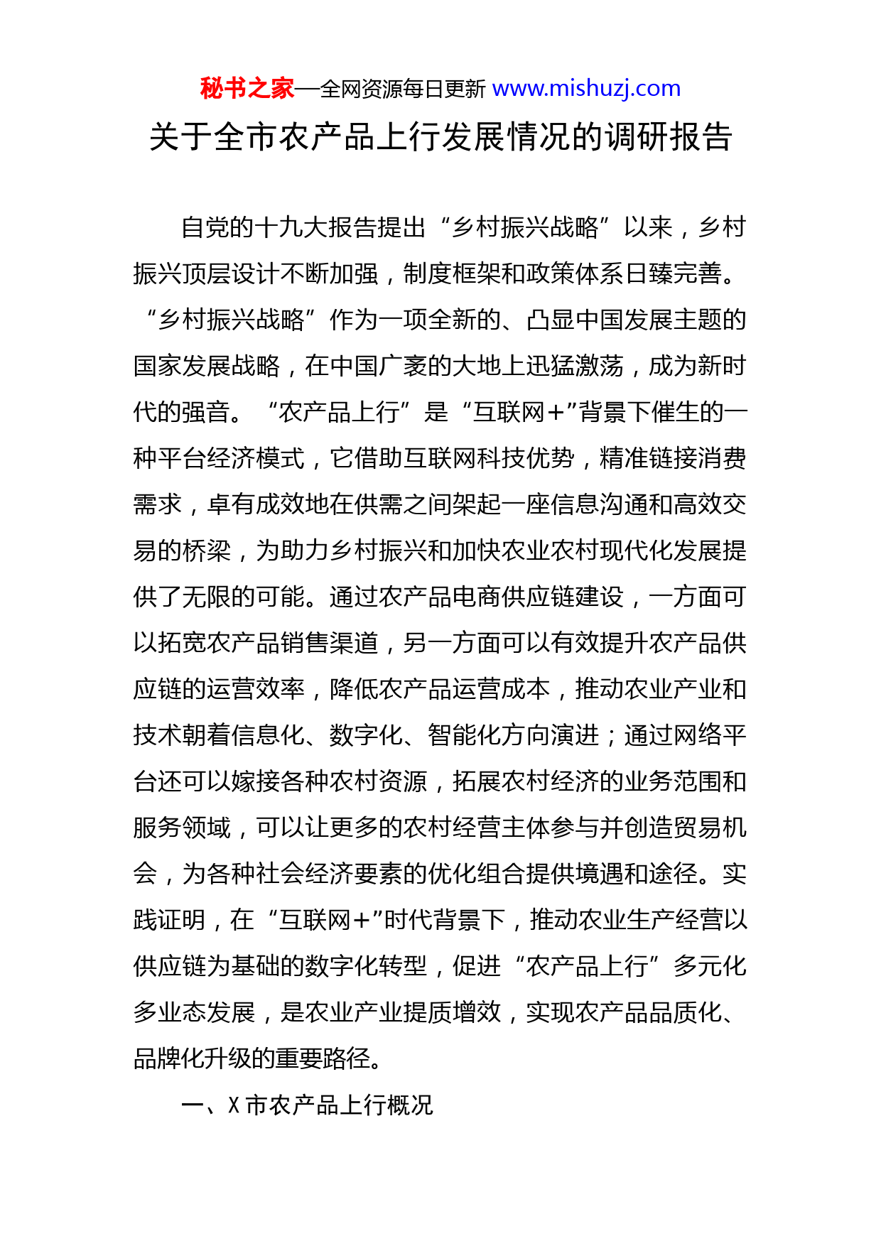 秘书之家—全网资源每日更新www.mishuzj.com关于全市农产品上行发展情况的调研报告自党的十九大报告提出“乡村振兴战略”以来,乡村振兴顶层设计不断加强,制度框架和政策体系日臻完善。“乡村振兴战略”作为一项全新的、凸显中国发展主题的国家发展战略,在中国广袤的大地上迅猛激荡,成为新时代的强音。“农产品上行”是“互联网+”背景下催生的一种平台经济模式,它借助互联网科技优势,精准链接消费需求,卓有成效地在供需之间架起一座信息沟通和高效交易的桥梁,为助力乡村振兴和加快农业农村现代化发展提供了无限的可能。通过农产品电商供应链建设,一方面可以拓宽农产品销售渠道,另一方面可以有效提升农产品供应链的运营效率,降低农产品运营成本,推动农业产业和技术朝着信息化、数字化、智能化方向演进;通过网络平台还可以嫁接各种农村资源,拓展农村经济的业务范围和服务领域,可以让更多的农村经营主体参与并创造贸易机会,为各种社会经济要素的优化组合提供境遇和途径。实践证明,在“互联网+”时代背景下,推动农业生产经营以供应链为基础的数字化转型,促进“农产品上行”多元化多业态发展,是农业产业提质增效,实现农产品品质化、品牌化升级的重要路径。一、X市农产品上行概况秘书之家—全网资源每日更新www.mishuzj.comX是传统农业大市,也是粮食加工强市。近年来,X市在强化粮食安全责任的同时持续推进农业全产业链深度融合,加快推动农业产业高质量发展,乡村产业振兴取得阶段性成效,农产品上行环节成效初显。(一)产业基础良好,现代农业全产业链服务体系初步建成X市农产品上行具备良好的产业基础,不但拥有沾化冬枣、阳信鸭梨、无棣金丝小枣、惠民蜜桃、博兴店子西红柿、邹平长山山药等很多具有一定市场影响力的特色农产品,而且涌现出中裕集团、香驰粮油、西王食品等一批在农产品生产、加工、仓储、流通、电商等领域地域优势显著、已形成规模效益的大型龙头企业。通过积极推进农业供给侧结构性改革,培育优质农产品,X农产品的质量安全水平和竞争力不断提升,形成富有特色的X农产品品牌形象。截至X年,X市拥有省级农产品品牌X个、“三品一标”产品X个、省级以上农业龙头企业X家、农业特色产业“十亿元乡镇”X个、全国“一村一品”示范村镇X家。(二)政府扶持、参与的力度加大,成效初显X市政府出台了包括资金拨付、融资帮扶、搭建电商平台、配套物流、品牌宣介等推动农产品上行的系列政策,电子商务蓬勃发展,“电子商务进农村”工程方兴未艾,秘书之家—全网资源每日更新www.mishuzj.com成为拉动全市农村消费、引导农业生产、促进农民增收的重要抓手。1.积极培育现代农业产业园和电子商务产业园,推动产业融合发展。以价值链为核心,大力发展现代农业园区和工厂化农业,围绕粮食、肉牛、冬枣等优势特色产业兴建现代农业产业园,同时积极发挥电子商务精准连接消费需求的优势,兴建现代化电商产业园区,打造集跨境电商、传统电商、电商配套服务为一体的大型一站式综合服务中心。截至X年全市共获批创建X个国家级、X个省级现代农业产业园,农产品加工转化率达X%以上。新型经营主体逐步壮大,产业融合发展初显成效。2.加大扶持力度,构建品牌推广体系。围绕X市农业发展和优势产业升级需要,X年由X市农业农村局牵头成立“三农”服务联盟,出台了包括《关于助推“好品山东”建设促进高质量发展的实施意见》等文件,推动落实品牌培育提升专项行动。通过设立农业科技发展专项资金,农业品牌奖补,搭建融资、生产信息平台,引导银行、保险、担保等发挥金融支农中介桥梁作用,整合科研、推广、新型经营主体等要素资源,推动X农业转型升级和农产品品牌化建设。以沾化冬枣为例,通过不断的品牌化构建,完成了品质的提升,提高了产品的附加值,带来了可观的品牌溢价效益。X年,沾化冬枣荣获第一批“全秘书之家—全网资源每日更新www.mishuzj.com国名特优新农产品”称号。X年成功入选第一批“好品山东”推荐名单。3.多渠道强化“农商互联”资源对接。X年由市供销社牵头,挂牌成立了“X供销电商平台”,设农粮、水果蔬菜、土特产等五大板块,开发本地农产品电商业务,强化产销衔接机制,解决农产品上行难题。同时积极推动建设农民合作社、益农信息社等互助型经济组织。目前X市已建设益农信息社X多个,涉及七个县市区,将逐步覆盖全部行政村。注册登记的农民合作社突破X万家,其中国家级示范社X家、省级示范社X家,农民合作社经营收入达X.X亿元。X中国农民合作社X强排行榜中,X市X家农民合作社入选。X市下辖的邹平市被农业农村部确定为全国农业社会化服务创新试点县。“农商互联”资源对接,提高了X市农业农村信息化水平和农村经济市场化水平,也增强了农民合作经营规范化、规模化的能力。4.积极谋划推动农产品宣传。X年以来,组织筹办了首届山东粮油产业博览会暨全国粮食产业新旧动能转换助力乡村振兴高峰论坛、第七届中国淘宝村高峰论坛、全国农民丰收节、冬枣节等系列活动,策划推动了“食域X”品牌走进山东农科等电视频道,开展了新型农业经营主体带头人经营管理培训活动,还组织有关企业和人员参加“天猫招商会”“全国农交会”“寿光蔬菜