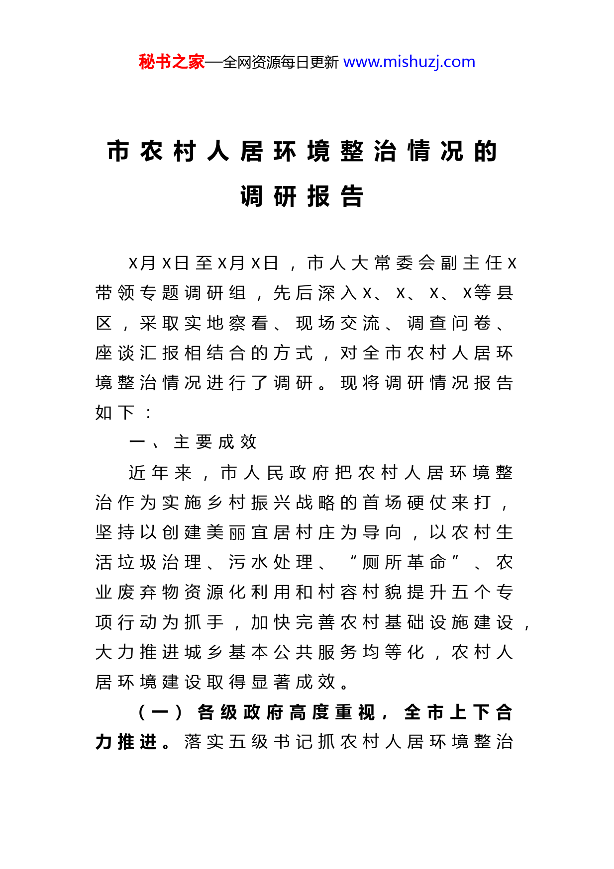 秘书之家—全网资源每日更新www.mishuzj.com市农村人居环境整治情况的调研报告X月X日至X月X日,市人大常委会副主任X带领专题调研组,先后深入X、X、X、X等县区,采取实地察看、现场交流、调查问卷、座谈汇报相结合的方式,对全市农村人居环境整治情况进行了调研。现将调研情况报告如下:一、主要成效近年来,市人民政府把农村人居环境整治作为实施乡村振兴战略的首场硬仗来打,坚持以创建美丽宜居村庄为导向,以农村生活垃圾治理、污水处理、“厕所革命”、农业废弃物资源化利用和村容村貌提升五个专项行动为抓手,加快完善农村基础设施建设,大力推进城乡基本公共服务均等化,农村人居环境建设取得显著成效。(一)各级政府高度重视,全市上下合力推进。落实五级书记抓农村人居环境整治秘书之家—全网资源每日更新www.mishuzj.com工作要求,坚持高位推动,部门联动,上下互动,形成全市一盘棋合力推进的工作格局。一是在全省率先成立了以市县两级党委、政府主要领导为组长的领导机构,市委常委会、市政府常务会多次专题研究部署,多次召开市县乡三级动员会和现场观摩推进会。二是在市农业农村局设立农村人居环境整治领导小组办公室,分别在市发改委、市住建局、市生态环境局、市农业农村局、市自然资源局设立基础设施、垃圾治理、污水治理、厕所革命、村庄规划五个专项推进办公室,建立了月督查、季排名、年度考核,以及部门包县指导、行业垂直指导、信息调度、明察暗访等多项工作制度。三是克服财政困难,强化资金保障。X年以来,累计投入资金X亿元(其中农村人居环境整治专项资金X亿元,“厕所革命”资金X亿元),中央、省级和市级投入分别达到X亿元、X亿元、X亿元。各县(市、区)也通过项目整合和预算安排,持续加大资金投入力度。乡镇、村组通过“一事一议”方式,广泛动员企业参与、农民出资和投工投劳,X县农村人居环境整治农民出资投劳占比达X%以上。秘书之家—全网资源每日更新www.mishuzj.com(二)规划统领分类施策,集中整治打造样板。一是建立农村人居环境整治规划体系,编制《X市农村人居环境整治规划导则》《X市农村人居环境整治规划总体纲要》《X市农村人居环境整治规划示范村规划》,为整治工作有序推进提供了遵循。二是完成X个行政村村庄分类,确定集聚提升类村X个、城郊融合类村X个、特色保护类村X个、搬迁撤并类村X个。三是以“八清一改”为重点,接续开展村庄清洁行动,X%以上村庄达到干净整洁村标准,以集聚提升类、城郊融合类、特色保护类村庄为重点,统筹实施绿化、美化、亮化、净化、巷道硬化工程,刚性治标,系统治本,建设重点达标村X个,示范样板村X个。全市涌现出X区赵家岸村、X县黄连河村、X县苜渠村、吴起县南沟村、X区西营村等一大批文化旅游型、产业带动型、自然山水型示范村,累计建设绿色家园村庄X个村,其中X个村庄获得“国家森林乡村”称号,X个村被命名为省级美丽宜居示范村。(三)基础设施持续完善,服务能力大幅提升。一是全市X个建制村硬化路通畅率秘书之家—全网资源每日更新www.mishuzj.com达到X%,X区被交通运输部、农业农村部、国务院扶贫办联合命名为全国“四好农村公路”示范县。累计建成农村安全饮水工程X处,受益人口X万人,集中式供水工程消毒设备安装率达到X%以上,分散工程消毒措施X%,农村饮水安全实现全覆盖。X%自然村通动力电,用户供电可靠率达X%。村庄林木绿化率X%。行政村标准化卫生室实现全覆盖。二是以资源化利用促回收,以回收促收集,以收集促分类,累计建成县级垃圾处理设施X个,镇级垃圾处理站X个、中转站X个,配备村庄保洁员X人,设立村级垃圾兑换点X处,X个行政村生活垃圾得到有效治理,占行政村总数的X%。X垃圾资源化利用处理站建成投产,X区被列入全国生活垃圾分类和资源化利用示范县。三是对全市农村X万常住户厕所现状、改厕意愿、改厕计划分类造册登记,逐户建立档案。累计改建卫生厕所X座,卫生厕所普及率达到X%。X区、X县、X和子长市分别被确定为省级“厕所革命”示范县和重点县。四是建成镇级污水处理设施X个,村级污水处理设施X个,污水治理村和有效管控村庄分别达到X个和X个,占比分别达到秘书之家—全网资源每日更新www.mishuzj.comX%和X%。X区被确定为全省农村生活污水治理示范县。五是积极推进农作物秸秆肥料化、饲料化、基料化、能量化利用,综合利用率达到X%。X县琦泉生物质发电厂和金亿来废弃地膜、反光膜加工厂建成投产,年加工处理果树废弃枝条、废弃地膜、反光膜万吨以上。(四)建管举措行之有效,特色鲜明亮点纷呈。坚持一手抓整治,一手抓巩固,探索务实整治方法,建立管护长效机制。各县(市、区)充分发挥示范村带动作用,加快推进农村人居环境整治由点上示范向面上展开,涌现出X县X等一批示范带。X区北过境沿线整治为解决城乡结合部村庄难题提供了经验。X、X探索形成“统一规划、统一设计、统一购料、统一施工、统一验收”的五统一户厕新建模式和沼气池改建模式。X镇示范推广单户、联户污水处理模式。X区积极探索农村生活垃圾源头减量化、资源化,在茶坊等村示范推广生活垃圾堆沤有机肥技术。X、X等县将村容村貌提升与古村落保护开发有机融合,一体推进田园变游园、农房变客房、农产品变旅