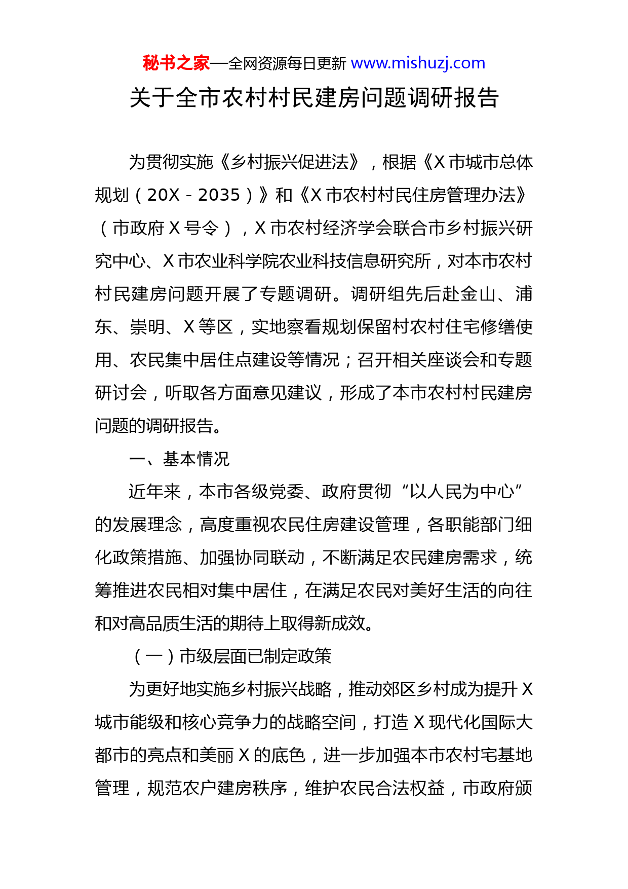 秘书之家—全网资源每日更新www.mishuzj.com关于全市农村村民建房问题调研报告为贯彻实施《乡村振兴促进法》,根据《X市城市总体规划(20X-2035)》和《X市农村村民住房管理办法》(市政府X号令),X市农村经济学会联合市乡村振兴研究中心、X市农业科学院农业科技信息研究所,对本市农村村民建房问题开展了专题调研。调研组先后赴金山、浦东、崇明、X等区,实地察看规划保留村农村住宅修缮使用、农民集中居住点建设等情况;召开相关座谈会和专题研讨会,听取各方面意见建议,形成了本市农村村民建房问题的调研报告。一、基本情况近年来,本市各级党委、政府贯彻“以人民为中心”的发展理念,高度重视农民住房建设管理,各职能部门细化政策措施、加强协同联动,不断满足农民建房需求,统筹推进农民相对集中居住,在满足农民对美好生活的向往和对高品质生活的期待上取得新成效。(一)市级层面已制定政策为更好地实施乡村振兴战略,推动郊区乡村成为提升X城市能级和核心竞争力的战略空间,打造X现代化国际大都市的亮点和美丽X的底色,进一步加强本市农村宅基地管理,规范农户建房秩序,维护农民合法权益,市政府颁秘书之家—全网资源每日更新www.mishuzj.com布了《X市农村村民住房管理办法》(市政府X号令),于20X年X月X日施行,同步印发《X市人民政府关于切实改善本市农民生活居住条件和乡村风貌进一步推进农民相对集中居住的若干意见》,为全市面上开展农村村民住房建设管理,推进农民相对集中居住工作提供了政策支撑与操作规范。根据20X年X月X日起施行的《土地管理法》以及20X年X月以来农业农村部等相关部门关于进一步加强和规范农村宅基地审批管理等相关法律规定和政策精神,20X年X月,市农业农村委会同市规划资源局、市住建委出台《关于进一步加强本市农村宅基地管理工作的通知》,就完善宅基地审批程序,强化农房建设管理,促进农民相对集中居住,保护农民合法权益提出了明确要求。(二)各区制定农民建房管理实施细则各区认真研读政策,在广泛调研和征求意见的基础上,由区农业农村委会同相关部门研究制定实施细则和配套文件,进一步明确宅基地审批和农民建房政策路径,推动市政府X号令等政策文件的贯彻落实。一是出台配套文件。X、X、X、X、X、X等区相继出台了本区村民住房建设管理规定及其实施细则。二是区镇给予补贴。在市级补贴的基础上,区镇两级积极配合,在减量化补贴、节地补贴、基础配套费用等方面给予相应补贴。例如,X区区层面秘书之家—全网资源每日更新www.mishuzj.com的补贴主要有与市X∶X配套补贴(上楼X万元/户、平移X万元/户),减量化补贴(X万/亩),实效奖励(X万元/亩)。(三)农民相对集中居住有序开展各级政府加大政策的宣传力度,加强农村村民住房建设管理,引导农村村民科学合理建房,节约利用土地资源。各区加大工作力度,稳步推进上楼平移等集中居住点位建设,以“三高两区”和规划农村居民点外零星散户作为推进重点,将符合条件的农村危旧住房改造优先纳入。一是对“三高两区”沿线农民主要采取集中上楼方式,改善农民住房条件。各涉农区围绕从20X年至2022年完成X万户农民的集中居住目标,开展农民相对集中居住推进工作,到目前为止,已经签约X.X万户。二是在一些地区采取平移集中方式,建设质量较高的农村新社区。各涉农区集中建设或者引导将农民将房屋翻建到规划居住区,如X区X镇X村农民集中居住、X区X镇X村“X”、X区X镇X村农民集中居住等,农村村民住房建设典型引路作用得到较好发挥。三是部分地区探索农村宅基地依法自愿有偿退出方式。对一些已在城镇有商品住房的农户,按照依法自愿有偿原则,引导其放弃宅基地使用权。例如崇明区积极支持基层探索农村宅基地有偿退出机制,加快落实配套资金,农村宅基地有偿退出逐步推开,20X-2021年X个涉秘书之家—全网资源每日更新www.mishuzj.com农乡镇完成农村宅基地有偿退出X户,补偿金额X.X亿元,核减宅基地面积X.X亩,减量化面积X.X亩。(四)农民住房条件逐步改善市、区相关部门加强精细化的分类指导、分类施策,统筹做好乡村规划,积极探索“一镇一策”“一村一策”,直至“一户一策”,解决农民住房问题。据市农业农村委统计,自市政府X号令实施到20X年X月,全市X个涉农区共审批农村宅基地建房申请X户,其中改建X户,新建X户,翻建X户。一是统筹规划。在综合考虑上位规划要求、村庄发展条件和镇村意愿的基础上,各区不断优化完善城市开发边界外村庄布局,因地制宜引导农户向保留(保护)村归并。如X区以组团式布局为主的规划设计方案,每个涉农乡镇选定X-X个周边配套设施与人居环境较好的集中居住点,全区共规划X个点,同时选定了X镇、X镇、X镇、X镇和X镇等实物置换区。二是开展农民建房试点。通过统一规划、统一布局、统一设计、统一图纸、统一管理等,同步实施乡村规划师和乡村建筑师制度,注重公共服务配置,加强整体环境营造。房屋建设由农民自行委托施工队伍开展实施或统一建设,既保障保留村内村民建房的合法权益,又保证建设合规、村貌统一。部分保留村如X区X镇X村、X区X镇X村等,通过平移建设,村民已经住进了新房。三是试点开展宅基地相关信秘书之家—全网资源每日更新www.mishuzj.com息的补充调查。为摸清宅基地底数,逐步