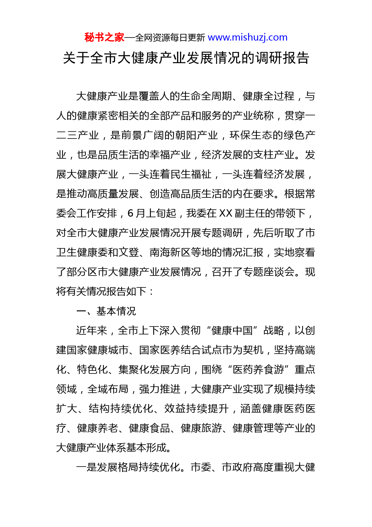 秘书之家—全网资源每日更新www.mishuzj.com关于全市大健康产业发展情况的调研报告大健康产业是覆盖人的生命全周期、健康全过程,与人的健康紧密相关的全部产品和服务的产业统称,贯穿一二三产业,是前景广阔的朝阳产业,环保生态的绿色产业,也是品质生活的幸福产业,经济发展的支柱产业。发展大健康产业,一头连着民生福祉,一头连着经济发展,是推动高质量发展、创造高品质生活的内在要求。根据常委会工作安排,6月上旬起,我委在XX副主任的带领下,对全市大健康产业发展情况开展专题调研,先后听取了市卫生健康委和文登、南海新区等地的情况汇报,实地察看了部分区市大健康产业发展情况,召开了专题座谈会。现将有关情况报告如下:一、基本情况近年来,全市上下深入贯彻“健康中国”战略,以创建国家健康城市、国家医养结合试点市为契机,坚持高端化、特色化、集聚化发展方向,围绕“医药养食游”重点领域,全域布局,强力推进,大健康产业实现了规模持续扩大、结构持续优化、效益持续提升,涵盖健康医药医疗、健康养老、健康食品、健康旅游、健康管理等产业的大健康产业体系基本形成。一是发展格局持续优化。市委、市政府高度重视大健秘书之家—全网资源每日更新www.mishuzj.com康产业发展,编制了《XX市医养健康产业发展规划(2018—2022年)》,制订印发了《关于培育壮大千亿级产业集群的实施意见》,重点培育“新医药与医疗器械、海洋生物与健康食品、时尚与体闲运动产品、康养旅游”等健康产业集群,建立了一个工作专班推进、一个三年行动计划引领、一批示范企业项目带动、一个智库支持、一只基金支持的“五个一”协调推进体系,梳理细分医药医疗器械、海洋食品、钓具等优势产业链,由市领导担任“链长”,促进产业链、供应链、创新链“三链协同”。市委、市政府主要负责同志多次召开会议、现场调研大健康产业,并作为外出考察、双招双引的重要内容亲自推动;市直相关部门立足职能,发挥优势,全力推动大健康产业集群发展。二是产业集群不断壮大。坚持产业为王、项目为王、企业为王,大力发展大健康产业集群,形成了梯次递进成长、集约集聚发展的良好格局。初步测算2020年全市医养健康产业增加值413.05亿元,占GDP的比重达到13.69%,已成为全市国民经济的重要支柱产业。从产业集群看,新医药与医疗器械产业集群拥有规上企业34家,实现营业收入668.55亿元;时尚与休闲运动产品产业集群拥有规上企业198家,实现营业收入298.23亿元;海洋生物与健康食品产业集群拥有规上企业227家,实现营业收秘书之家—全网资源每日更新www.mishuzj.com入415.79亿元;康养旅游产业集群实现旅游总收入494.31亿元。三是优势产业特色鲜明。XX区位优势独特,生态环境得天独厚,工业体系业门类齐全,城市宜居指数位居全国前列。基于良好基础和多重优势,全市大健康产业现出快速发展、优势突出、特色鲜明的良好态势,形成了以高端医疗器械为主的健康产品制造优势产业,上市公司发展到4家,拥有中国驰名商标25个、地理产品标志98个,涌现出一批单项冠军、隐形冠军、瞪羚企业,威高集团位居全国医疗器械和医用耗材行业首位,吉威医疗药物涂层支架国内市场占有率全国第一,钓具产量占全国70%、全球60%,刺参产量占全国25%,西洋参产量占全国70%,牡蛎产量居全国首位,XX已成全国最大的海洋食品、钓具生产基地。四是健康服务稳步发展。XX作为全国38个健康城市试点之一,拥有各类医疗卫生机构2563个,其中三级甲等医院7家;实有床位19365张,建立电子健康档案223.55万份,形成了发展一体化、服务同质化、管理网格化的卫生健康服务新格局。拥有养老机构158家,开放养老床位3.57万张,千名老年人拥有养老床位48张,位居全省首位,护理型床位占比达到48.7%,高于全省平均水平5.7个百分点,那香海文旅度假小镇、南海体育休闲特秘书之家—全网资源每日更新www.mishuzj.com色小镇等高端精品康养项目相继建成,所辖区市全部获批全省医养结合示范先行区市,市域一体、医养结合、跨界融合的健康养老服务体系基本形成。养老保险、医疗保险在全国率先实现城乡统筹、市域统筹。着力培育医疗康复、温泉疗养、休闲旅游等养生产品,推出特色康养旅游精品线路,丰富康养旅游产品供给,全市A级景区数量发展到50家,成为全省唯一入选首批中医药健康旅游示范区创建单位的地级市。2020年疫情防控期间,成功举办了年度规模最大的乒乓球全国锦标赛和世界杯比赛,XX铁人三项世界赛已成为中国铁三运动标杆赛事。五是内生动力持续增强。深入实施创新驱动发展战略,按照“围绕产业链部署创新链、围绕创新链布局产业链”的要求,把大健康科技创新列入科技创新专项规划,围绕高端医疗器械、现代生物医药、公共医疗卫生、海洋健康食品等领域,依托全市“1+4+N”创新平台体系,组织开展行业技术攻关和技术合作,加快推进科技创新。目前,全市拥有涉大健康产业高等院校7所、省级以上研发平台103家,获批省级以上科技奖项18项,迪沙药业等3个成果获国家科技进步奖,威高“多孔腔境手术机器人”打破达芬奇机器人全球垄断地位,高性能医疗器械创新中心成为首家省级制造业创新中心。组建城市医疗保健集团,引进中国医科大学航空总医院等高端医疗机构,市级秘书之家—全