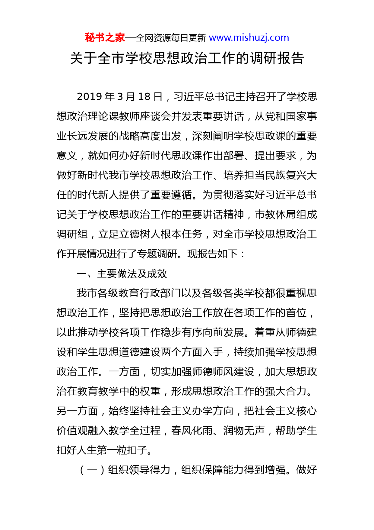 秘书之家—全网资源每日更新www.mishuzj.com关于全市学校思想政治工作的调研报告2019年3月18日,习近平总书记主持召开了学校思想政治理论课教师座谈会并发表重要讲话,从党和国家事业长远发展的战略高度出发,深刻阐明学校思政课的重要意义,就如何办好新时代思政课作出部署、提出要求,为做好新时代我市学校思想政治工作、培养担当民族复兴大任的时代新人提供了重要遵循。为贯彻落实好习近平总书记关于学校思想政治工作的重要讲话精神,市教体局组成调研组,立足立德树人根本任务,对全市学校思想政治工作开展情况进行了专题调研。现报告如下:一、主要做法及成效我市各级教育行政部门以及各级各类学校都很重视思想政治工作,坚持把思想政治工作放在各项工作的首位,以此推动学校各项工作稳步有序向前发展。着重从师德建设和学生思想道德建设两个方面入手,持续加强学校思想政治工作。一方面,切实加强师德师风建设,加大思想政治在教育教学中的权重,形成思想政治工作的强大合力。另一方面,始终坚持社会主义办学方向,把社会主义核心价值观融入教学全过程,春风化雨、润物无声,帮助学生扣好人生第一粒扣子。(一)组织领导得力,组织保障能力得到增强。做好秘书之家—全网资源每日更新www.mishuzj.com学校思想政治工作的关键在各级教育行政部门的组织领导。我市各县(市、区)教体局对此都很重视。如XX县教体局、XX县教体局成立了学校思想政治工作领导组,在党组书记空缺的情况下,党组副书记任组长,班子成员任副组长,有关股室负责人为成员。各学校也成立了相应的组织,一级抓一级,层层抓落实。各乡镇中心学校、县直各学校也分别成立了由一把手任组长的领导小组,统筹、协调和指导中小学生思想道德建设工作。各县(市、区)教体局先后制定了相关规范性文件,指导各乡镇中心学校、县直各学校开展德育工作。(二)制度建设完善,教师业务能力得到提升。各级各类学校都十分注重以制度建设推动教师师德水平全面提升。如:XX县把学校思想政治工作作为教育工作的重要组成部分,年初有布置、年中有督查、年终有考评,同时把学校思想政治工作与教育大局稳定有机结合起来,定期召开形势研判会,民主生活会等;XX县各学校健全政治学习制度,制定了行政例会制度、教师例会制度、班主任例会制度、党员例会制度。以制度的形式保证教师和党员干部的政治学习;XX县规定校长做到“四个一”,即每学期对学生进行一次专题德育讲座、每月听评一节思想品德课、每月召开一次学生思想状况分析会、每学年组织一个德育研究课题,同时建立学校德育工作责任制,切实履行德育秘书之家—全网资源每日更新www.mishuzj.com第一责任人的工作职责;XX县各学校都建立健全了行政例会制度、教师例会制度、班主任例会制度、国旗下讲话制度、师德建设考评奖励制度;柘城县健全政治学习制度,每周都有固定的教师政治和业务学习时间,并把思想政治表现与教师考核、评优结合起来,与绩效工资挂钩;示范区积极推进“两学一做”学习教育,制定了详细的理论学习计划,做到季有部署、月有主题、周有安排;XX区注重抓好党员、入党积极分子和普通教师思想教育和学习教育。学校坚持每周一次的常规政治学习和思想教育,坚持“三会一课”制度,同时把党员和教职工的政治思想教育和管理纳入学校工作的重要议事日程;XX区将学校思想政治教育纳入学校党建和意识形态工作内容,把思想政治课程开展情况作为重要指标,纳入中小学校督导考评体系。(三)活动载体多样,思政教育成效得到增强。学校对学生的思想政治教育除了课堂教学外,更多地体现在学校教育的方方面面,每学年开展中学生文艺汇演、国庆歌咏比赛、元旦师生联谊会等重大节日庆祝活动,全体师生进一步弘扬爱国主义、集体主义、社会主义精神。如:XX县以优秀传统文化进校园、我们的节日、快乐星期天等活动培养学生的家国情怀,开展宗教与教育相分离活动净化教育环境;XX县指导各学校少先队开展一系列活动,耕耘好学生这第一块红色阵地,在全县范围内开展习惯养成教秘书之家—全网资源每日更新www.mishuzj.com育,法制进校园活动,构建书香校园活动等;XX县连续多年来,在全县中小学校开展了轰轰烈烈的感恩教育活动,每学期给家长印发“致家长的一封信”和“感恩教育”活动信息反馈表,逐步探索建立感恩教育的长效机制;XX县努力探索校园文化与思想政治工作相结合的育人途径,开展“少年传承中华传统美德”“英雄在我心中”“寻访红色足迹”综合实践等系列教育活动;示范区组织开展继承红色基因、弘扬雷锋精神等教育;XX区在学生中间广泛开展各种形式的主题教育活动,以丰富的校园文化活动,带动学生健康成长;利用XX本地的历史文化,开发系列具有XX特色的思想政治教育资源,突出了学校思想政治工作的特色。这些内容丰富以学生参与为主的活动,都是主题鲜明的学校思想政治教育载体,各级教育行政部门和学校,很好地以形式多样的活动为载体,不断创新学校思想政治教育。(四)教学内容丰富,意识形态阵地得到巩固。在思政课教学和思政课教师培养上,许多地方也有好的做法。XX学院总结出了“一多四结合,章章节节有收获”的课堂教学特色,构建了“讲、听、读、写、看、说