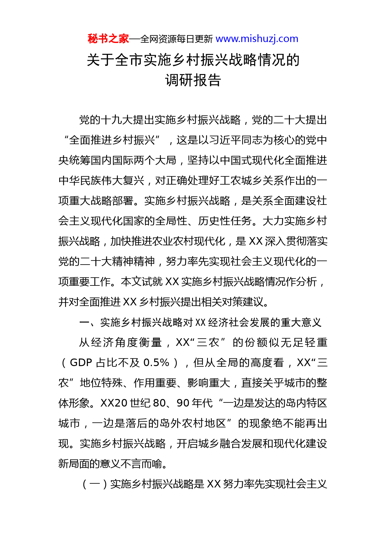 秘书之家—全网资源每日更新www.mishuzj.com关于全市实施乡村振兴战略情况的调研报告党的十九大提出实施乡村振兴战略,党的二十大提出“全面推进乡村振兴”,这是以习近平同志为核心的党中央统筹国内国际两个大局,坚持以中国式现代化全面推进中华民族伟大复兴,对正确处理好工农城乡关系作出的一项重大战略部署。实施乡村振兴战略,是关系全面建设社会主义现代化国家的全局性、历史性任务。大力实施乡村振兴战略,加快推进农业农村现代化,是XX深入贯彻落实党的二十大精神精神,努力率先实现社会主义现代化的一项重要工作。本文试就XX实施乡村振兴战略情况作分析,并对全面推进XX乡村振兴提出相关对策建议。一、实施乡村振兴战略对XX经济社会发展的重大意义从经济角度衡量,XX“三农”的份额似无足轻重(GDP占比不及0.5%),但从全局的高度看,XX“三农”地位特殊、作用重要、影响重大,直接关乎城市的整体形象。XX20世纪80、90年代“一边是发达的岛内特区城市,一边是落后的岛外农村地区”的现象绝不能再出现。实施乡村振兴战略,开启城乡融合发展和现代化建设新局面的意义不言而喻。(一)实施乡村振兴战略是XX努力率先实现社会主义秘书之家—全网资源每日更新www.mishuzj.com现代化的必然要求。习近平总书记在致XX经济特区建设40周年贺信中,从党和国家事业发展全局的高度出发,希望XX勇立潮头、勇毅前行,努力率先实现社会主义现代化。我们要努力率先实现的社会主义现代化,必须是城乡一体化发展、实现共同富裕的现代化。换言之,没有农业农村的现代化,就没有整个XX的现代化。当前,XX岛内地区、岛外主城区的城市化和公共服务建设均已达到较高水平,而广阔农村地区经济和社会建设发展水平总体仍偏低。XX努力率先实现社会主义现代化,短板在“三农”,重点难点也在“三农”,实施乡村振兴战略,加快推进农业农村现代化已是当务之急。(二)实施乡村振兴战略是纵深推进XX跨岛发展的重要抓手。2002年,时任福建省委副书记、省长的习近平在XX调研时提出“跨岛发展”战略和“四个结合”,即“提升本岛与拓展海湾相结合,城市转型与经济转型相结合,农村工业化与城市化相结合,突显城市特色与保护海湾生态相结合”的重要要求。实施乡村振兴战略,特别是以产业兴旺、生态宜居、生活富裕为指引,加快推进产业发展、基础设施、社会事业等项目实施,促进城乡公共资源均衡配置,对推进城市格局跨岛拓展、产业结构跨岛优化、公共服务跨岛覆盖、人文内涵跨岛提升、生态文明跨岛建设,纵深推进城乡融合和岛内外一体化,必将发挥强秘书之家—全网资源每日更新www.mishuzj.com有力的推动作用。(三)实施乡村振兴战略是加快提升XX城市整体竞争力的有力手段。城市间的竞争最终是整体竞争力强弱的反映,XX的整体竞争力不单来自岛内成熟度高的城市,也来自岛外新城和广阔的农村地区。当前紧要的是致力加快提升农村地区的发展水平,绝不能让农村农业拖了城市发展的后腿。实施乡村振兴战略,通过发展都市现代农业千亿产业链,实施乡村振兴千亿投资工程,推进乡村产业融合发展,可以打造新的经济增长极,加快推动经济发展壮大;通过高质量推进乡村建设行动,提升农村建设品质,改善农村人居环境,促进城乡公共服务普惠共享,加强和改进乡村治理,能够大力改变“发达的城市、落后的农村”的旧格局,加快提升城市整体形象。经济的发展壮大和城市整体形象的显著提升,必将大幅增进XX的整体竞争力。二、XX大力实施乡村振兴战略的主要举措和成效2018年以来,XX以习近平新时代中国特色社会主义思想为指导,全面贯彻党的十九大、十九届历次全会和二十大精神,坚持农业农村优先发展,按照“产业兴旺、生态宜居、乡风文明、治理有效、生活富裕”20字总要求,大力实施乡村振兴战略,统筹推进XX个省市试点示范村建设,在全省率先实施打造XX条示范动线,串点连线成片,秘书之家—全网资源每日更新www.mishuzj.com加快推进农业农村现代化。(一)抓经济支撑,产业兴旺提质效。统筹做好疫情防控与稳产保供工作,全力确保蔬菜、畜禽等主要农副产品供应充足。持续推进现代农业招商,成立现代农业招商办,制定投资手册和招商地图,建立“6+3+3”机制(6个行政区+象屿、夏商、金圆等3个集团+市农业农村局、市海洋发展局、市市政园林局等3个市直部门),推动签约项目尽快落地动工、开工项目尽快建成投产。加快推进种业创新发展,规划建设闽台农业融合发展(种子种苗)产业园、两岸种子种苗业创新中心、XX现代水产种业园,引进培育一批种子种苗企业。做优做强现代种养业,鼓励支持粮食、蔬菜、茶叶、食用菌、花木种养,推广龙眼、荔枝、蜜柚等水果高接换种,新建、改扩建生猪养殖场。做大做强农产品加工业,扶持壮大农业产业化龙头企业,鼓励农副产品加工企业增资扩产。深入推进乡村产业融合发展,推动农村电商建设和农业物联网发展,促进农产品流通服务业转型升级。大力发展乡村旅游,精心打造休闲观光农业,推动“农业+文化+旅游”相融合。近几年来,产业兴旺充分展现,现代农业持续提质增效,产业规模持续壮大,2022年XX现代农业产业集群跻身千亿产业链群,产值达到XXXX亿元。(二)抓绿化美化,生态宜居展新貌。高质量推进宜秘书之家—全