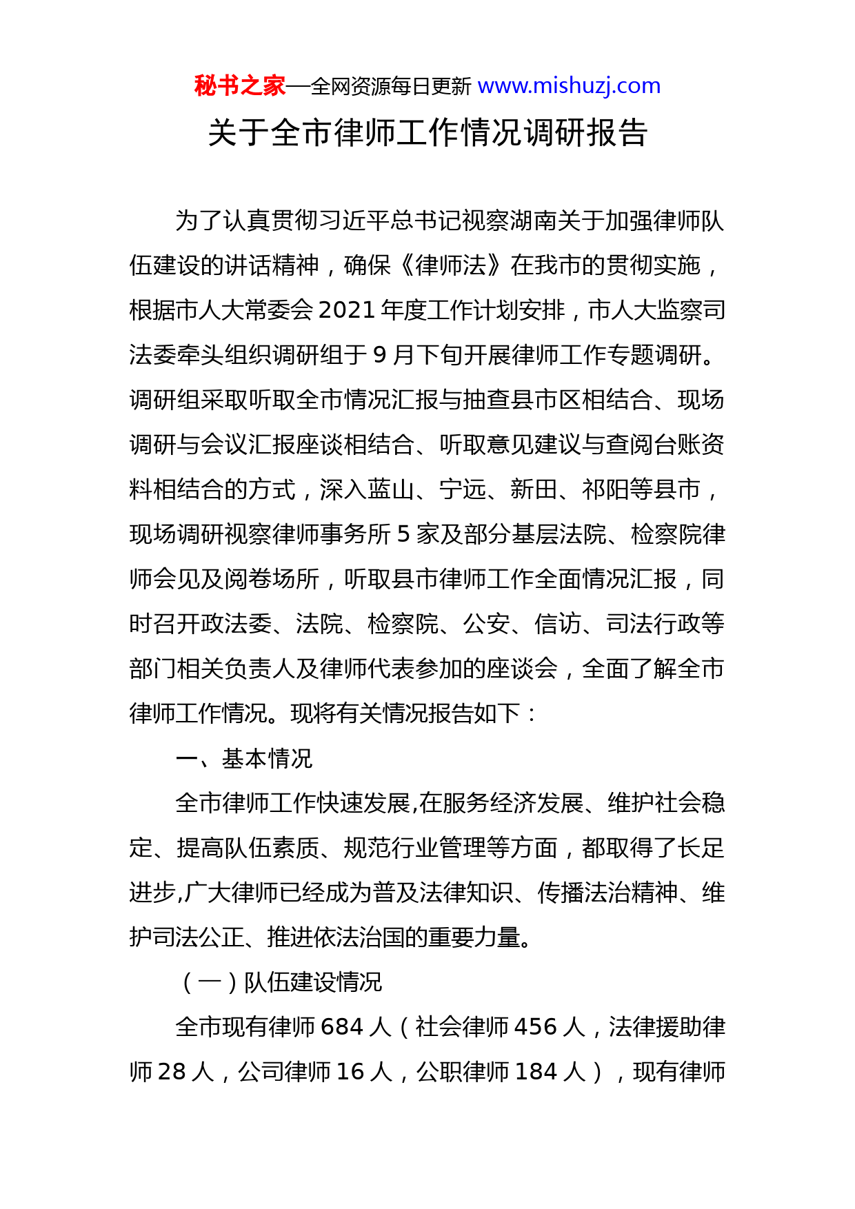 秘书之家—全网资源每日更新www.mishuzj.com关于全市律师工作情况调研报告为了认真贯彻习近平总书记视察湖南关于加强律师队伍建设的讲话精神,确保《律师法》在我市的贯彻实施,根据市人大常委会2021年度工作计划安排,市人大监察司法委牵头组织调研组于9月下旬开展律师工作专题调研。调研组采取听取全市情况汇报与抽查县市区相结合、现场调研与会议汇报座谈相结合、听取意见建议与查阅台账资料相结合的方式,深入蓝山、宁远、新田、祁阳等县市,现场调研视察律师事务所5家及部分基层法院、检察院律师会见及阅卷场所,听取县市律师工作全面情况汇报,同时召开政法委、法院、检察院、公安、信访、司法行政等部门相关负责人及律师代表参加的座谈会,全面了解全市律师工作情况。现将有关情况报告如下:一、基本情况全市律师工作快速发展,在服务经济发展、维护社会稳定、提高队伍素质、规范行业管理等方面,都取得了长足进步,广大律师已经成为普及法律知识、传播法治精神、维护司法公正、推进依法治国的重要力量。(一)队伍建设情况全市现有律师684人(社会律师456人,法律援助律师28人,公司律师16人,公职律师184人),现有律师秘书之家—全网资源每日更新www.mishuzj.com事务所45家。其中,市司法局直属律师事务所14家(在零陵区8家、冷水滩区6家),律师190人。从职称看,正在执业的一级(正高)律师1人,二级(副高)律师3人,三级(中级)律师5人,四级律师84人。从学历看,硕士研究生以上学历39人,约占9%;本科学历350余人,约占80%。从年龄结构看,30岁以下的青年律师只有44名,不到10%。全市律师队伍共有党员168名,45家律师事务所均指派了党建指导员,实现了党组织全覆盖,共建立26个党支部,其中独立党支部20个,联合党支部6个。市直律师事务所有党支部9个,其中独立党支部6个,联合党支部3个。(二)工作开展情况2020年,全市律师办理各类诉讼案件10445件,其中刑事诉讼及代理4760件,民事诉讼代理5272件,行政诉讼代理413件;办理各类非诉讼法律事务6000余件,法律援助案件1956件,为1399家政府机关、企事业单位、企业等担任法律顾问,律师服务收费6000余万元。1.紧贴中心工作,积极开展专项法律服务。市、县两级司法局积极对接发改委、财政和工业园区等部门,组建律师服务团,建立律师服务联系点,开展民营企业法治体检,对全市重点扶持的园区实行全程跟踪法律服务,积极宣讲秘书之家—全网资源每日更新www.mishuzj.com法律政策、解答法律咨询,参与项目立项、招投标、合同谈判、合同起草、审查等法律事务,避免或减少法律风险。2020年,共宣讲法律政策113次,解答法律咨询1039人次,参与合同谈判325次,起草和审查合同1061件。建立律师事务所与工商联所属商会联系合作机制,全市工商联、商会与律师事务所通过合作举办法律讲堂、法务培训、座谈交流等活动,帮助民营企业培养法律专业人才,加强专职法务团队建设,提升民营企业家和经营管理人员法商素养,提高企业守法合规经营能力,深化了全市民营企业法律服务工作,为进一步打造法治化营商环境,促进民营经济健康发展作出积极贡献。目前,30家律师事务所与28家工商联或商会建立合作机制。2.跟进依法行政,大力推行法律顾问制度。制定出台了《永州市推行法律顾问制度和公职律师公司律师制度实施办法》,就建立健全党政机关法律顾问、公职律师制度和国有企业法律顾问、公司律师制度作出了具体规定,推动全面形成与我市经济社会发展和法律服务需求相适应的法律顾问、公职律师、公司律师制度体系。市本级政府及所属主要部门已基本设立法律顾问和公职律师,共有法律顾问39人、公职律师50人。法律顾问、公职律师参与重大决策、起草重要文件、列席重要会议、参加诉讼仲裁,在预秘书之家—全网资源每日更新www.mishuzj.com防法律风险、化解矛盾纠纷、维护社会稳定等方面发挥了重要作用。一村(社区)一法律顾问工作从“有没有”向“好不好”提质升级。如宁远县已将村(社区)法律顾问工作经费纳入财政预算,对61个村给予5000元的经费补助。江永县按10个重点村补助5000元,其余村补助1000元的标准拨给村(社区)法律顾问工作经费。2020年,287名律师、178名法律工作者共为3297个村和社区提供法律咨询7000余人次,开展法制讲座100余场,帮助起草、修改村规民约500多个,有力促进了基层依法治理。3.不断与时俱进,创新参与涉法涉诉信访。我市组织律师开展参与涉法涉诉信访工作始于2007年,为全省首创,并得到省委政法委的肯定和推介。近年来,在参与涉法涉诉信访的方式和内容上,我们进行了不断探索和创新。一是建立陪同领导信访值班制度。近三年,我局安排了100余名政治坚定、业务精湛、道德良好的律师,每周一轮流到市信访局陪同市级领导开展信访接待工作,解答信访群众的法律咨询。各县区也建立了类似制度。二是参与信访包案化解工作。部分信访积案,指定律师陪同包案领导做好工作。如蒋双生、郁康明、郑安陵等律师作为市人大新、老代表,多次参与市人大负责处理的重大、疑难、复杂信访案件的论证、说服、解答等化解工作,效果明显。秘书之家—全网资源每日更新www.mishuzj.com三是参与重大疑难信访案件听证。对于重大疑难信访案件、按程序需要举行听证的,信访部门和政法部门均聘请律师作