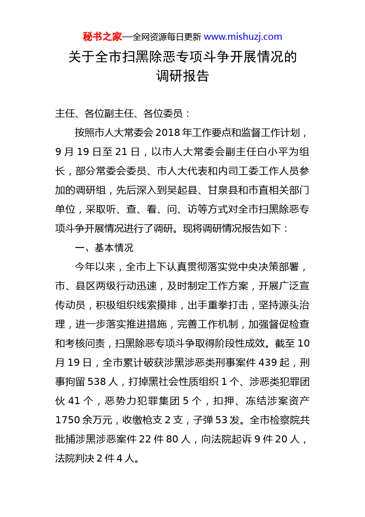 秘书之家—全网资源每日更新www.mishuzj.com关于全市扫黑除恶专项斗争开展情况的调研报告主任、各位副主任、各位委员:按照市人大常委会2018年工作要点和监督工作计划,9月19日至21日,以市人大常委会副主任白小平为组长,部分常委会委员、市人大代表和内司工委工作人员参加的调研组,先后深入到吴起县、甘泉县和市直相关部门单位,采取听、查、看、问、访等方式对全市扫黑除恶专项斗争开展情况进行了调研。现将调研情况报告如下:一、基本情况今年以来,全市上下认真贯彻落实党中央决策部署,市、县区两级行动迅速,及时制定工作方案,开展广泛宣传动员,积极组织线索摸排,出手重拳打击,坚持源头治理,进一步落实推进措施,完善工作机制,加强督促检查和考核问责,扫黑除恶专项斗争取得阶段性成效。截至10月19日,全市累计破获涉黑涉恶类刑事案件439起,刑事拘留538人,打掉黑社会性质组织1个、涉恶类犯罪团伙41个,恶势力犯罪集团5个,扣押、冻结涉案资产1750余万元,收缴枪支2支,子弹53发。全市检察院共批捕涉黑涉恶案件22件80人,向法院起诉9件20人,法院判决2件4人。秘书之家—全网资源每日更新www.mishuzj.com(一)领导高度重视,反应行动迅速。全国扫黑除恶专项斗争开始后,市委、市政府立即召开专题会议进行研究和安排部署,对照中、省扫黑除恶专项斗争工作要求,确定了全市扫黑除恶专项斗争工作目标(一年大见成效、两年健全机制、三年天蓝地净),成立了扫黑除恶专项斗争工作领导小组及其办公室,具体负责组织实施工作,县区和市直各成员单位也相应成立了工作机构。市委、市政府联合印发了《延安市开展扫黑除恶专项斗争实施方案》,市扫黑办制定了《扫黑除恶专项斗争组织机构及工作制度》,建立了线索排查、信息报送、案件分流、案件会商等工作制度,保障扫黑除恶斗争专项工作有效实施和有序推进。市法院、检察院、公安局采取引进来、走出去等办法对干警进行业务培训,提高基层干警执法办案水平。市检察院推行“七快”联动工作机制和重大黑恶势力犯罪案件会商机制,市法院对黑恶案件办理采取“五定一包”(定办案人员、定督办领导、定办案期限、定目标责任、定奖惩办法),提高办案质效。(二)广泛开展宣传,营造打击声势。全市各级各部门把扫黑除恶专项斗争宣传融入业务工作,在新闻媒体刊发、在乡村社区、集贸市场、机关学校等重点部位张贴《关于开展扫黑除恶专项斗争的通知》《关于依法严厉打击黑恶势力违法犯罪的通告》等文件,在人流密集区、重秘书之家—全网资源每日更新www.mishuzj.com点领域、重点行业开展资料、图文、标语等宣传,发放宣传资料7万余册,悬挂宣传横幅3000余条,设立宣传专栏300多个。延安日报和延安电视台开设了专栏,及时跟进,宣传报道扫黑除恶斗争进展,先后刊发宣传稿件500余篇。各县区组织政法干警、网格员、包片干部入户走访,面对面宣传,引导群众积极举报犯罪线索,取得了一定的效果。专项斗争工作开展以来,市扫黑办举报专线收到群众举报线索147件,办结131件,市公安机关收到群众举报线索387件,办结301件,11名犯罪嫌疑人主动投案自首。(三)把握工作重点,出手重拳打击。针对扫黑除恶打击重点工作要求,全市公检法、信访部门对近年来的治安案件、职务犯罪案件、轻微刑事案件、涉众型经济案件、信访案件进行了全面排查梳理;其他扫黑除恶工作成员单位结合各自职责重点加强了对旅游景区、油煤气区、车站、建筑工地、仓储物流、商场市场、学校医院等重点领域的摸排。基层各单位在摸排时坚持源头治理,对黑恶犯罪容易滋生的村组社区、商场市场、景区油区等的重点区域、重要领域开展了“十个没有”平安创建活动,一方面发动专门力量打击村霸、油霸、沙霸、路霸等各类黑恶势力,一方面发动行业部门、干部群众自查整改问题隐患,做实矛盾纠纷化解、防控体系建设、治安问题整治、秘书之家—全网资源每日更新www.mishuzj.com安全隐患整改、重点人群管理等基础性工作,强力挤压黑恶势力滋长的空间。对于摸排出和中省转办的涉黑涉恶犯罪,全市政法机关采取高压态势,出手重拳,严厉打击,成功打掉了一批涉黑涉恶犯罪团伙,惩治了犯罪,维护了社会的稳定和群众的权益。为支持黑恶犯罪线索挖掘和打击工作,市财政部门安排了专项奖励资金,调动广大群众举报线索的积极性和民警办案的主动性。(四)建立工作机制,夯实工作责任。一是建立了市政法部门打击重大黑恶势力犯罪案件联动工作机制和会商机制。截至9月,共召开相关部门联席会议5次。二是建立了市扫黑除恶领导小组负责人联系包抓机制。各包县区领导负责经常性对县区工作进行指导、调研督导、解决工作中的突出问题。三是建立了督导督查工作机制。市扫黑办每周向市委汇报工作进展情况,对各县区一周工作进行通报,适时对重点县区、重点案件进行督导。先后发出案件督办函80份,对县区报结的4起案件退回补充侦查。市委督查室对扫黑除恶进展情况每月一汇总,安排专项督查。市扫黑除恶领导小组成立5个督查组,每半年进行一次全面督导,面对面听取基层群众意见建议。四是市县区两级均建立了党政领导履职工作台账并不定期组织督查,推动各级领导干部将扫黑除恶工作责任落到实处。五是加强考核问
