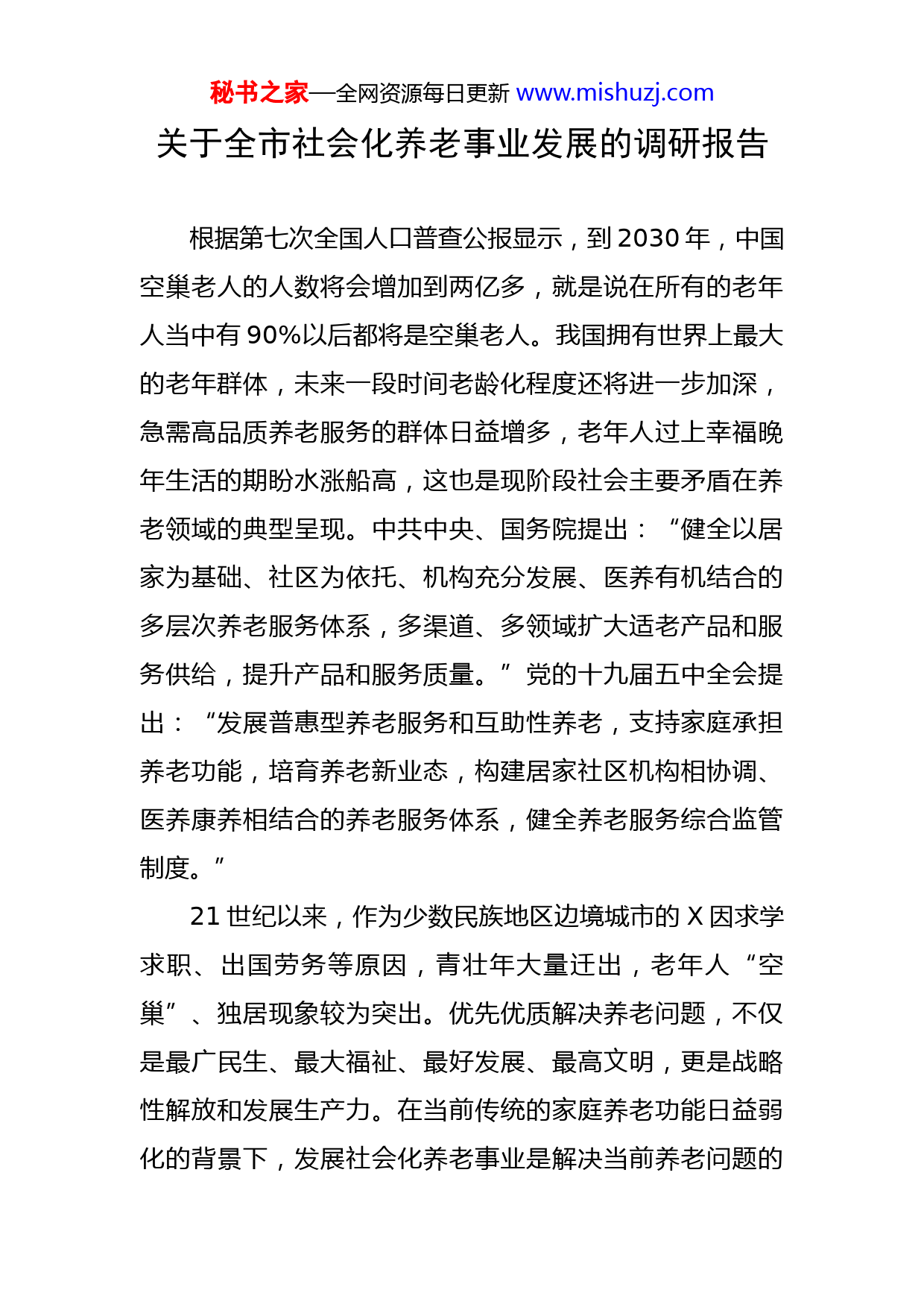 秘书之家—全网资源每日更新www.mishuzj.com关于全市社会化养老事业发展的调研报告根据第七次全国人口普查公报显示,到2030年,中国空巢老人的人数将会增加到两亿多,就是说在所有的老年人当中有90%以后都将是空巢老人。我国拥有世界上最大的老年群体,未来一段时间老龄化程度还将进一步加深,急需高品质养老服务的群体日益增多,老年人过上幸福晚年生活的期盼水涨船高,这也是现阶段社会主要矛盾在养老领域的典型呈现。中共中央、国务院提出:“健全以居家为基础、社区为依托、机构充分发展、医养有机结合的多层次养老服务体系,多渠道、多领域扩大适老产品和服务供给,提升产品和服务质量。”党的十九届五中全会提出:“发展普惠型养老服务和互助性养老,支持家庭承担养老功能,培育养老新业态,构建居家社区机构相协调、医养康养相结合的养老服务体系,健全养老服务综合监管制度。”21世纪以来,作为少数民族地区边境城市的X因求学求职、出国劳务等原因,青壮年大量迁出,老年人“空巢”、独居现象较为突出。优先优质解决养老问题,不仅是最广民生、最大福祉、最好发展、最高文明,更是战略性解放和发展生产力。在当前传统的家庭养老功能日益弱化的背景下,发展社会化养老事业是解决当前养老问题的秘书之家—全网资源每日更新www.mishuzj.com必选项。一、X市社会化养老事业发展基本情况(一)X市人口老龄化现状根据第七次全国人口普查公报显示,20X年至20X年,X市X岁及以上老年人口从XX人增加到XX人,老年人口占总人口的比重从X.X%上升至X.X%,其中失能、半失能老人占老年人口的X.X%,空巢老人占老年人口的%。与全国平均水平相比,其人口老龄化程度更高、发展进程更快,面临的养老形势更加严峻,这是对当前X老龄化现状的基本判断。(二)X市社会化养老事业发展情况近年来,应对老年人口越来越多、老龄化问题越来越严峻的形势,X市多措并举,推动社会化养老事业发展,取得了明显的成效。1.养老机构服务能力大幅提升20X年以来,X市大力推进养老院建设,扩大机构接待规模,服务能力提档升级。截至2021年X月底,X市共有X家具备一定规模的养老院,包括7家公办养老院和X家民办养老院。养老院总面积比20X年增加XX平方米,增幅达X.X%;养老服务床位合计X张,比20X年增加X张,增幅达X.X%。一是加强公办养老机构的托底保障作用。目前X家公秘书之家—全网资源每日更新www.mishuzj.com办养老机构总建筑面积XX平方米,共有X张床位(其中护理床位X张),入住院民数X人,多为农村五保户及城市三无人员。二是提升民办养老机构的特色服务能力。民办养老院多数是由个人自筹资金开办,经营管理各有特色,呈现出多种多样的运营模式,X家民办养老院总建筑面积XX平方米,共有X张床位(其中护理床位X张),入住院民数X人。三是大力推进机构医养结合养老服务。不但完成X家养老院均与医疗机构签订医养结合协议,还探索创“公办民营”新模式,先后将新英安镇农村社会福利服务中心和新春化镇农村社会福利服务中心分别承包给X市锡和医院和X市利康医院,创建集因病托老、老年康复及护理于一体的“医养结合”养老机构,成为我省公办民营试点。2021年X月正式投入运营的X中医医院(朝医)医养结合项目,是一所集临床医疗、康复治疗、养老服务于一体的具有鲜明中医特色的二级甲等中医医院,其养老部分建筑面积XX平方米,床位X张,大大提高了X市机构养老服务层次。2.社区居家养老服务举措不断创新一是社区养老服务功能显著加强。新建X家具备规模的社区居家养老服务中心,X个城市社区日间照料室全覆盖,每个社区配备X名居家养老协理员,负责调查居民养老需求、受理申请和上门服务。日间照料室提供日间照秘书之家—全网资源每日更新www.mishuzj.com料、医疗保健、文化娱乐、精神慰藉等服务;为困难老人实施“二帮一”救助服务方案,即由两名社区工作人员携手通过居家养老服务、城市低保、医疗救助等方式帮助一名困难老人的基本生活;部分社区启动智能服务体系,为独居老人发放“一键通”手机,为老人提供助餐、助洁、助医等服务。二是农村居家养老幸福大院普及到行政村。到目前共建农村居家养老幸福大院X所,为农村老年人提供餐饮、文化娱乐等居家养老基本服务,为农村空巢和独居老人带来生活气息。3.养老扶持政策措施不断完善一是政府制定和完善了《关于深入开展尊老爱老助老工作的决定》《X市老年人优待规定暂行管理办法》。二是将全市贫困老人和高龄老人列入社会救助,养老社会福利由补缺型向适度普惠和均等化转变。本市内公园、旅游景点、公益性文化设施、公共体育健身场所和城市公共汽车等对X岁以上老年人实行免费;各公立医疗机构免收X岁以上老人的普通门诊挂号费和诊疗费;为X岁以上老年人每月发放生活补贴。三是X市城市福利院成为全州唯一的长期护理保险试点单位并稳定运营,为享受此保险政策的老人每月节省一千多元护理费。二、X市社会化养老事业发展面临的困难和问题(一)居家养老服务能力较弱秘书之家—全网资源每日更新www.mishuzj.com当前和未来,因家庭小型化和子女外出等原因,就多数老人而言,不可能再依靠传统的家庭养老,社会化养老模式中居家养老将是绝大多数老人愿意选择的模式,因此居家养老成为现阶段养老事
