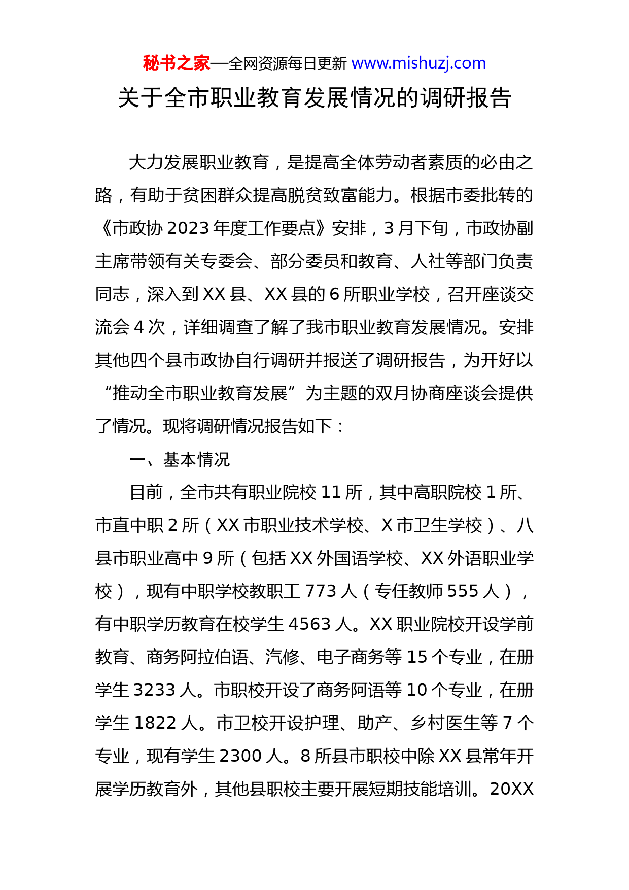 秘书之家—全网资源每日更新www.mishuzj.com关于全市职业教育发展情况的调研报告大力发展职业教育,是提高全体劳动者素质的必由之路,有助于贫困群众提高脱贫致富能力。根据市委批转的《市政协2023年度工作要点》安排,3月下旬,市政协副主席带领有关专委会、部分委员和教育、人社等部门负责同志,深入到XX县、XX县的6所职业学校,召开座谈交流会4次,详细调查了解了我市职业教育发展情况。安排其他四个县市政协自行调研并报送了调研报告,为开好以“推动全市职业教育发展”为主题的双月协商座谈会提供了情况。现将调研情况报告如下:一、基本情况目前,全市共有职业院校11所,其中高职院校1所、市直中职2所(XX市职业技术学校、X市卫生学校)、八县市职业高中9所(包括XX外国语学校、XX外语职业学校),现有中职学校教职工773人(专任教师555人),有中职学历教育在校学生4563人。XX职业院校开设学前教育、商务阿拉伯语、汽修、电子商务等15个专业,在册学生3233人。市职校开设了商务阿语等10个专业,在册学生1822人。市卫校开设护理、助产、乡村医生等7个专业,现有学生2300人。8所县市职校中除XX县常年开展学历教育外,其他县职校主要开展短期技能培训。20XX秘书之家—全网资源每日更新www.mishuzj.com年全市中职毕业生1666人,已就业1566人,就业率为94%。二、主要工作近年来,我市各级党委政府认真落实习近平总书记在全国职业教育工作会议上的重要批示精神,全面贯彻国务院和省委、省政府决策部署,立足我职业教育发展实际,调整发展思路,完善政策规定,强化工作措施,加大推进力度,全市职业教育事业不断发展、不断进步。一是发展政策有保障。市委市政府制定出台了《关于加快现代职业教育的意见》《关于支持XXX职业学院建设的决定》,XX县制定了《实施方案》,发展职业教育的指导思想明确、总体目标清晰、重点突出、措施有力,有效保障了职业教育发展。二是专业设置有特色。职业院校、7所中职学校、2所外国语职校重视专业建设,开设的各类专业符合当前各行各业劳务人才需求,特别是商务阿语、电子商务、电焊、牛肉拉面等专业,体现民族特色,多年来一直深受社会各界的青睐,前景十分广阔。三是教学条件有改善。新组建的XX市职业技术学校与现代职业技术学院共享师资和实训资源,占地149亩、建筑面积1.2万平方米。近三年XX县分别投入700多万元、457.6万元发展职业教育。去年,XX县投入520万元、XX县投入129万元改善了县职校教学条件。四是助推脱贫有成效。各县市职校以秘书之家—全网资源每日更新www.mishuzj.com建档立卡贫困劳动力为重点,配合人社、扶贫等部门,举办电工电焊、牛肉拉面、保安家政等各类短期培训,仅去年全市共培训贫困劳动力10615人。五是教育模式有创新。各县市职校创新办学模式,把职业教育与控辍保学有机结合起来,普遍开办职普结合强化班,让辍学学生重返校园,既学习文化课程又掌握劳动致富技能。据统计,目前全市参加职普培训的学生有名。六是民办职校有前景。民办教育机构从无到有、从少到多,在职业教育发展中发挥着重要作用,主要承担着汽车驾驶、家政服务、计算机应用、家电维修、月嫂、保安、砖雕、葫芦雕刻等市场所需专业的技能培训和资格培训,增强了职业教育发展的活力。三、制约因素总体上看,我市职业教育逐年发展、逐步提升,在增强劳动者整体素质、培养实用技术人才、促进创业就业方面发挥了应有的作用。但与全国职业教育工作会议要求、新时代职业教育发展的形势、全市各项事业发展对人才的需求相比,仍然处于底子薄、基础弱、培训规模小、教学能力低、管理服务滞后、发展缓慢的现状,主要突出存在“四个”方面的制约因素,“两个”薄弱环节。“四个”制约因素:一是择业观念制约。长期以来,社会、家长、学生对职业教育始终存在偏见,宁肯读普高、上重点、考秘书之家—全网资源每日更新www.mishuzj.com名校,不愿接受职业教育的思想观念一直得不到扭转,致使各县市职业学校职普比失衡,生源严重不足。如永靖县职校仅有学历教育生47名,XX县职校常年招生为零,是制约职业教育发展最根本的因素。二是教学能力制约。全市中职学校的555名专任教师中,“双师型”教师172名、仅占31%。两所市直中等职校专任教师年龄偏大、结构老化,县市职校专任教师非常短缺,即使生源充足也难以承担教学任务。三是办学条件制约。除XX县外,其他四个县职校无实验实训室、无实训设备、无住宿就餐条件、无必要的运动场所,且XX县至今没有公办职校,仅能开展一些短期劳动技能培训,不具备开展学历教育的硬条件。四是发展空间制约。目前市职校与现代职业学院一体化办学,而现代职业学院已达到5000人的设计规模,难以容纳职业中职学生,中职招生只能压缩,无法扩招。市卫校占地只有13亩,每年招生500人左右,办学规模小,办学空间有限,制约着学校的进一步发展。两个薄弱环节:一是现有职教资源的开发利用不够。由于择业观念、办学理念、教学条件、办学能力等多种原因,县市级绝大部分职业学校、培训中心,除了承办一些季节性、短期性的劳务培训,基本上处于闲置状态,资源浪费比较普遍。二是管理服务工作比较滞后。各级各部门尽管十分重视职业教育发展,但全面贯彻落实全国职业教