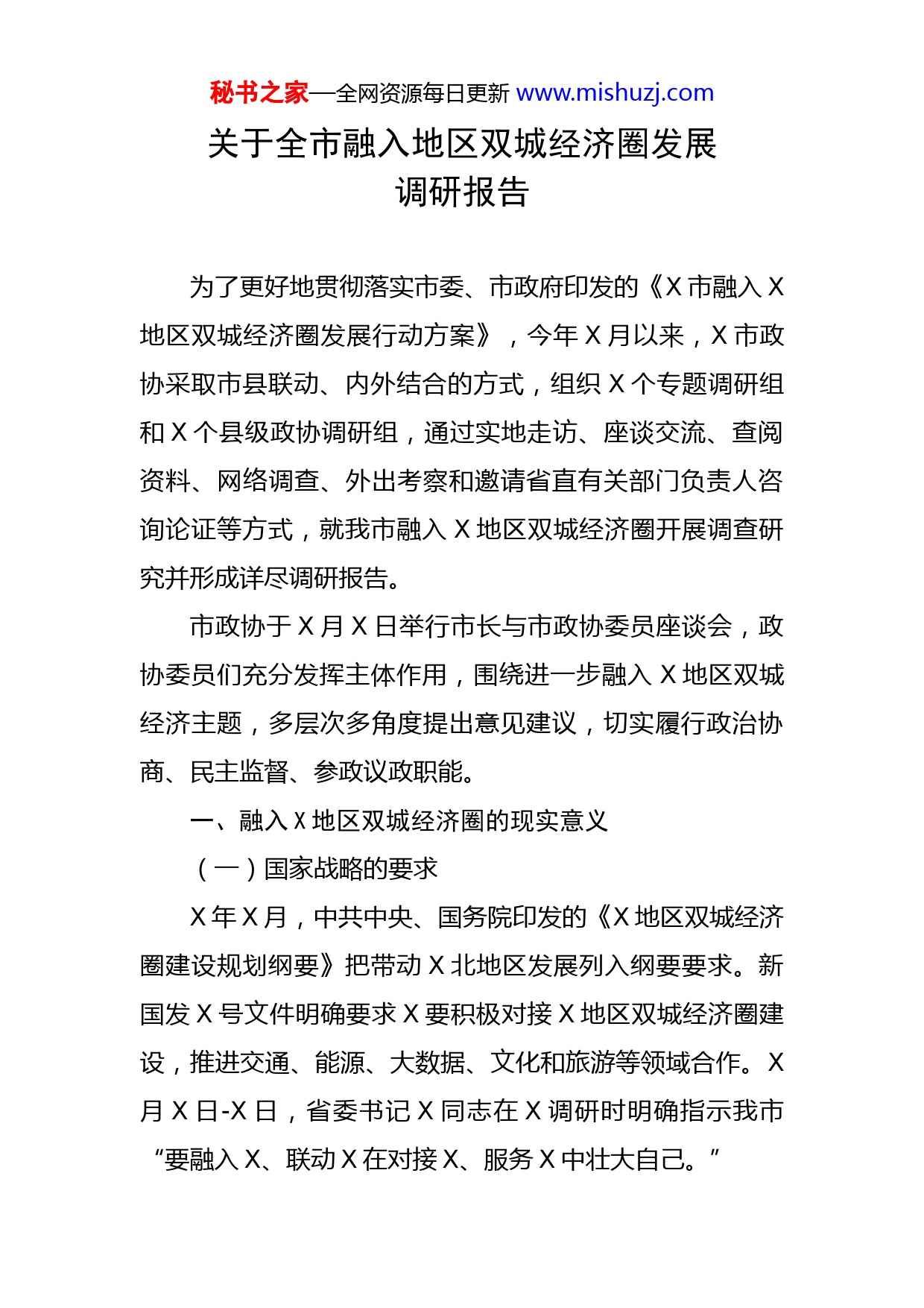 秘书之家—全网资源每日更新www.mishuzj.com关于全市融入地区双城经济圈发展调研报告为了更好地贯彻落实市委、市政府印发的《X市融入X地区双城经济圈发展行动方案》,今年X月以来,X市政协采取市县联动、内外结合的方式,组织X个专题调研组和X个县级政协调研组,通过实地走访、座谈交流、查阅资料、网络调查、外出考察和邀请省直有关部门负责人咨询论证等方式,就我市融入X地区双城经济圈开展调查研究并形成详尽调研报告。市政协于X月X日举行市长与市政协委员座谈会,政协委员们充分发挥主体作用,围绕进一步融入X地区双城经济主题,多层次多角度提出意见建议,切实履行政治协商、民主监督、参政议政职能。一、融入X地区双城经济圈的现实意义(一)国家战略的要求X年X月,中共中央、国务院印发的《X地区双城经济圈建设规划纲要》把带动X北地区发展列入纲要要求。新国发X号文件明确要求X要积极对接X地区双城经济圈建设,推进交通、能源、大数据、文化和旅游等领域合作。X月X日-X日,省委书记X同志在X调研时明确指示我市“要融入X、联动X在对接X、服务X中壮大自己。”秘书之家—全网资源每日更新www.mishuzj.com(二)自我发展的机遇X地区双城经济圈是继京津冀、长三角、粤港澳大湾区后,国家确认的第四大经济圈,X年地区生产总值近X万亿元。对X未来发展有着重要的辐射带动作用。(三)率先融入的优势X历史上曾属X管辖,悠久的历史渊源让两地人员、经贸往来自古有之。今天的X正好处于X经济区和X中经济区之间的“传接带”,在充分接受X辐射带动等方面,X具有得天独厚的优势和机遇。二、融入X地区双城经济圈的发展现状分析(一)融入X地区双城经济圈态势良好X年以来,X两地签署了一系列的合作协议,工业能源合作日益密切,农业产销合作逐步深化,康养旅游合作不断拓展,商贸流通合作初见成效,社会事业合作多点开花。(二)存在的主要问题与X之间缺乏长效合作机制,连接X地区的交通设施建设还不能满足融入发展需要,与X合作产业的技术层次普遍偏低,X农产品大规模进入X地区市场的局面还未形成,与X高等院校、科研院所和各类开发机构合作不深等等。三、融入X地区双城经济圈的措施建议秘书之家—全网资源每日更新www.mishuzj.com立足省域副中心城市战略定位,按照“以我为主、主动融入,优势互补、合作共赢,产业优先、项目推动,完善机制、提质增效”的总体思路,以实现区域经济一体化为目标,以挤进“产业链”、融入“供应链”、服务“生活链”为着力点,主动参与X地区双城经济圈生产生活分工,承接X地区双城经济圈辐射带动效应,分享X地区双城经济圈发展红利,推动我市与X地区双城经济圈共同发展。(一)发挥资源优势,推动工业经济一体提升借力X技术优势,在铝及铝精深加工上求突破。瞄准X要素短板,在提升能源产业效能上求突破。借鉴X发展经验,在创新合作模式上求突破。力争用五年左右时间,在以煤炭、页岩气、风力、光伏为代表的能源产业,以铝、钛为代表的新材料产业,以汽摩、军工、电子信息为代表的先进制造业,以白酒、辣椒、茶叶为代表的绿色食品工业等方面与X地区建立起深度合作关系。(二)发挥生态优势,推动农业产业一体发展针对X市民需求,建设一批绿色蔬菜保供基地。不断增强X农产品抢占X地区市场的话语权、主动权。围绕X产业发展,建设一批特色产品保供基地。首要聚焦X地区千亿级火锅产业集群市场需求,做优做强X辣秘书之家—全网资源每日更新www.mishuzj.com椒融入X地区火锅产业链,另外要重点建设好茶叶、大米、X等产业基地。(三)发挥通道优势,推动交通物流一体互联借助X南下需求,加快基础设施建设。将已纳入规划的连接X地区的铁路公路项目尽快启动实施。加快水务、能源、信息等基础设施建设。发挥X通道优势,推进物流体系建设。抢抓西部陆海新通道建设机遇,深化X新欧物流体系建设,推动X两地物流园区和项目互联合作。(四)发挥气候优势,推动康养旅游一体升级紧盯X旅游市场,实现旅游提档升级。进一步发挥我市“红、白、绿、古”四色旅游特色,宣传“健脑、洗胃、亮眼、润肺”功能,在巩固提升红色旅游的基础上,推出“美酒游”“田园游”“山地游”“生态游”“古镇游”等新业态,使X成为X地区自驾游主要目的地。开拓X康养市场,打造康养产业集群。针对X来X消费群体的养生养老需求,引入X地区养老市场主体,争取X地区三甲医院在我市打造康养中心,加快培育壮大医药产品等产业集群,出台政策支持毗邻地区打造创建一批特色旅游示范乡镇、民宿示范点,建成区域生态旅游产业链。(五)发挥人文优势,推动社会民生一体共享共享X教育资源,实现教育全面提升。与X地区在教秘书之家—全网资源每日更新www.mishuzj.com育领域开展全方位合作。委托X高校培养适宜X主导产业发展的技术型、复合型人才。创造条件吸引X高校、优质民营学校到X开设分校。加强三地职校合作,推动异地就业技能培训结果和人才资质互认。共享X医疗资源,深化医疗领域合作。争取X优质医疗卫生机构到X设立分支机构或与我市现有医疗机构结成医联体。继续加强与X大学华西医学中心、X大学等知名医科院校的合作,建立跨区域公共卫生服务资源合作共享机制与日常业务学术交流机制。共享X人才资源,促进成果就近转化。