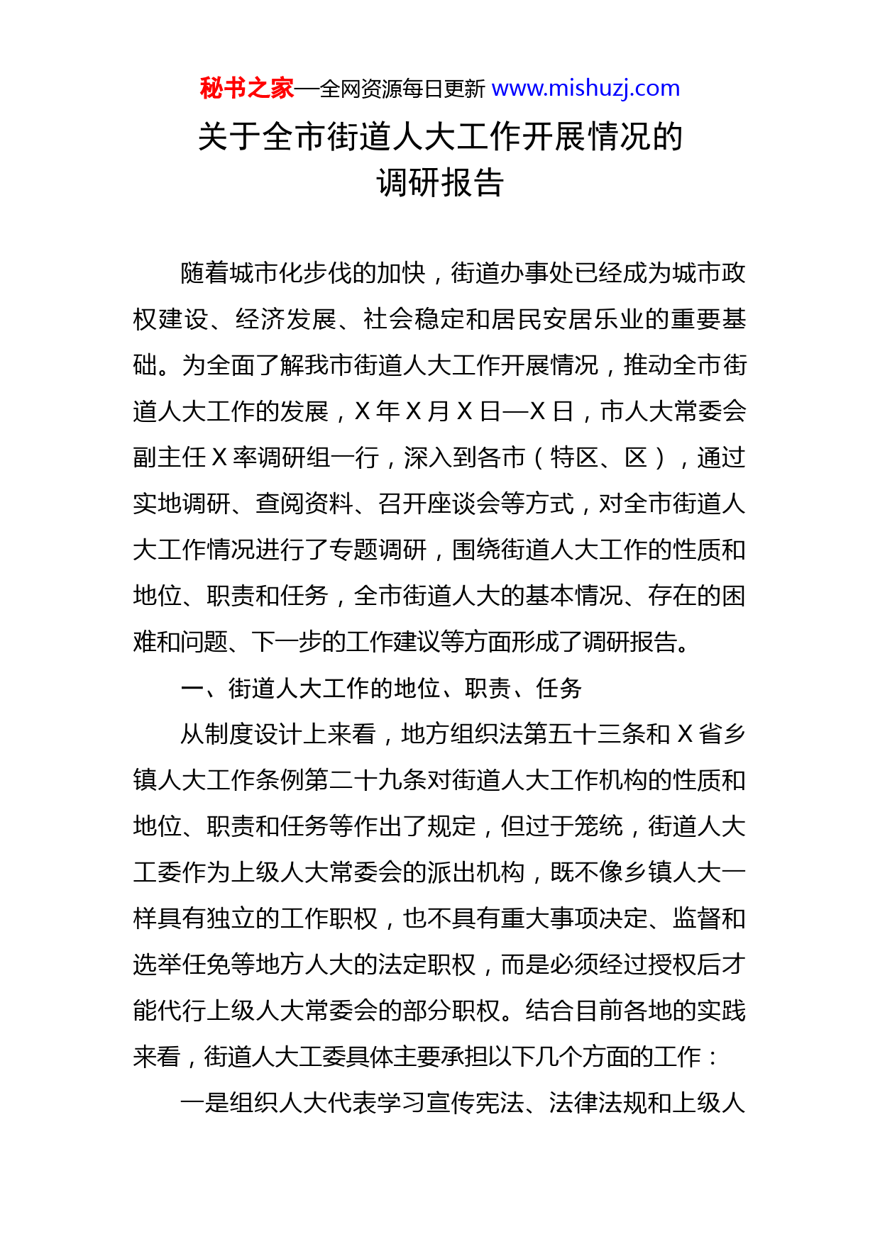 秘书之家—全网资源每日更新www.mishuzj.com关于全市街道人大工作开展情况的调研报告随着城市化步伐的加快,街道办事处已经成为城市政权建设、经济发展、社会稳定和居民安居乐业的重要基础。为全面了解我市街道人大工作开展情况,推动全市街道人大工作的发展,X年X月X日—X日,市人大常委会副主任X率调研组一行,深入到各市(特区、区),通过实地调研、查阅资料、召开座谈会等方式,对全市街道人大工作情况进行了专题调研,围绕街道人大工作的性质和地位、职责和任务,全市街道人大的基本情况、存在的困难和问题、下一步的工作建议等方面形成了调研报告。一、街道人大工作的地位、职责、任务从制度设计上来看,地方组织法第五十三条和X省乡镇人大工作条例第二十九条对街道人大工作机构的性质和地位、职责和任务等作出了规定,但过于笼统,街道人大工委作为上级人大常委会的派出机构,既不像乡镇人大一样具有独立的工作职权,也不具有重大事项决定、监督和选举任免等地方人大的法定职权,而是必须经过授权后才能代行上级人大常委会的部分职权。结合目前各地的实践来看,街道人大工委具体主要承担以下几个方面的工作:一是组织人大代表学习宣传宪法、法律法规和上级人秘书之家—全网资源每日更新www.mishuzj.com大及其常委会的决议、决定;宣传人大制度和代表依法履职事迹;组织代表学习和培训,不断提高代表的履职意识和履职能力。二是按照上级人大常委会的工作部署安排,结合本街道实际,制订街道人大工委年度工作计划,积极开展工作;负责组织和主持闭会期间代表活动。三是组织人大代表通过召开座谈会、听取汇报、工作评议、调研、视察、执法检查、等形式,对街道办事处和辖区内政府派出机构开展法律监督和工作监督,协助政府推进工作。四是组织人大代表对辖区内财政经济、社会治安、城市建设和管理、公共事务、社会保障等各项事业的发展和人民群众关心的热点难点问题进行调查研究,向上级人大常委会及有关部门反映情况,提出意见和建议。五是协助人大代表联系选民和群众,了解社情民意,反映人民群众的意见和要求;负责组织代表向选民述职,接受选民评议。六是联系辖区内的各级人大代表,定期召开座谈会,听取和反映人大代表的意见和要求;安排和组织人大代表开展个人持证视察;接待和受理代表来信来访;指导人大代表提好议案、建议、批评和意见;督促和检查代表建议、批评和意见的办理和落实,为代表履行职责服务。七是负责组织开展辖区内出缺人大代表的补选工作。八是承办上级人大常委会及其主任会议交办的其他事项。街道人大工委主要通过以下途径和方法开展工作:一秘书之家—全网资源每日更新www.mishuzj.com是听取工作汇报。借以了解本辖区内财政经济、社会事业、公共服务等方面工作开展的情况和街道办事处领导人员履职的情况等;二是开展视察调研。围绕一定的议题加以组织,对某一方面工作的推进有针对性地提出意见和看法,为党委政府决策提供参考;三是开展执法检查。以检查推进法律法规的实施,推进行政执法责任制的落实,促进依法行政和公正司法水平的提高;四是开展专题调查。围绕同级党委的工作重心和政府的工作重点,以及人民群众关心关注的热点难点问题,深入调查研究,从中发现值得总结的经验、需要引起关注的方面、迫切需要解决的问题,为党委的决策提供参考,为推进政府工作提供支持;五是加强情况通报。就一些重大问题、重点工作的推进等事先沟通,征求意见,推动决策的民主化、科学化,提升政府决策的能力和水平;六是开展工作评议。工作评议是集听取汇报、视察调研、执法检查等多种监督形式于一身的综合监督方式,以此促进政府及其工作部门转变职能,更好地服务经济、服务群众、服务基层,更好地维护社会的稳定。二、全市街道人大工作的基本情况全市共有街道办事处X个,其中:六枝特区X个,有市、区两级人大代表X名;盘州市X个,有六盘水市、盘州市两级人大代表X名;水城区X个,有市、区两级人大秘书之家—全网资源每日更新www.mishuzj.com代表X名;钟山区X个,有市、区两级人大代表X名。X个街道共辖人口X万人,其中人口最多的是钟山区黄土坡街道,有X万余人,人口最少的是水城区石龙街道,有X万余人。多年来,全市各街道人大牢记初心使命,坚持为民情怀,积极搭建履职平台,助推代表有效履职,较好地发挥了街道人大工委和人大代表在基层社会治理中的作用,强化国家治理体系在基层的保障作用。(一)坚持双重领导,服务中心工作。全市各街道人大工委始终坚持同级党工委和上级人大常委会的双重领导。始终坚持和依靠党的领导,为做好街道人大工作提供了根本保证。各街道党工委重视和加强对人大工作的领导,定期听取人大工作情况汇报,研究解决工作中存在的问题。各街道人大工委牢固树立为代表服务的意识,坚持服务中心工作,围绕街道中心工作和群众关切的重点难点,结合实际制定工作计划,充分发挥人大代表的监督职能作用,认真履行宪法和法律赋予的职责,以高度的政治责任感和使命感,履职尽责,完成街道党工委交给的加强民主法治建设、密切联系人民群众、维护社会稳定等方面的工作,做到街道人大工作与党工委、办事处同心、同向、同频,充分发挥