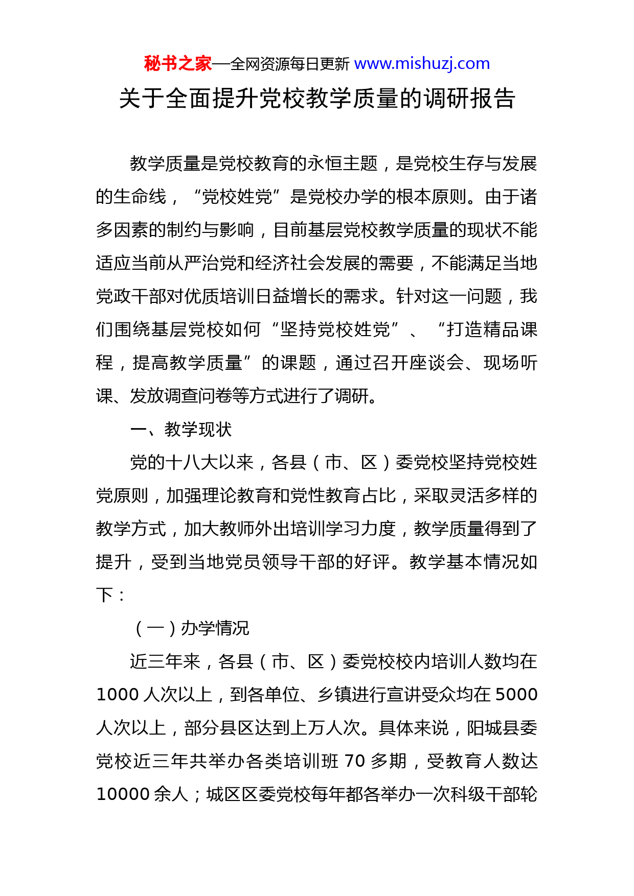 秘书之家—全网资源每日更新www.mishuzj.com关于全面提升党校教学质量的调研报告教学质量是党校教育的永恒主题,是党校生存与发展的生命线,“党校姓党”是党校办学的根本原则。由于诸多因素的制约与影响,目前基层党校教学质量的现状不能适应当前从严治党和经济社会发展的需要,不能满足当地党政干部对优质培训日益增长的需求。针对这一问题,我们围绕基层党校如何“坚持党校姓党”、“打造精品课程,提高教学质量”的课题,通过召开座谈会、现场听课、发放调查问卷等方式进行了调研。一、教学现状党的十八大以来,各县(市、区)委党校坚持党校姓党原则,加强理论教育和党性教育占比,采取灵活多样的教学方式,加大教师外出培训学习力度,教学质量得到了提升,受到当地党员领导干部的好评。教学基本情况如下:(一)办学情况近三年来,各县(市、区)委党校校内培训人数均在1000人次以上,到各单位、乡镇进行宣讲受众均在5000人次以上,部分县区达到上万人次。具体来说,阳城县委党校近三年共举办各类培训班70多期,受教育人数达10000余人;城区区委党校每年都各举办一次科级干部轮秘书之家—全网资源每日更新www.mishuzj.com训班和农村(社区)两主干“领头雁”培训班,党员发展对象和党务干部培训也相对固定,近几年每年总培训人数近万人次,实现了全区党员干部培训全覆盖。(二)教学内容各县(市、区)委党校严格按照市委《关于加强和改进新形势下党校工作的实施意见》的要求,把党的理论教育和党性教育作为党校教学首要任务,在教学安排中,党的理论教育和党性教育课不低于总课时的70%,其中党性教育课不低于总课时的20%。教学过程中实行承诺制,对本校教师严格加强政治纪律教育管理,外请教师一律签约承诺书,杜绝在党校课堂出现违背政治纪律的杂音。比如,阳城县委党校十分注重科学设置培训内容,结合学习《中国共产党章程》、《中国共产党廉洁自律准则》、《中国共产党纪律处分条例》、《关于新形势下党内政治生活若干准则》、《中国共产党党内监督条例》、习近平总书记系列重要讲话精神等,既突出先导性,坚持思想引领,又注重基础性,筑牢思想根基,还把握战略性,凝聚思想共识,通过理论武装和能力培养,突出抓好领导干部和农村干部理论教育、党性教育、法律法规意识教育,不断提升党员干部能力素质。(三)教学方式教学内容是灵魂,教学方式是载体,不断创新教学方秘书之家—全网资源每日更新www.mishuzj.com式,在传统教学方式的基础上各个党校都作出了积极有益的探索。研讨式、案例式、体验式、情景模拟式、延伸培训、现场教学等新的教学方法逐步进入县级党校课堂。用学术讲政治,多样化的教学方法解读政治理论。比如城区区委党校,组织科级干部赴清华大学培训,组织农村干部到延安和井冈山进行延伸培训,在校内组织结构式研讨。收到良好的效果。阳城县委党校加大案例教学、讨论式互动式教学、现场教学比重,尝试创新访谈式教学,提高培训实效,加强与省内外党校、高等院校和培训基地的相互合作,实现资源共享,拓宽培训模式,开阔学员视野,此外还设立了阳城党史展览室,使培训更具实效性和吸引力。泽州县委党校坚持每周一例会学习制度,采取老师讲、大家评议进行,促进教师讲课水平提高;开展学员论坛。采取学员讲、老师点评方式,起到学员主动参与,老师受感悟,教学相长;开展情景模拟教学,提供具体案例,老师主持,学员积极参与,提高理论联系实际能力。(四)科研工作组织教师撰写学习党的十九大精神研究论文,在省级刊物和《太行日报》刊载,结合本地实际研究如何贯彻落实党的十九大精神和省委市委精神。县级党校虽队伍力量单薄,但各县级党校对科研工作十分重视,近几年来完成众多有影响力、有分量的科研成果。比如县区党校完成的秘书之家—全网资源每日更新www.mishuzj.com《适应城镇化新形势加强村改居社区党建工作研究》曾获2014年全国党建研究会二等奖并获省党建研究会课题一等奖。在省委党校科研成果评比中,各县区党校也是屡屡斩获各类奖项。同时,县区党校积极发挥智库作用,积极为县委县政府提交调研报告以供决策参考,如高平市委党校每年完成至少两篇调研报告提交高平市委市政府。二、存在的问题(一)教师严重短缺,年轻教师政治意识有待提高各县(市、区)委党校随着办学规模的不断扩大,教师的年龄结构、专业结构、人员数量出现严重短缺。具体表现是新招录的年轻教师缺乏教学经验,从高校毕业入职党校,对党校的政治理论的特殊性重要性的认识不足,这不仅是教学经验的问题,更是一个政治观念的成熟度问题,需要不断地历练。老中青师资力量统筹协调存在问题。专业结构不合理,一些紧缺专业招不上人,不能很好地开展专题性教学。一些党校编制不足,理论教师缺乏。这些都严重制约了教学质量的提升。(二)教师进修培训经费不足各县(市、区)委党校普遍反映教师进修培训经费不足,不能保证大规模外派教师,成为制约教师素质提升的瓶颈。教师外出培训进修没有必要的经费保障,教师不能达到较快的知识更新和较大的知识储备。秘书之家—全网资源每日更新www.mishuzj.com三、今后的提升措施(一)教学队伍专业化,突出党校主业主课教学要求提高党校教学质量的关键在于建