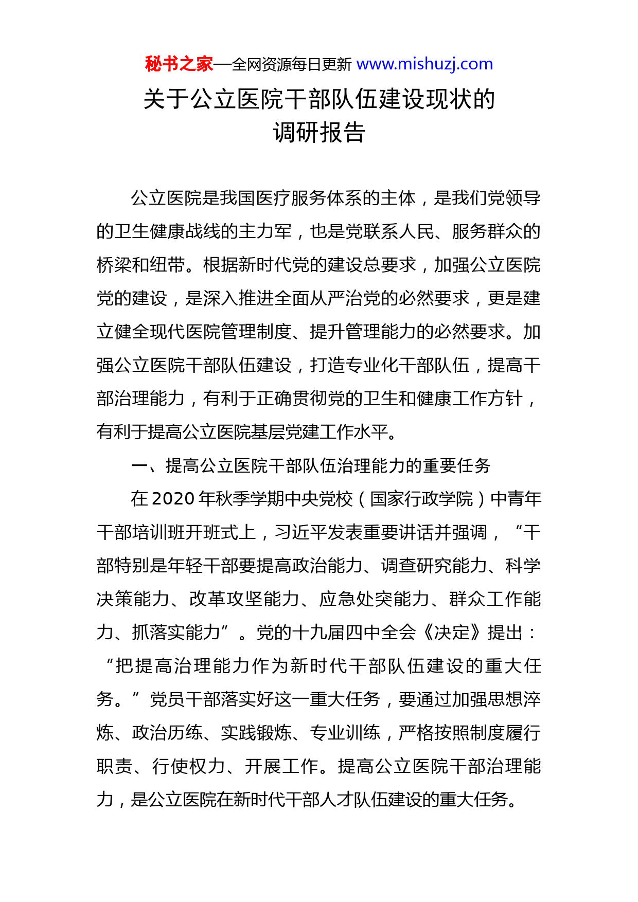秘书之家—全网资源每日更新www.mishuzj.com关于公立医院干部队伍建设现状的调研报告公立医院是我国医疗服务体系的主体,是我们党领导的卫生健康战线的主力军,也是党联系人民、服务群众的桥梁和纽带。根据新时代党的建设总要求,加强公立医院党的建设,是深入推进全面从严治党的必然要求,更是建立健全现代医院管理制度、提升管理能力的必然要求。加强公立医院干部队伍建设,打造专业化干部队伍,提高干部治理能力,有利于正确贯彻党的卫生和健康工作方针,有利于提高公立医院基层党建工作水平。一、提高公立医院干部队伍治理能力的重要任务在2020年秋季学期中央党校(国家行政学院)中青年干部培训班开班式上,习近平发表重要讲话并强调,“干部特别是年轻干部要提高政治能力、调查研究能力、科学决策能力、改革攻坚能力、应急处突能力、群众工作能力、抓落实能力”。党的十九届四中全会《决定》提出:“把提高治理能力作为新时代干部队伍建设的重大任务。”党员干部落实好这一重大任务,要通过加强思想淬炼、政治历练、实践锻炼、专业训练,严格按照制度履行职责、行使权力、开展工作。提高公立医院干部治理能力,是公立医院在新时代干部人才队伍建设的重大任务。秘书之家—全网资源每日更新www.mishuzj.com思想淬炼是基础。提升干部治理能力,应思想先行。深入学习马克思主义国家治理理论,尤其要学懂弄通做实习近平新时代中国特色社会主义思想,深刻领会其先进治理理念、科学治理方法,搞清楚“为谁治理”“由谁治理”等问题,始终坚定理想信念,牢记初心使命。政治历练是根本。党员干部要牢牢把握国家治理的正确政治方向,不断锤炼忠诚干净担当的政治品格,接受政治体检、打扫政治灰尘、净化政治灵魂、增强政治免疫力。努力提高把握方向、把握大势、把握全局的能力,提高辨别政治是非、保持政治定力、驾驭政治局面、防范政治风险的能力。实践锻炼是保障。治理能力只有在长期实践锻炼中才能砥砺而成。党员干部要正确处理目标引领和问题导向、建章立制和落地见效的关系,要在实践锻炼中培养“顶得住、冲得上”的能力。公立医院党员干部尤其要牢固树立“服务群众、人民至上”的理念。尤其是疫情防控,对公立医院干部治理能力就是一场“大考”。专业训练是支撑。按照“干什么学什么、缺什么补什么”的原则,公立医院有针对性地开展领导艺术、岗位业务、群众工作等务实管用的专题培训,使党员干部在专业知识和综合能力上能满足医院治理的新需求。二、公立医院干部队伍治理能力现状秘书之家—全网资源每日更新www.mishuzj.com为进一步了解公立医院干部人才队伍治理能力建设情况,XX大学医学院附属第九人民医院课题组专门设计了调研问卷,对上海市多家公立医院进行问卷调查和实地调研。课题组共发放调查问卷XXX份,回收有效问卷XXX份,回收率达到XX%。从调研整体情况来看,当前公立医院干部队伍建设的整体情况良好,党员干部精神风貌积极向上,但在治理能力方面仍存在一定的不足,与党中央要求的国家治理能力现代化还存在着一定差距,需要进一步改进,主要表现有以下几方面。(一)应加强政治领导力明确内部分工、加强工作沟通、培养创新意识。增进干群信任,减少群众不满情绪,夯实群众基础,提高政治公信力。在问卷调查中,从受访者回答“您认为当前干部人才队伍治理能力与工作需要的差距”这一问题中我们可以看到,XX%的受访者认为当前党员干部队伍治理能力与工作需要、组织要求和群众期盼之间的差距较大,形成领导干部提高治理能力的外在压力,同时说明在提升党员干部队伍治理能力方面还有较大的完善空间。(二)应加强思想引领力基层党组织领导干部思想引领力不强,主要表现为部分干部对工作“走过场”“搞选择”“打折扣”,存在懈怠情绪、侥幸念头和麻痹思想。在回答“您最希望参加哪秘书之家—全网资源每日更新www.mishuzj.com方面的治理能力提升培训?”问题时,与岗位工作直接相关的专业知识的学习、党的路线方针、领导科学、方法和艺术等选项是大多数受访者认为的党员干部治理能力提升培训应该合理包含的内容。(三)应健全人才培养机制受访者在回答“您认为干部队伍治理能力提升中存在哪些问题?”时,选择较多的选项是综合素质有待提高、培养机制不够健全。这说明构建一个多层次全方面的培养机制从而提高干部队伍的综合素质是当下提升党员干部治理能力方面亟待解决的问题。在人才培养上,应加强系统性分析,开展针对性强的培训,符合医院干部的知识、能力结构和需求。(四)应规范细化考核标准应结合新医改政策下医院发展的具体战略目标来设定医院发展目标、科室发展目标、医疗工作人员工作目标,等等,并在此基础上加强对绩效考核工作的监管力度。在实际应用中,将绩效考核结果应用到薪酬分配以及激励机制当中,并以此为基础来充分调动员工工作积极性。绩效考核不仅要考虑考核标准的“普遍性”,还要考虑干部具体工作岗位、工作环境、工作基础,因此,需设置客观的考核指标来评定党员干部,并根据新医改政策的具体内容,结合医院发展的具体情况,完善公立医院绩效考核和秘书之家—全网资源每日更新www.mishuzj.com薪酬体系,做到