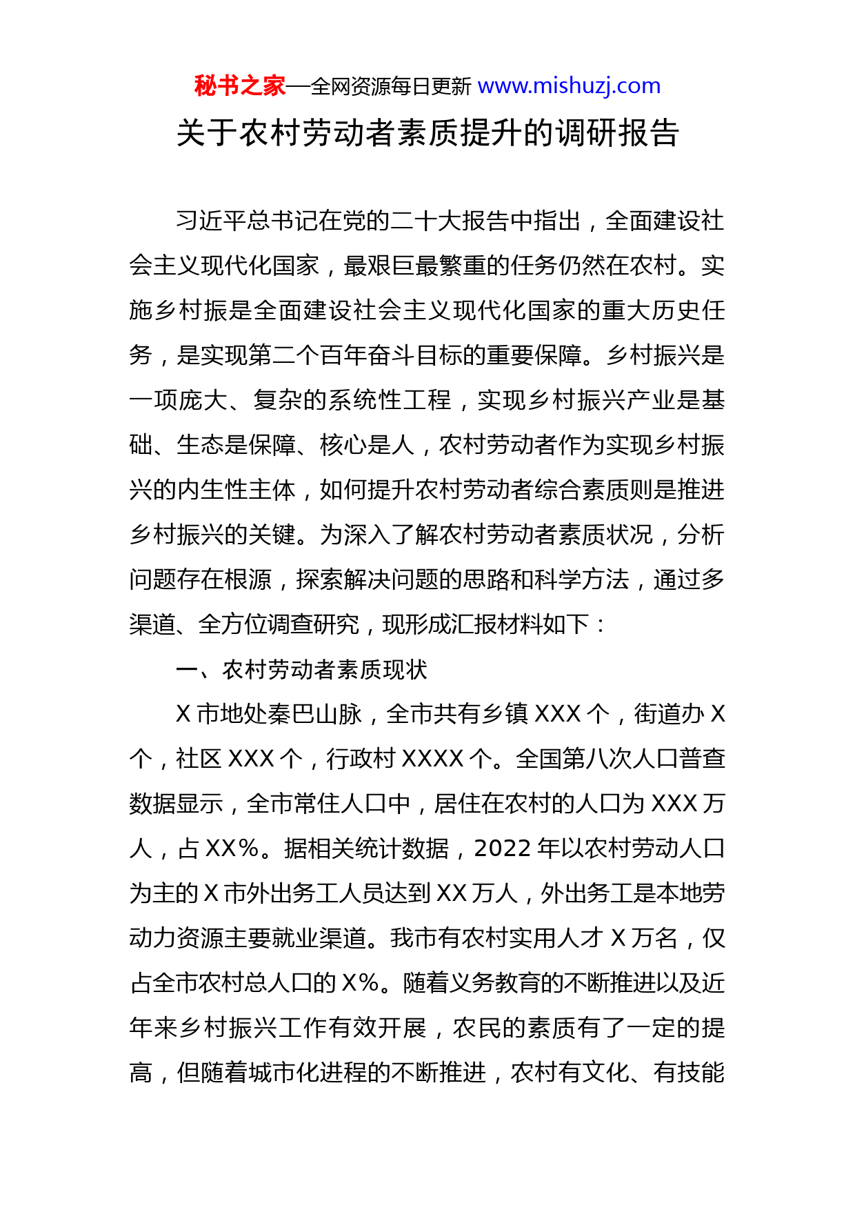 秘书之家—全网资源每日更新www.mishuzj.com关于农村劳动者素质提升的调研报告习近平总书记在党的二十大报告中指出,全面建设社会主义现代化国家,最艰巨最繁重的任务仍然在农村。实施乡村振是全面建设社会主义现代化国家的重大历史任务,是实现第二个百年奋斗目标的重要保障。乡村振兴是一项庞大、复杂的系统性工程,实现乡村振兴产业是基础、生态是保障、核心是人,农村劳动者作为实现乡村振兴的内生性主体,如何提升农村劳动者综合素质则是推进乡村振兴的关键。为深入了解农村劳动者素质状况,分析问题存在根源,探索解决问题的思路和科学方法,通过多渠道、全方位调查研究,现形成汇报材料如下:一、农村劳动者素质现状X市地处秦巴山脉,全市共有乡镇XXX个,街道办X个,社区XXX个,行政村XXXX个。全国第八次人口普查数据显示,全市常住人口中,居住在农村的人口为XXX万人,占XX%。据相关统计数据,2022年以农村劳动人口为主的X市外出务工人员达到XX万人,外出务工是本地劳动力资源主要就业渠道。我市有农村实用人才X万名,仅占全市农村总人口的X%。随着义务教育的不断推进以及近年来乡村振兴工作有效开展,农民的素质有了一定的提高,但随着城市化进程的不断推进,农村有文化、有技能秘书之家—全网资源每日更新www.mishuzj.com的高素质人口严重流失,农村土地撂荒、人员老龄化、空心化、低素质化等问题日益突出。加上农村受教育状况、经济发展水平等因素的限制,农村居民在经济、社会、政治、环境、生活等方面发展明显滞后,与现代化建设和市场经济不相适应,成为制约社会主义现代化建设的“短板”,极大地限制了乡村振兴进程。目前农村现有劳动人口状况总体存在以下问题:(一)生产水平低下,认知水平不高。村民受教育程度偏低,与乡村振兴战略要求的“发展现代农业”不相适应。受市场经济影响,出现了读书无用论,部分少年初高中未毕业就进入社会。由于农民科技知识低下,对新事物、新技术缺乏认识,从而阻碍了接受新事物、学习使用新科技的能力。在我市大多数乡镇农村的生产工具较为落后,农耕收割仍停留在锄头、镰刀、斧头的刀耕火种时代,这样的生产力水平,决定了大多数农民的观念还是停留在小生产经济的传统观念上。(二)经营意识淡薄,市场参与不强。由于绝大多数农民没有接受过有关市场经济知识的系统教育与培训,受传统自然经济和计划经济体制的影响较大,市场观念淡薄,缺乏市场主体意识和进入市场、寻求发展的内在冲动,缺乏市场经营的知识储备和思想准备,缺乏根据市场变化来调整和组织生产的能力,市场参与能力不强。这主秘书之家—全网资源每日更新www.mishuzj.com要表现在:一是缺乏效率观念,生活节奏缓慢,习惯于慵懒闲散、安逸舒适的田园式生活,社会交往参与率不高,创业动力和投资意识不强,构成其全面发展的内部阻碍;二是风险意识不强,普遍存在怕担风险的“躺平”心理,生产经营目标过于求稳,长此以往造成抵御风险能力弱化;三是信息素养偏低,不能积极主动利用各种途径和手段搜集、开发和利用技术与市场信息,从而造成生产上的盲目性;四是对市场规则和运行规律比较陌生,信息接收和反馈能力差,经营管理的观念和方法难以适应市场经济环境。因此,农民对市场有畏惧心理,即使有进入市场的愿望,却因没有进入市场的能力而只能在市场的门外徘徊观望。(三)文化生活单调,文明程度不高。受地域环境差、城乡教育均等化程度低、农村信息化硬件设施体量不足等因素限制,农民文化素养得不到有效培育,精神生活匮乏,基层文化生活较为单调,致使少数农民的集体意识、诚信品德一步步弱化,不良风气与陈规陋习仍然存在,甚至存在封建迷信死灰复燃现象。二、制约农村劳动者整体素质提升的因素分析造成农村劳动力整体素质不高的原因比较复杂,既有历史的因素,也有现实的原因,既受农民主观因素的影响,也受现实客观条件的制约。总体上可概括为以下几秘书之家—全网资源每日更新www.mishuzj.com点:(一)农村教育资源投入不足。农村“三教”(即基础教育、职业教育和成人教育)处于分割或残缺的状况。教育资金投入不足。实验室、体育馆、文化活动中心等教学场所缺乏。教师工资奖金投入不足,许多年轻教师在农村小学工作一段时间后,由于工资太低,纷纷辞职。贫困家庭学生助学资金不足。虽然有了九年制义务教育减免学杂费等政策,但是一些贫困群众还是因家庭收入问题无法供孩子上学。稀少的助学金对贫困家庭学生的帮助作用微乎其微。多数农村青少年完成义务教育或高中毕业后即走向社会,缺乏继续接受系统教育的机会,这影响了其文化水平和劳动技能的提高。而农民根深蒂固的保守思想和传统小农意识,使得其重经验,轻知识,对新事物、新技术缺乏认识,这在一定程度上阻碍了其接受新事物、学习使用新科技的能力。因此,农民种地只会粗放经营而不能集约经营,打工只能出卖苦力打廉价工,“升学无希望,打工无出路,回乡无技术,致富无门路”是农村学生普遍面临的困境,而真正能为农村服务的成人教育又面临诸多问题。这也严重制约了农民的增收。(二)农村信息获取渠道单一。针对农村劳动者信息短缺问题,一方面是其自身问题。农民不善于与外部世界沟通,运用信息化工