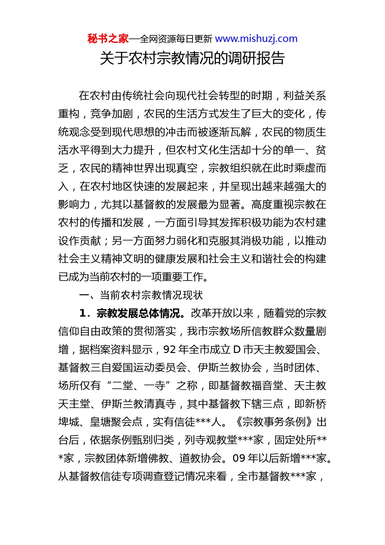 秘书之家—全网资源每日更新www.mishuzj.com关于农村宗教情况的调研报告在农村由传统社会向现代社会转型的时期,利益关系重构,竞争加剧,农民的生活方式发生了巨大的变化,传统观念受到现代思想的冲击而被逐渐瓦解,农民的物质生活水平得到大力提升,但农村文化生活却十分的单一、贫乏,农民的精神世界出现真空,宗教组织就在此时乘虚而入,在农村地区快速的发展起来,并呈现出越来越强大的影响力,尤其以基督教的发展最为显著。高度重视宗教在农村的传播和发展,一方面引导其发挥积极功能为农村建设作贡献;另一方面努力弱化和克服其消极功能,以推动社会主义精神文明的健康发展和社会主义和谐社会的构建已成为当前农村的一项重要工作。一、当前农村宗教情况现状1.宗教发展总体情况。改革开放以来,随着党的宗教信仰自由政策的贯彻落实,我市宗教场所信教群众数量剧增,据档案资料显示,92年全市成立D市天主教爱国会、基督教三自爱国运动委员会、伊斯兰教协会,当时团体、场所仅有“二堂、一寺”之称,即基督教福音堂、天主教天主堂、伊斯兰教清真寺,其中基督教下辖三点,即新桥埤城、皇塘聚会点,实有信徒人。《宗教事务条例》出台后,依据条例甄别归类,列寺观教堂家,固定处所家,宗教团体新增佛教、道教协会。09年以后新增家。从基督教信徒专项调查登记情况来看,全市基督教家,秘书之家—全网资源每日更新www.mishuzj.com信徒人左右,集体购房家,门面房家。2.活动情况和信徒特征。聚会点活动时间一般为周日,安排学圣经、唱诗歌,作祷告活动。私设的聚会点大致有两类特征:一类是点与点之间区域明显;另一类是点与已办证的教堂有类似于堂与堂、堂带点管理模式。从目前所反馈的信息来看,无传播异端邪教。信众的年龄构成中,以中、老年居多,但也逐渐出现了信众年轻化趋势;性别构成上,以女性信徒偏多;学历普遍偏低,以初中学历居多。3.存在问题。一是部分民间信仰尚不规范。突出表现在:活动内容混杂,给封建迷信活动以可乘之机,甚至会引发不稳定、不安全事端。二是有些场所管理混乱。有的由村民推选,轮流做庄;有的作为老人活动中心由老人会兼管;有的民间信仰活动场所组织不健全。二、宗教文化在农村建设中的影响1.积极影响。宗教文化对农村信徒的心理调适作用明显,教徒在参加活动的过程中获得情感支持和归属感,一方面促进了农村社会的和谐发展,而且在一定程度上弥补了因集体缺位而导致的公共服务的匮乏。农村宗教以新颖的文化生活方式吸引村民们入教,客观上实现了构建农村文化生活的效果。同时对农村改善人际关系、鼓励勤劳致富、革除陈规陋习方面也有积极影响。2.消极影响。宗教信仰对农村基层政权建设造成了一定影响,特别是基督教徒的人数增加影响了基层民主选举秘书之家—全网资源每日更新www.mishuzj.com基督教的传教方式和传教目标影响基层政权的群众基础,基督教的组织方式和动员能力对基层政权的权威构成一定威胁。基督教的快速扩张,对主流意识形态在农村的传播造成很大的冲击。三、建议1.正确认识其积极因素,为构建和谐社会服务。积极挖掘宗教信仰中对弘扬民族精神有利的因素,剔除迷信因素,引导民间信仰者移风易俗,走出对神灵、菩萨的盲目依赖信仰的误区,使其朝正确的方向发展。如基督教中倡导的敬业、爱业等天职观念,对农村职业道德建设和精神风貌有一定的作用。2.强化脱贫攻坚。完善扶贫政策的顶层设计,制定分类系统性帮扶机制,充分发挥社会和市场力量,形成政府部门、慈善机构、社会组织、金融保险等共同参与救助的工作格局,通过临时生活救助、临时医药救助和节日尉问方式,尽可能给予多的帮助。拓展帮扶举措,因地因户施策,推动“阳光扶贫”系统高水平、高质量运行。3.加强农村思想文化工作。利用好现有的教育载体,做好宗教理论、政策、法规的宣传教育,帮助农民树立崇尚现代科学文化的观念,以夜校或多种宣传形式在农村开展科学文化专题宣讲活动,开拓农民的视野。充分发挥中华民族传统文化娱乐活动的作用,开展健康有益的文化活动,使文化娱乐活动成为农民业余文化生活的一部分。加强农村信息化建设,通过深入实施农业信息服务工程,丰秘书之家—全网资源每日更新www.mishuzj.com富农民精神生活。4.加强干部队伍建设。加强党政领导干部队伍和宗教干部队伍的培养和培育工作,做好党的宗教工作政策、法规宣传,把宗教和迷信、合法宗教活动与非法宗教活动区分开来,尤其是在党员干部队伍中开展坚定信念教育,坚决反对部分党员干部信仰交叉,既信共产主义又信有神论。
