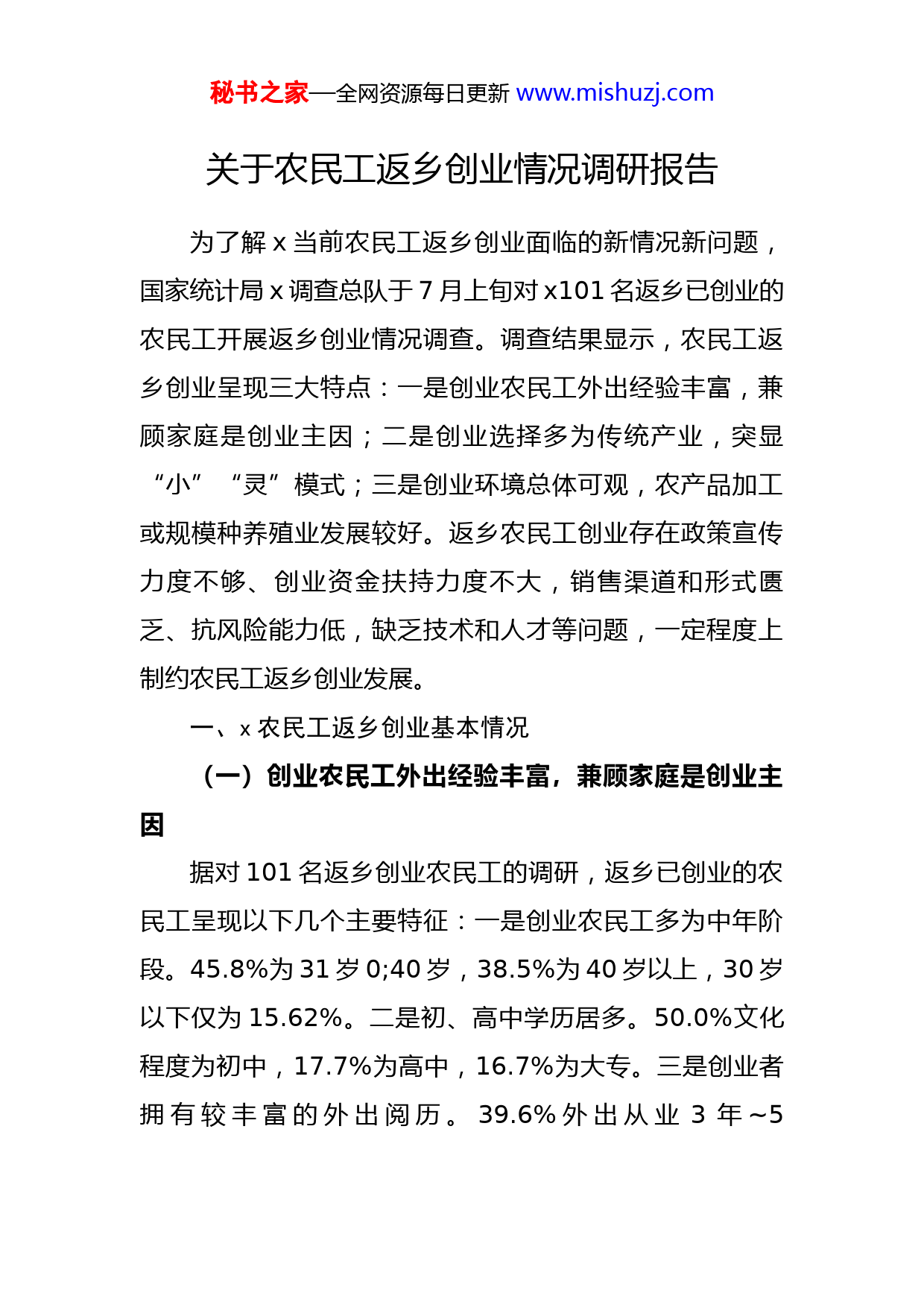 秘书之家—全网资源每日更新www.mishuzj.com关于农民工返乡创业情况调研报告为了解x当前农民工返乡创业面临的新情况新问题,国家统计局x调查总队于7月上旬对x101名返乡已创业的农民工开展返乡创业情况调查。调查结果显示,农民工返乡创业呈现三大特点:一是创业农民工外出经验丰富,兼顾家庭是创业主因;二是创业选择多为传统产业,突显“小”“灵”模式;三是创业环境总体可观,农产品加工或规模种养殖业发展较好。返乡农民工创业存在政策宣传力度不够、创业资金扶持力度不大,销售渠道和形式匮乏、抗风险能力低,缺乏技术和人才等问题,一定程度上制约农民工返乡创业发展。一、x农民工返乡创业基本情况(一)创业农民工外出经验丰富,兼顾家庭是创业主因据对101名返乡创业农民工的调研,返乡已创业的农民工呈现以下几个主要特征:一是创业农民工多为中年阶段。45.8%为31岁0;40岁,38.5%为40岁以上,30岁以下仅为15.62%。二是初、高中学历居多。50.0%文化程度为初中,17.7%为高中,16.7%为大专。三是创业者拥有较丰富的外出阅历。39.6%外出从业3年~5秘书之家—全网资源每日更新www.mishuzj.com年,32.3%外出11年及以上,12.5%外出从业6年0;10年。四是外出主要从事制造业等传统行业。37.5%返乡前从事制造业,11.5%从事批发零售业,10.4%从事住宿餐饮业,10.4%从事建筑业。五是兼顾家庭和追求高收入是创业主要动机。35.4%动机为兼顾家庭,15.6%认为自主创业收入高,12.5%是不愿为别人打工。(二)创业选择多为传统产业,突显“小”“灵”模式一是创业选择主要行业仍是农业。50.0%选择农产品加工或规模种养殖业,13.5%选择制造业,12.5%选择批发零售业。北海市银海区福成镇余某利用老家农村闲置田地,返乡搞大棚种植,通过自筹的120万创业启动资金,成立了合作社,既能实现自主创业,也能带动周边村民提高收入,目前种植面积已经达到了300多亩。二是工作人员数多为6人以下。41.7%为3人以下,主要为批发零售业;31.3%为3人0;6人,主要为建筑业、农产晶加工或规模种养殖业。三是创业形式较为灵活。45.8%为个人创业,29.2%为合伙创业;创业场地多为租赁,占62.5%,自有场地占29.2%。(三)创业环境总体可观,农产晶加工或规模种养殖业发展较好一是创业情况总体较好。从次数看不多,63.5%创业秘书之家—全网资源每日更新www.mishuzj.com1次,25.0%创业2次,需创业3次以上只有6.3%;从创业至今时长看较长,31.3%为4年以上,1年0;2年和2年0;3年分别为27.1%和18.8%。二是目前经营情况中等偏上。37.5%认为“良好”,主要为农产品加工或规模种养殖业,批发零售业、住宿餐饮业;49.0%认为“一般”;13.5%认为“不佳”。三是未来发展稳中求进。51.0%保持不变,主要为批发零售业、住宿餐饮业;46.9%扩大规模,主要为农产品加工或规模种养殖业;2.1%缩减规模。二、存在问题(一)优惠政策宣传力度不够据调查,在“当地政府有无鼓励返乡农民工创业的优惠或扶持政策”的问题上,60.4%的受访者选择了不清␌楚”或无”的选项,并在“政府给予的创业优惠或扶持␌政策选择了其他”。据了解,受访者北海市合浦县石湾镇七里村的夏先生表示自己在村委工作,对创业扶持政策和优惠政策比较关注,但未发现能为自己创业提供帮助的政策。现有政策在产业规模、场地要求方面存在限制较多,或者倾向于帮扶大规模种植业,如宜豆种植规模要求达到100亩才可以享受政策;或对场地环境方面限制,养猪场建立需要距离村居2公里0;3公里。钦州市钦北区青塘镇红村利先生反映,和小舅子合伙投资60多万元开办木片秘书之家—全网资源每日更新www.mishuzj.com厂,购买1台叉车、1台铲车及其他加工设备,投入的每一分钱都是自己打工的血汗钱,不清楚有什么创业优惠或扶持政策,没得到过任何的帮助或补助,压力较大。(二)创业资金扶持力度不大据了解,在受访对象中81.2%的创业农民工反映创业资金主要来源是“自有资金”,“银行贷款”和“政府资助”占比仅为21.9%和3.1%,政府对创业资金扶持力度不大。如,百色市社马村黄某2014年回乡创业种植磨菇,总投入资金约95万元,创业以来没有收到返乡农民工创业的优惠或扶持政策宣传,没有享受到资金类奖补,由于银行贷款手续复杂,经营投入的资金以自有资金和民间贷款为主。(三)销售渠道和形式匮乏,抗风险能力低调研的101名创业农民工中,54.5%和37.6%的受访者反映“市场开拓艰巨”“缺乏销售渠道”,销售渠道和形式匮乏,受市场供求和价格影响大,农民工抗风险能力不足。钦州市灵山县大黎村委罗先生反映,2020年发现养猪获利较高,就辞职返乡从事养鸡和养猪创业,但由于对市场风险预计不足,2021年猪价下跌,目前已亏损了二十多万。梧州市苍梧县石桥镇泗岐村易先生表示因为缺乏销售渠道,加上对市场供求预期不足和受市场价格波动大的影响,2021年种植的茄子收购价格为0.2元/斤,只能勉秘书之家—全网资源每日更新www.mishuzj.com强抵消雇佣工人采摘成本。新建村村民李先生的家庭农场产品主要销往广东,受近期广东地区爆发新冠疫情影响,只能在本地销售,2021年上半年销量比2020年同期下降50%,销售价格也低于广东地区。(四)缺乏技术和人才问题调研的101名创业农民工中,27.1%和28.1%的受访者反映“缺乏技术创新”和“技术人才”。农民工返乡创业除了微型的家庭作坊外,上了一定规模的企业深感人才缺乏。玉林市
