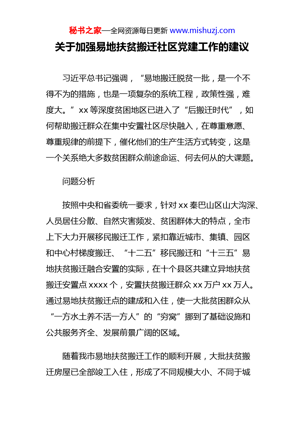 秘书之家—全网资源每日更新www.mishuzj.com关于加强易地扶贫搬迁社区党建工作的建议习近平总书记强调,“易地搬迁脱贫一批,是一个不得不为的措施,也是一项复杂的系统工程,政策性强,难度大。”xx等深度贫困地区已进入了“后搬迁时代”,如何帮助搬迁群众在集中安置社区尽快融入,在尊重意愿、尊重规律的前提下,催化他们的生产生活方式转变,这是一个关系绝大多数贫困群众前途命运、何去何从的大课题。问题分析按照中央和省委统一要求,针对xx秦巴山区山大沟深、人员居住分散、自然灾害频发、贫困群体大的特点,全市上下大力开展移民搬迁工作,紧扣靠近城市、集镇、园区和中心村梯度搬迁、“十二五”移民搬迁和“十三五”易地扶贫搬迁融合安置的实际,在十个县区共建立异地扶贫搬迁安置点xxxx个,安置扶贫搬迁群众xx万户xx万人。通过易地扶贫搬迁点的建成和入住,使一大批贫困群众从“一方水土养不活一方人”的“穷窝”挪到了基础设施和公共服务齐全、发展前景广阔的区域。随着我市易地扶贫搬迁工作的顺利开展,大批扶贫搬迁房屋已全部竣工入住,形成了不同规模大小、不同于城秘书之家—全网资源每日更新www.mishuzj.com市又有别于传统乡村的移民搬迁安置社区,这些社区在改善搬迁贫苦户居住、就业、教育、医疗等生活条件方面发挥了巨大作用。但是,由于各种各样的原因,对这些社区和贫困户的管理也暴露出不少矛盾和问题。一是责任落实难。由于过去相当长一段时间把工作重心放在硬件建设上,后续服务配套进度滞后,贫困群众搬迁入住后,没有及时建立完备的组织架构,日常生产生活、各类事务的管理和服务等无具体机构和人员牵头负责。二是人员管理难。贫困户迁入安置地后,行政区域界限被打破,原来以村级组织管理为主的模式无法发挥作用,一些约定俗成的村规民约也失去效应,出现了人员流动、居民管理、子女就学、矛盾调处等许多新问题。三是生活融入难。大多数搬迁群众文化素质相对较低,接受新生事物能力较差,恋乡情结严重,工作技能缺乏,对新环境适应过程较长,特别是卫生习惯、劳动纪律等意识淡薄,不同程度存在乱扔、乱吐、乱倒、乱画、乱放等生活陋习,还不能完全融入城镇居民生活习惯中。四是生存就业难。搬迁地区地处城镇、园区、景区周边,为相对封闭的生活区域,日常购物、就医、红白喜事料理等方面服务跟不上,生活自理能力弱的留守老人无人秘书之家—全网资源每日更新www.mishuzj.com照料,留守儿童放学回家后无人看管,便民服务需求呼声日益高涨。加之部分搬迁贫困群众劳动力不足,就业技能差,部分群众只会从事简单的传统农业种植,要么习惯于回原居住地务农,要么无业可就,搬迁后增收难度大。五是作用发挥难。搬迁群众来自四面八方,其中的党员大多都是农民党员,年龄偏大、文化偏低,发挥先锋模范作用的能力不强,致富能力与移民群众相比没有明显优势。在日常管理上,由于部分党员组织观念淡薄,搬入集中安置点居住后,未及时转移党员组织关系,又不主动向现居住地党组织亮明身份,成了“口袋党员”;现有党员在就业形式、生活方式存在不同,道德观念与价值取向也有差异,难以聚合在一起过组织生活,教育管理工作缺乏针对性,难以取得应有的效果。对策建议如何有效解决易地扶贫搬迁社区后续发展和服务管理难题,实现搬迁群众增收致富与安居乐业,党建引领是可持续发展的重要保障,三业增收是能致富的根本核心,优化服务是稳得住的必要手段。建议组织实施“五心工程”,采取“支部引领、三业统筹、五中心服务”的管理服务模式,推动“五新社区”建设,将党组织示范引领作用充分秘书之家—全网资源每日更新www.mishuzj.com运用到了社区自治管理、群众增收致富、日常公共服务等方面,真正实现搬迁贫困群众“挪穷窝、换穷业、斩穷根”的目标。实施核心工程,健全组织体系。对安置社区(点)的搬迁群众和党员底数、信息进行全面排查,根据户籍和党组织关系分类建立相关台账,根据党员和群众数量、分布等情况,合理设置各类组织。一是建立党的组织。独立新建xxxx户以上的大型搬迁安置区,党员人数x人以上的,单独社区设立党支部。xxx户以上xxxx户以下的中性搬迁安置区,党员人数x人以上的,可连同安置区周边原居民划片形成新建社区,单独设立融合性党支部;也可与当地行政村合并,撤村改为融合型社区,建立融合改设型社区党支部。xxx户以下的小型安置区或安置点,可建立党小组,就近并入村级党组织管理。搬迁安置区党员人数不足x人的,挂靠本地行政村级党组织进行管理。安置区无党员暂时未设置党组织的,由镇(街)党(工)委统一选派党建工作指导员,确保党的工作全覆盖。二是建立自治组织。xxx户以上的大型搬迁安置区或中型安置区,在镇(街)党(工)委指导和社区(融合性社区)党组织的领导下,及时成立社区居委会,同步成立居务监督委员会、调解委员会、治保委员会等自治组织,建立和推行居民会议、居秘书之家—全网资源每日更新www.mishuzj.com民代表会议、“四议两公开”等民主决策机制,构建以党组织为领导核心,居委会为主导,居民为主体,居务监督委员会、集体经济组织、群团组织、社会组织等共同参与的社区治理架构,切实发挥自治章程、居民公约在社区治理中的