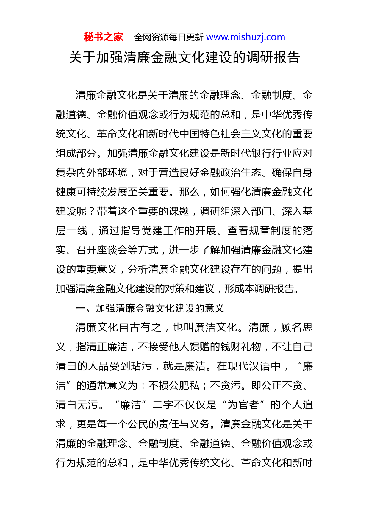 秘书之家—全网资源每日更新www.mishuzj.com关于加强清廉金融文化建设的调研报告清廉金融文化是关于清廉的金融理念、金融制度、金融道德、金融价值观念或行为规范的总和,是中华优秀传统文化、革命文化和新时代中国特色社会主义文化的重要组成部分。加强清廉金融文化建设是新时代银行行业应对复杂内外部环境,对于营造良好金融政治生态、确保自身健康可持续发展至关重要。那么,如何强化清廉金融文化建设呢?带着这个重要的课题,调研组深入部门、深入基层一线,通过指导党建工作的开展、查看规章制度的落实、召开座谈会等方式,进一步了解加强清廉金融文化建设的重要意义,分析清廉金融文化建设存在的问题,提出加强清廉金融文化建设的对策和建议,形成本调研报告。一、加强清廉金融文化建设的意义清廉文化自古有之,也叫廉洁文化。清廉,顾名思义,指清正廉洁,不接受他人馈赠的钱财礼物,不让自己清白的人品受到玷污,就是廉洁。在现代汉语中,“廉洁”的通常意义为:不损公肥私;不贪污。即公正不贪、清白无污。“廉洁”二字不仅仅是“为官者”的个人追求,更是每一个公民的责任与义务。清廉金融文化是关于清廉的金融理念、金融制度、金融道德、金融价值观念或行为规范的总和,是中华优秀传统文化、革命文化和新时秘书之家—全网资源每日更新www.mishuzj.com代中国特色社会主义文化的重要组成部分。倡导清廉金融文化,净化金融政治生态,是金融行业立足当前、着眼未来,确保金融事业持续健康发展的神圣使命。(一)加强清廉金融文化建设是落实习近平新时代中国特色社会主义思想的必然要求。习近平总书记在党的十九大报告中提出要“弘扬忠诚老实、公道正派、实事求是、清正廉洁等价值观”。这一看似寻常的论述,明确把“廉洁”与价值观紧密联系在一起,郑重提出弘扬清正廉洁等价值观,意味着习近平新时代中国特色社会主义思想赋予了马克思主义党建理论和道德学说新的内容,深化了我们对共产党执政规律和社会主义建设规律的认识。相较于“廉洁政治”、“廉洁文化”、“廉洁理念”等概念,“廉洁价值观”更具系统性、哲理性和指导性,是马克思主义党建理论和道德学说在当代中国的创造性运用和发展。面对后疫情时代错综复杂的国内外形势和不断加大的经济下行压力,我国银行业担负着更加神圣的使命,确保金融队伍的纯洁与稳定,是习近平新时代中国特色社会主义思想赋予清廉金融文化建设的一项重要任务。加强廉政文化建设,有助于银行行业的党员干部进一步掌握习近平新时代中国特色社会主义思想。党中央提出,要面向全党全社会积极开展廉政文化建设。这就要求我们必须将反腐倡廉宣传教育扩大到社会的方方面面,使健康向上的、先秘书之家—全网资源每日更新www.mishuzj.com进的清廉文化逐步占领人们的思想领域,努力在银行行业形成以廉为荣、以贪为耻的良好风气。(二)加强清廉金融文化建设是弘扬中华优秀传统文化的必然要求。早在西周初期,就以“六廉”考察官吏,“断以夫事,以廉为本”。两千多年来,历朝历代一直把“廉”作为立国之本、为政之道,设立御史、谏官、廉访使者等监督机构和官职,出台“监御史九条”“刺史六条”等法典章程奖廉罚贪,形成了“以廉为宝”“以廉为贵”等廉政思想,留下了杨震拒金、陶母退鱼、悬鹅示众、立檄拒礼等廉政典故,包拯、于谦、海瑞、于成龙等清官廉吏被千古传颂。清廉文化具有时代性。坚决反对腐败、建设廉洁文化,是我们党一以贯之的鲜明政治立场。从“三大纪律、八项注意”到延安时期“只见公仆不见官”,再到西柏坡定下“六条规定”;从“当官就不要发财,发财就不要当官”到“老虎”“苍蝇”一起打,再到心中“有党、有民、有责、有戒”。我们党以“赶考永远在路上”的韧劲和执着,赋予廉政文化崭新的时代内涵。在推进社会主义现代化建设的进程中,涌现出“什么时候都不能搞特殊”的焦裕禄、“手中权力只能老老实实办公事”的杨善洲等优秀代表,廉政文化不断被赋予新的内涵。清廉金融文化建设对于传承中华民族优秀文化,推进社会主义精神文明建设,具有非常重要的作用。因此,开秘书之家—全网资源每日更新www.mishuzj.com展清廉金融文化建设一定不能形式化、表面化,要追求“春风化雨、点滴入土”,“润物细无声”的效果。(三)加强清廉金融文化建设是新时代银行行业健康发展的必然要求。习近平总书记指出:“金融是国家重要的核心竞争力,金融安全是国家安全的重要组成部分,金融制度是经济社会发展中重要的基础性制度。”近年来,金融系统大案要案、腐败案件频发。仅2019年全国纪检监察机关共立案审查调查金融系统违纪违法案件6900余件。从查处的违纪违法案件来看,商业银行作为中国金融体系的重要组成部分,涉腐案件数量相对较多。2021年共有6位银行高管被查,这6位被查的银行高管中,有2位来自国有银行的河南省分行。河南村镇银行的暴雷事件,涉及多名落马金融高官。中央纪委国家监委驻中国工商银行纪检监察组组长王林通过去年查处上海分行原行长顾国明等严重违纪违法案件显示了金融反腐败力度不断加大,金融反腐力度持续加大,构建行之有效、旗帜鲜明的清廉文化迫在眉睫。金融腐败会导