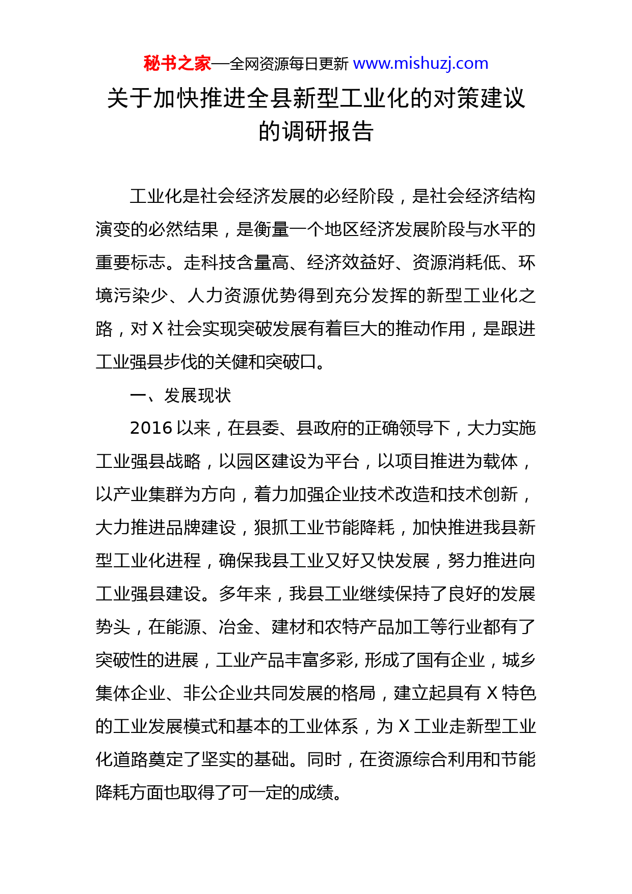 秘书之家—全网资源每日更新www.mishuzj.com关于加快推进全县新型工业化的对策建议的调研报告工业化是社会经济发展的必经阶段,是社会经济结构演变的必然结果,是衡量一个地区经济发展阶段与水平的重要标志。走科技含量高、经济效益好、资源消耗低、环境污染少、人力资源优势得到充分发挥的新型工业化之路,对X社会实现突破发展有着巨大的推动作用,是跟进工业强县步伐的关健和突破口。一、发展现状2016以来,在县委、县政府的正确领导下,大力实施工业强县战略,以园区建设为平台,以项目推进为载体,以产业集群为方向,着力加强企业技术改造和技术创新,大力推进品牌建设,狠抓工业节能降耗,加快推进我县新型工业化进程,确保我县工业又好又快发展,努力推进向工业强县建设。多年来,我县工业继续保持了良好的发展势头,在能源、冶金、建材和农特产品加工等行业都有了突破性的进展,工业产品丰富多彩,形成了国有企业,城乡集体企业、非公企业共同发展的格局,建立起具有X特色的工业发展模式和基本的工业体系,为X工业走新型工业化道路奠定了坚实的基础。同时,在资源综合利用和节能降耗方面也取得了可一定的成绩。秘书之家—全网资源每日更新www.mishuzj.com到2020年,全县生产总值(GDP)达151.87亿元,比全市平均水平4.4%高0.1个百分点,与全省增速持平,排全市第6位。其中:第二产业增加值完成24.93亿元,(其中工业增加值完成19.51亿元,同比增长1.6%);三次产业结构比为33.54:16.42:50.04,经济结构进一步优化,工业对经济社会发展的拉动作用明显增强。X县产业园区于2010年11月经毕节地区机构编制委员会批准成立,根据我县资源储备、地理条件和工业发展基础,采取“一园三区”模式进行规划建设,分别为野马川特色农产品加工园区、珠市装备制造园区、妈姑有色冶金铸造园区三个产业集聚区。省工信厅对园区产业发展规划批复规划面积15平方公里,目前园区建成面积约5平方公里,建设标准化厂房22万平方米,企业自建20万平方米,已使用标房面积40.8万平方米,标房使用率为97%,入园企业共计61家,其中规模工业企业26家、高新技术企业2家,带动就业5265人。2016年以来,X县紧紧围绕“工业强县”战略,依托丰富的铁矿资源和已形成的生铁冶炼为基础,以“铸造产业”为县域特色产业进行全面打造升级,基本形成了从铁矿石采矿、选矿、焙烧、冶炼到铸造的全产业链的格局。铸造产业的稳步发展实现矿产资源的本地转化利用,上游产业以铁矿开采冶炼、生铁铸造等,中游产业以燃气灶炉秘书之家—全网资源每日更新www.mishuzj.com头生产加工、地弹簧生产加工、挂锁生产加工等,下游产业以燃气灶炉头、地弹簧、挂锁成品供应、余热发电、固体废物回收利用等共同发展的铸造产业链基本形成,循环经济运行初见成效,奠定了我县“抓铁有痕”的特色产业发展格局,同时助力脱贫攻坚,带动解决群众就近就业问题。2020年,短流程铸造产业实现产值16.84亿元,以工业为主的二次产业成为拉动增长的中坚力量。二、主要经验1.抓项目招商,扩大经济总量。立足培育集群,围绕优势产业“差什么补什么”的思路,走项目招商、专业招商、产业招商的路子,不断扩大经济总量,推进全县工业经济快速增长。破解工业发展资本投入不足等困难和问题,坚定不移地实施项目带动战略,加大招商引资力度,加强与发达地区和周边地区的合作与交流,以提升工业技术水平、整合生产要素为重点,以项目为基础,以存量引增量,积极寻求战略合作伙伴参与我县重点工业建设。2.抓优势产业,打造产业集群。产业集群的形成,必须充分发挥该产业内骨干企业的核心作用,以骨干企业为依托,抓好产业延伸配套,着力培育一批集中度大、关联性强、集约化水平高的产业集群,提升工业发展的综合竞争力。一是根据产业发展定位和产业集群发展目标,重点围绕有色冶金、装备制造、农特产品加工等产业,以骨干企秘书之家—全网资源每日更新www.mishuzj.com业为核心抓产业延伸配套,实现集群发展。二是依托龙头企业来打造产业集群,积极帮助龙头企业在技改和新上项目上争取省、市技改贴息资金的支持,推进龙头企业实现强强联合,成为真正的产业龙头。三是引导民营中小企业以资本为纽带,采用联合、兼并、重组等方式靠拢大企业做大做强,形成龙头企业的上下游配套产业链,促进产业集群实现低成本扩张。3.抓企业创新,增强发展活力。创新是企业发展的灵魂,是企业做大做强的第一生产力和第一竞争力。按照建立现代企业制度的要求,坚定不移地推进制度创新和技术创新,激发企业内生动力,增强市场竞争力。4.抓新型工业,发展循环经济。发展循环经济是加快产业结构调整,实现可持续发展的必然要求。推进新型工业化,必须彻底转变粗放型经济增长方式,加快发展高能低耗型、环境友好型产业,大力发展循环经济,提高工业经济可持续发展能力。5.抓园区经济,构筑聚集平台。创新工作机制,改善投资环境,以产业园区建设为突破口,创建招商引资的良好平台。以园招商、以商建园、建快建设产业聚集、产出率高、用地集约、节能环保、持续发展、辐射带动力强的特色工业园区。特色工业园区建设计划采取“一次规划、分步实施、逐步开发”的方式进行。按照资源共享、集中要秘书之家—全网资源每日更新www