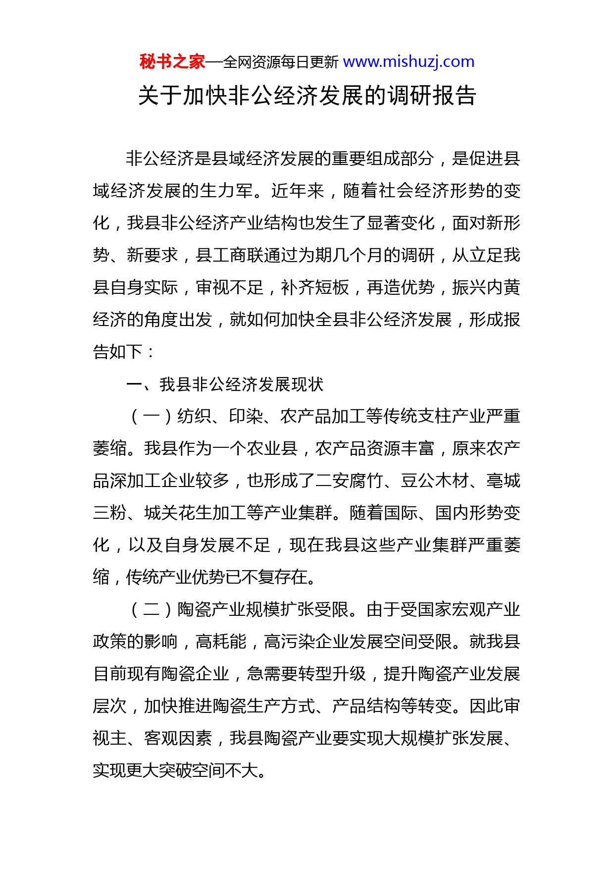 秘书之家—全网资源每日更新www.mishuzj.com关于加快非公经济发展的调研报告非公经济是县域经济发展的重要组成部分,是促进县域经济发展的生力军。近年来,随着社会经济形势的变化,我县非公经济产业结构也发生了显著变化,面对新形势、新要求,县工商联通过为期几个月的调研,从立足我县自身实际,审视不足,补齐短板,再造优势,振兴内黄经济的角度出发,就如何加快全县非公经济发展,形成报告如下:一、我县非公经济发展现状(一)纺织、印染、农产品加工等传统支柱产业严重萎缩。我县作为一个农业县,农产品资源丰富,原来农产品深加工企业较多,也形成了二安腐竹、豆公木材、亳城三粉、城关花生加工等产业集群。随着国际、国内形势变化,以及自身发展不足,现在我县这些产业集群严重萎缩,传统产业优势已不复存在。(二)陶瓷产业规模扩张受限。由于受国家宏观产业政策的影响,高耗能,高污染企业发展空间受限。就我县目前现有陶瓷企业,急需要转型升级,提升陶瓷产业发展层次,加快推进陶瓷生产方式、产品结构等转变。因此审视主、客观因素,我县陶瓷产业要实现大规模扩张发展、实现更大突破空间不大。秘书之家—全网资源每日更新www.mishuzj.com(三)我县目前产业结构发展不合理。纵观全县一、二、三产业发展,目前投资拉动主要靠房地产、城市道路等三产项目。投资大、科技含量高、财政贡献率高,拉动效益好的工业项目少,大项目少,工业发展龙头企业少。一产农业不优,二产工业不强,三产商业过度依赖房地产等。全县经济发展内生动力不足,经济发展潜力不大。(四)商业发展呈现散乱现象,没有专业园区、专业市场支撑,未形成产业集聚效应。尽管新区已建成了万洋建材市场,但县城老区仍存在洗车店、汽车维修、汽车销售网点随处可见。各类经营门店混杂,无序经营,产业集中度低,给城市管理和创卫带来麻烦和不便。二、我县民营企业主要诉求和存在问题(一)职能部门重视生产监管,对企业服务重视不够。近年来,作为攻坚战之一的污染防治工作摆在重中之重的突出位置,各相关部门主要人力、精力都放在对企业生产监管上,在服务指导企业整改方面做得还不到位,甚至出现“一刀切”现象,导致企业停产、限产。面对新形势、新要求、就如何指导企业解决企业实际困难和问题,助力企业健康发展工作不到位,如2017年度,陶瓷企业实际生产天数不足6个月。企业停产后造成工人没岗位,企业没效益,严重影响了陶瓷行业和地方经济发展。(二)融资难,企业需要良好的金融环境。由于金融秘书之家—全网资源每日更新www.mishuzj.com部门政策收紧,银行对企业出现抽贷、断贷现象,导致企业生产经营举步维艰,发展乏力,后劲不足。(三)非公企业家学习教育培训工作亟待加强。面对宏观经济运行下行压力较大,企业家对现实经济环境不乐观;再加上环保治理带来的冲击,企业家缺乏主动适应意识和能力。另外企业家缺乏创新意识,在企业管理提升、产业升级等方面束手无策。三、加快我县非公经济发展的建议(一)领导重视,政策支持,营造良好非公经济发展环境。领导对非公经济的重视决定了地方非公经济发展的态势。县委、县政府要把加快全县非公经济发展工作作为全县头等大事来抓。进一步充实我县非公经济领导小组,县委、县政府主要领导牵头,建立县领导和县直部门领导联系企业制度,畅通政企沟通渠道,创新一套有效帮办服务企业机制。建立民营经济发展考核、评价、监督、责任分解制度、倡导全社会“大众创业、万众创新”,重奖经济发展功臣,炒热全县广大党员干部干事创业思想。让企业家在政治上有安排、社会上有地位、经济上得实惠,营造加快发展的浓厚氛围,再掀非公经济发展新高潮。县委、县政府要切实解决非公经济发展中存在的困难和问题,要求政府职能部门提高服务意识,在严格执行国秘书之家—全网资源每日更新www.mishuzj.com家环境治理政策的前提下,进一步完善环境管控措施,实施精准管控。积极协调金融部门拓宽融资渠道,加大融资力度,建立政银企三方协调联动机制,分领域、分行业,持续发展银企对接活动,为中小企业发展提供资金支持。同时,县委、县政府积极向上级争取扶持资金,搭建各种创业平台,积极吸纳社会就业。同时放开投资领域,鼓励社会有志之士创业,盘活社会民间资金,奏响经济发展大合唱。(二)搭建平台,整合资源,引领非公经济繁荣发展。加快工业园区建设,发挥园区的产业带动作用。在现有工业园区,盘活僵尸企业,淘汰落后产能,减少土地浪费。同时加快老企业入园步伐,形成规模效应。发挥产业集聚作用,减少政府管理成本。规划各类专业市场,加快商业入市步伐。按照“建一处市场、兴一个产业、富一方百姓”的思路,在县城附近规划建设一些专业市场。比如:汽车销售、维修、家电、五金销售、门窗加工等专业市场。一方面避免商户无序经营,给创卫和大气污染防治带来困难;另一方面形成专业有影响市场,有利于行业做强做大,形成产业集群,辐射带动周边,甚至影响其他县区,进一步繁荣膨胀我县非公经济。(三)吸引外资,激活内资,以商会建设为契机,促秘书之家—全网资源每日更新www.mishuzj.com进非公经济大发展。商会在非公经济发展中往往能起到举足轻重的作用。发挥内黄在外地商会作用,利