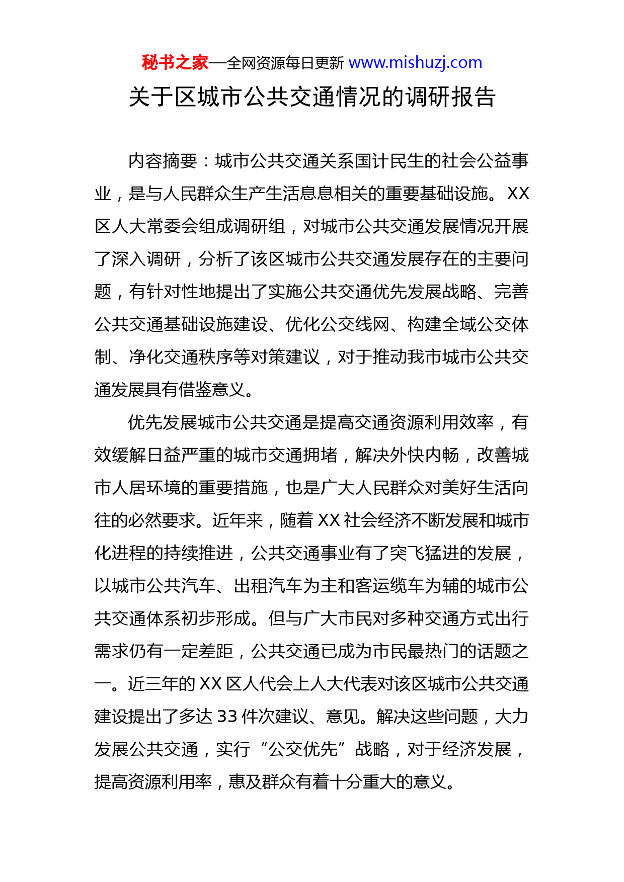 秘书之家—全网资源每日更新www.mishuzj.com关于区城市公共交通情况的调研报告内容摘要:城市公共交通关系国计民生的社会公益事业,是与人民群众生产生活息息相关的重要基础设施。XX区人大常委会组成调研组,对城市公共交通发展情况开展了深入调研,分析了该区城市公共交通发展存在的主要问题,有针对性地提出了实施公共交通优先发展战略、完善公共交通基础设施建设、优化公交线网、构建全域公交体制、净化交通秩序等对策建议,对于推动我市城市公共交通发展具有借鉴意义。优先发展城市公共交通是提高交通资源利用效率,有效缓解日益严重的城市交通拥堵,解决外快内畅,改善城市人居环境的重要措施,也是广大人民群众对美好生活向往的必然要求。近年来,随着XX社会经济不断发展和城市化进程的持续推进,公共交通事业有了突飞猛进的发展,以城市公共汽车、出租汽车为主和客运缆车为辅的城市公共交通体系初步形成。但与广大市民对多种交通方式出行需求仍有一定差距,公共交通已成为市民最热门的话题之一。近三年的XX区人代会上人大代表对该区城市公共交通建设提出了多达33件次建议、意见。解决这些问题,大力发展公共交通,实行“公交优先”战略,对于经济发展,提高资源利用率,惠及群众有着十分重大的意义。秘书之家—全网资源每日更新www.mishuzj.comXX区人大常委会高度重视,把XX区城市公共交通发展情况列入了2018年度的重要调研课题,责成区人大城环工委(调研组)完成。区人大常委会副主任郑勇带领调研组通过实地察看、座谈、走访及外出考察等方式,对XX区城市公共交通发展情况进行了调研。通过汇总梳理分析各方面情况,形成了XX区城市公共交通发展情况调研报告。一、XX区城市公共交通发展基本情况(一)XX城区概况XX区位于重庆主城区东部,是一小时经济圈和渝东北、渝东南连接枢纽,重庆主城东大门。城区由菩提、凤城、晏家、江南、渡舟、新市和八颗7个街道组成,城区面积395平方公里。全区户籍人口89.2万人,城镇人口38.7万人,城镇化率64.4%。城区发展主导方向为向北扩展,形成以菩提山、牛心山为主体的城市绿心,以承担城市生活服务职能的中心城区和工业发展为主的经开区,以城区7个街道为组团的“一心两片八组团”的空间结构。(二)城市公共交通基本情况近年来,在XX区委、区政府的高度重视下,区交委及有关部门按照优先发展、整体规划、稳步推进、逐步实施的工作思路,在公交线路开辟、站点设置、票价确定等方面实行有效管理,初步形成了以公交车为主、以出租车和XX缆车为辅的公共交通体系。秘书之家—全网资源每日更新www.mishuzj.com1.公共汽车XX公交组建于2006年11月,现有运营企业两户,一是凤城公共交通有限公司(以下简称凤城公交),由市级国资(重庆市汽车运输集团有限公司出资51%)与区民营企业(亿思达实业公司出资49%)合资,为公私合资企业;二是重庆市汽车运输(集团)有限责任公司XX公交公司(以下简称渝运公交),为国有独资企业。目前,两家公司有从业人员共429人(其中驾驶员302人);城市公共汽车196辆(中级中型公共汽车128辆,普通中型公共汽车68辆。其中,凤城公交公司158辆,渝运公交公司38辆),万人公交车保有量[1]为5.06辆,总座位数9770座,公交线路12路,公交线网长度211.48公里,日均公交客流量约7.9万人次,日均班次2836班,公交分担率[2]为16%,线路基本覆盖菩提、凤城、渡舟、江南、晏家等组团;公交各线路均为无人售票乘车,采取单一票制和多票制结合的收费方式(公交103路、109路为多票制,其他线路为一票制),2006年至今从未调整票价,中级中型公交车起步价为1.5元/人,普通中型公交车为1元/人,收费最高为公交109路B线(火车北站-川维),全程25.6公里,票价4元/人;XX公交已开展IC卡刷卡乘车业务,截止到2018年2月底,全区共发行公交市民卡192116张(其中天翼市民卡17381张),65周岁以上秘书之家—全网资源每日更新www.mishuzj.com老年人敬老卡62645张,革命伤残军人、因公致残人民警察、盲人、一二类残疾人免费卡2316张,三四类残疾人半价优惠卡3457张,各类公交卡合计发行量为260534张,但从未发行过学生优惠卡;在公交免费和优惠服务方面,市民卡刷卡享受10%优惠,65周岁以上老年人、革命伤残军人、因公致残人民警察、盲人、一二类残疾人每年享受不超过900元的公共汽车免费乘车优惠,三四类残疾人充值后销售半价优惠;公交政府补贴方面,2017年区政府支付CNG区级补贴384.72万元,购买公共服务758.84万元。2006年以来,公交公司累计亏损约5000万元。2、出租汽车XX区出租汽车发展于上世纪90年代初,现有参营企业6户,巡游出租汽车(以下简称巡游车)362辆,网络预约出租汽车(以下简称网约车)59辆。其中民营股份制企业共5户,分别为重庆市XX区众悦出租有限责任公司(拥有巡游车111辆),重庆XX区金山出租客运有限公司(拥有巡游车105辆),重庆恒发出租汽车有限公司(拥有巡游车27辆),重庆XX区寿星汽车运输有限公司(拥有巡游车67辆),重庆环球出租汽车有限公司(拥有巡游车32辆),另有重庆市汽车运输(集团)有限责任公司六分公司(简称渝运六分公司,拥有巡游车20辆,网约秘书之家—全网资源每日更新www.mishuzj.com车50辆)为市属国资企业。车型主要为“长安铃木天语”5座小型轿车,2017年3月重新投放到期51辆巡游车时,城区人口万人巡游出租汽车拥有量为9