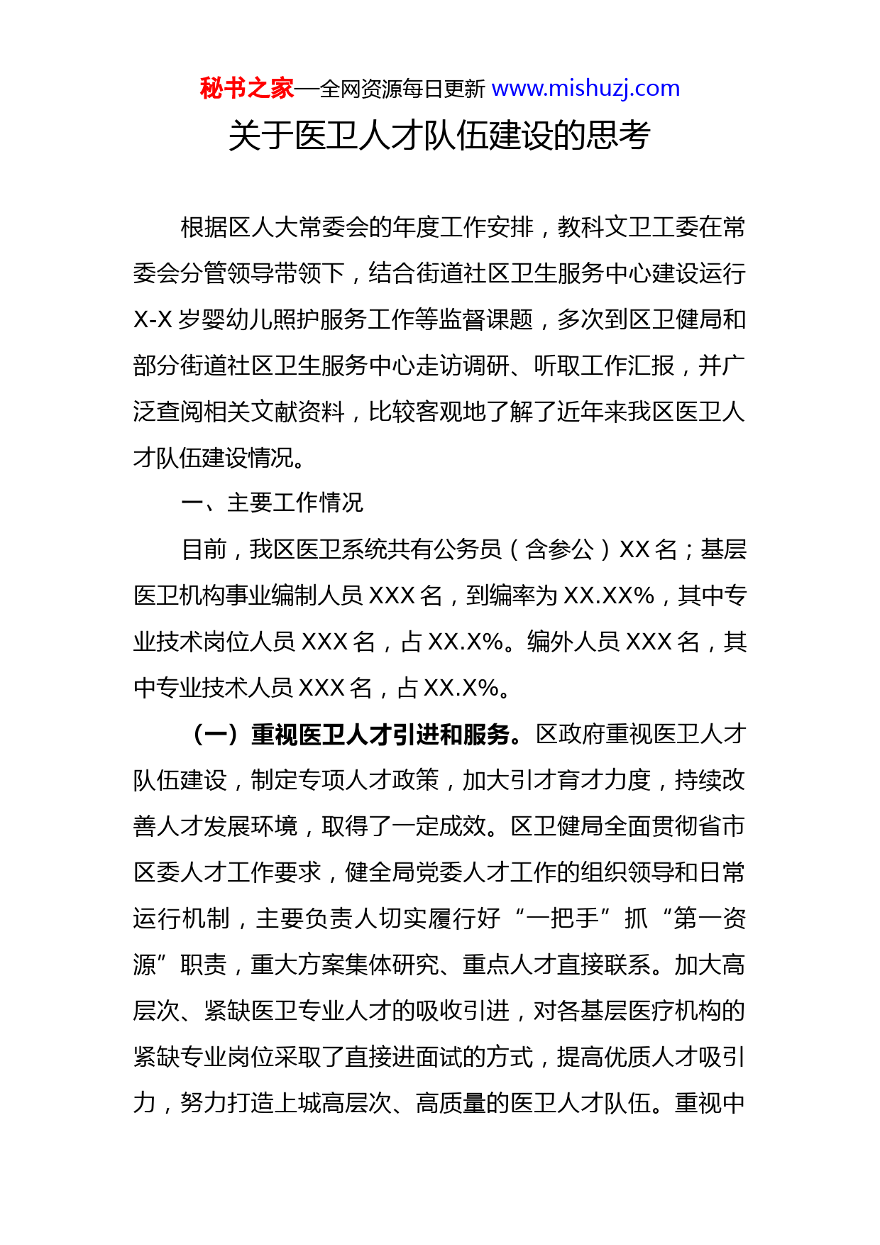 秘书之家—全网资源每日更新www.mishuzj.com关于医卫人才队伍建设的思考根据区人大常委会的年度工作安排,教科文卫工委在常委会分管领导带领下,结合街道社区卫生服务中心建设运行X-X岁婴幼儿照护服务工作等监督课题,多次到区卫健局和部分街道社区卫生服务中心走访调研、听取工作汇报,并广泛查阅相关文献资料,比较客观地了解了近年来我区医卫人才队伍建设情况。一、主要工作情况目前,我区医卫系统共有公务员(含参公)XX名;基层医卫机构事业编制人员XXX名,到编率为XX.XX%,其中专业技术岗位人员XXX名,占XX.X%。编外人员XXX名,其中专业技术人员XXX名,占XX.X%。(一)重视医卫人才引进和服务。区政府重视医卫人才队伍建设,制定专项人才政策,加大引才育才力度,持续改善人才发展环境,取得了一定成效。区卫健局全面贯彻省市区委人才工作要求,健全局党委人才工作的组织领导和日常运行机制,主要负责人切实履行好“一把手”抓“第一资源”职责,重大方案集体研究、重点人才直接联系。加大高层次、紧缺医卫专业人才的吸收引进,对各基层医疗机构的紧缺专业岗位采取了直接进面试的方式,提高优质人才吸引力,努力打造上城高层次、高质量的医卫人才队伍。重视中秘书之家—全网资源每日更新www.mishuzj.com青年人才队伍的培养和人才梯队建设,加强党委联系服务高层次人才工作,积极做好高层次人才结对联系走访等工作,根据省市区人才优惠政策,为医卫人才在上城发展提供服务和保障。紧紧依托省、市医院医生在晋升专业技术职务前到基层服务政策,积极引入省市两级医院专家到基层医疗机构开展门诊、查房、讲座、带教等项目,提高基层医疗服务能力,造福辖区居民群众。(二)重视医卫人才培养和提升。强调医师规范化培训,把通过住院医师规范化培训作为我区入职医师的底线要求,近年来我区基层医卫机构招聘的百余名全日制医学专业毕业生,全部参加过住院医师规范化培训。通过培训,医卫工作人员将理论与实际紧密结合,熟练掌握了标准化的医卫工作操作流程。加强助理全科医生培训和全科医生转岗培训,充实基层全科医生队伍。基层医卫人才队伍整体业务素质得到明显提升。加强继续医学教育,实行与医卫技术人员、单位考核挂钩制度。采取“集中培训”“以会代训”“远程培训”等培训方式,培训率达XXX%。通过全面开展基层岗位练兵和技能竞赛活动,提高了医卫专业技术人员的理论水平和实践操作技能。出台文件,规定凡是在职获取上一级学历的,除在时间上给予一定支持外,学成后报销学费,对发表论文者各基层单位按层次给予不同奖励等,鼓励医卫人才提高专业理论水平。根据基层医卫机构专业技术水平提升的需秘书之家—全网资源每日更新www.mishuzj.com求和基层健康服务工作的特点,与浙医二院建立全面战略合作,签订专项培训暨技术指导协议。借力“双下沉、两提升”工程,通过“人才下沉、资源下沉”,引导省市优质医卫资源流向基层,强化基层专业技术能力提升。重视对基层卫生管理干部的培训,采取“请进来”和“走出去”方式,针对我区医卫系统管理现状,对中青年骨干、各中心班子成员进行系统培训,在深化医卫体制改革的过程中,强化医院的管理与服务体系建设,提升基层医卫机构的服务和综合管理水平力求达到管理科学化、规范化、精细化。(三)重视医卫人事制度改革和发展。在医卫专业技术人员中,发挥职称晋升的调节、激励作用。同时建立体现按岗位、按任务、按业绩定酬和向优秀人才、关键岗位倾斜的分配指标体系。在卫生管理人才选拔任用中,严格按照《干部选拔任用工作条例》有关规定,鼓励广大干部职工在岗成才,注重德才兼备、工作实绩和群众公认的原则,推动形成正确用人导向。按照《关于事业单位岗位设置管理的实施意见》和《关于事业单位专业技术岗位实行竞聘上岗的指导意见》的要求,在基层医卫机构中全面推行专技人员实名制登记入库,形成竞聘上岗、全员聘用、按岗聘用、合同管理的竞争性用人机制,并初步形成岗位聘用能进能出、能上能下的管理机制。全面推行绩效工资制度,允许基层医疗机构将医疗纯收入的XX%以内用于绩效工资的发放,并建立以服务秘书之家—全网资源每日更新www.mishuzj.com数量、服务质量和服务对象满意度及履行岗位职责情况的考核机制;基层医卫机构绩效工资分配,向一线倾斜,着力体现医卫人员知识、技术和劳务价值。建立和谐劳动关系,为编外人员及时购买“五险一金”,在休假、培训、职称晋升和评优评先等方面,与在编人员享有同等待遇,基本实现编制内外人员同工同酬。二、存在问题困难区政府及相关部门在加强医卫人才队伍建设方面做了不少工作,取得了一定成效,但与事业发展需要和社会普遍期望相比,仍然存在一些问题和不足。(一)政府投入保障机制有待进一步加强1.人员编制和工作任务不匹配。随着服务人口的增加和居民群众健康需求的提高,我区基层医卫机构规模、科室设置、人员结构都发生了较大变化,编制核定数没有随之提高造成全区医卫系统总体编制数不足。编制不足问题在全额或参公事业单位中比较突出。以区疾控中心为例,近年来随着疾控业务的拓展和细化,疾控工作任务大幅增加,加之辖区省市医疗机构密集,传染病管理与疫情