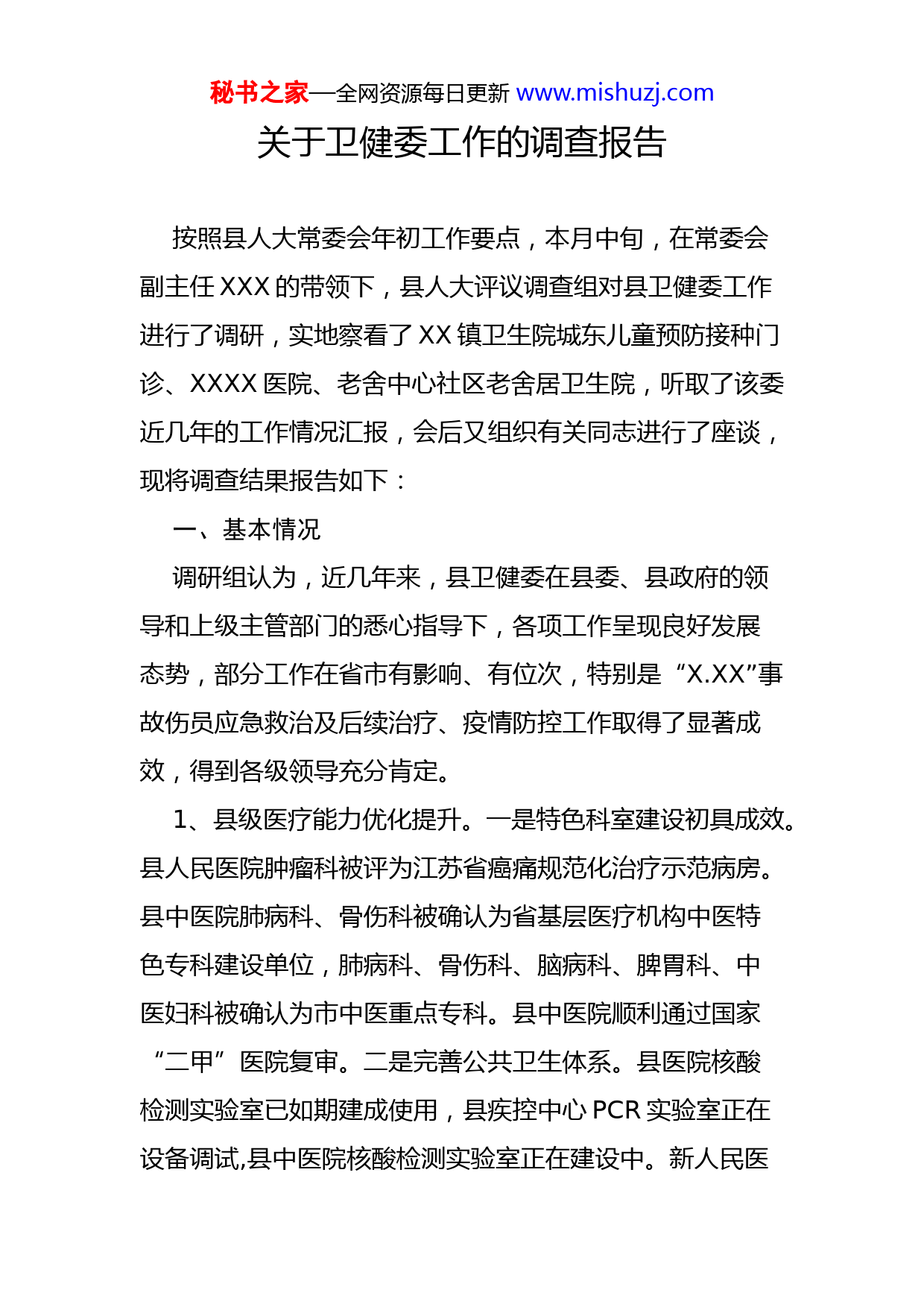 秘书之家—全网资源每日更新www.mishuzj.com关于卫健委工作的调查报告按照县人大常委会年初工作要点,本月中旬,在常委会副主任XXX的带领下,县人大评议调查组对县卫健委工作进行了调研,实地察看了XX镇卫生院城东儿童预防接种门诊、XXXX医院、老舍中心社区老舍居卫生院,听取了该委近几年的工作情况汇报,会后又组织有关同志进行了座谈,现将调查结果报告如下:一、基本情况调研组认为,近几年来,县卫健委在县委、县政府的领导和上级主管部门的悉心指导下,各项工作呈现良好发展态势,部分工作在省市有影响、有位次,特别是“X.XX”事故伤员应急救治及后续治疗、疫情防控工作取得了显著成效,得到各级领导充分肯定。1、县级医疗能力优化提升。一是特色科室建设初具成效。县人民医院肿瘤科被评为江苏省癌痛规范化治疗示范病房。县中医院肺病科、骨伤科被确认为省基层医疗机构中医特色专科建设单位,肺病科、骨伤科、脑病科、脾胃科、中医妇科被确认为市中医重点专科。县中医院顺利通过国家“二甲”医院复审。二是完善公共卫生体系。县医院核酸检测实验室已如期建成使用,县疾控中心PCR实验室正在设备调试,县中医院核酸检测实验室正在建设中。新人民医秘书之家—全网资源每日更新www.mishuzj.com院、新县疾控中心可望年内开工建设,精神病院建设正在制订规划方案,有望尽期完成选址或改造计划。扎实开展基本公共卫生服务,为居民建立健康档案,电子档案建档率达90%以上。三是加强医疗人才队伍建设。积极争取省全科医生培训计划数,安排24名医生到盐城市一院和市三院参加全科医生转岗培训,是我县历史上最多的一年,超额补齐了全科医生短板。2、镇村卫健体系提档升级。一是镇村卫生基础条件明显改善。XXXX医院创造了医疗卫生机构建设的“盐城速度”,是全市占地面积最大、建设标准最高、设施配置最全的一级综合医院。双港镇卫生院被省授予省级示范乡镇卫生院;立礼村、小港村、合心村、四烈村、大通村、高场村等六个卫生室被省授予省级示范村卫生室。二是积极推进医疗联合体建设。市一院、县人民医院、XXXX医院结成全省首家市县镇三级紧密型医联体,得到市政府主要领导肯定。三是做优中医服务。XX镇卫生院针灸推拿科,小尖、六套等镇卫生院中医康复科等被确认为市基层医疗卫生机构特色科室。六套、XX镇等8个镇卫生院已通过省基层机构中医综合服务区(中医馆)能力建设项目验收,其他卫生院均通过市级验收,七套卫生院被授予省“乡镇卫生院示范中医科”。秘书之家—全网资源每日更新www.mishuzj.com3、医疗服务模式不断创新。基本公共卫生“签约服务网格化管理模式”经验被写入省卫健委、省财政厅联合印发的《关于做好建档立卡低收入人口家庭医生签约服务网格化管理和免费健康体检工作的通知》(苏卫基层〔2019〕7号)文件。创新实施的“爱心药品惠万家”免费健康扶贫项目,在上海全国药政工作会议上作经验介绍。全市首家建成“互联网+医疗废水、废物处置”在线监测系统,并在全市推广。另外,获得全省“病媒生物防控单项控制达标先进城市称号”,顺利通过全国中医药先进县复审,其综合得分名列全市第一名。4、高度重视人大建议意见。认真贯彻落实人大决议决定,积极配合人大视察调研,重视人大常委会审议意见和代表建议批评和意见办理,成立专班,专题研究,与每一个代表进行面对面沟通,制订切实可行的措施,今年4个代表建议已全部办结。二、存在问题与不足1、医疗服务能力亟待提升。一是医疗资源总量存在不足,有待优化。我县每千人执业(助理)医生数、每千人床位数低于全省平均水平;每万人口全科医生数低于盐城市定标准。县级住院床位较为紧张,长期超负荷运转,中医诊治作用发挥受到影响。二是基本药物明显滞后人民群众不断增长的健康需求和病症多变的现实,给医生和患者都带秘书之家—全网资源每日更新www.mishuzj.com来很大的不便。在基层,特别是村卫生室,基本药物不仅品种少,有的还不全。对基本药品的品种及生产厂家不满意已成为部分群众不愿参加家庭医生签约服务的主要原因之一。三是基层医疗服务能力有待增强。一些镇卫生院受业务人员、设施设备等因素限制,部分临床科室、医技科室难以运行,无法全面提供与其功能定位相适应的基本医疗卫健服务。2、医护人才缺乏问题突出。一是医务人员总量不足。县医院核定编制数314人,已超编137人;县中医院核定编制数94人,已超编53人。按照床人比1:1.6的县级医疗单位岗位设置原则,县医院、中医院应当核定编制数应为928名、480名,缺口编制分别为623名、386名。二是人员结构不合理。全县卫健系统高级职称大部分集中在城区医院,基层卫生院本科以上的不多,其中妇产、儿科、公共卫健、医学影像等专业人才更是短缺。村医队伍普遍存在年纪大、知识老化问题,老村医年年减少、新村医补充不了,结构断层现象突出。三是人才招录方式有待优化。医疗卫健机构的用人招录方式和程序尚需改进,特别是在硕士以上人才受开考人数比例限制条件,一定程度上影响了医疗卫健机构人员招录数量。3、管理制度建设需要加强。一是医疗制度建设方面还需加强,医务人员大处方、辅助检查过多现象仍有发生。公秘书之家—全网