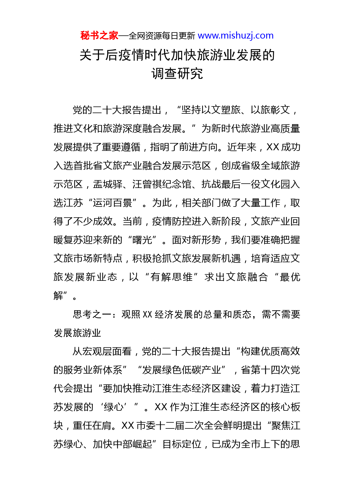 秘书之家—全网资源每日更新www.mishuzj.com关于后疫情时代加快旅游业发展的调查研究党的二十大报告提出,“坚持以文塑旅、以旅彰文,推进文化和旅游深度融合发展。”为新时代旅游业高质量发展提供了重要遵循,指明了前进方向。近年来,XX成功入选首批省文旅产业融合发展示范区,创成省级全域旅游示范区,盂城驿、汪曾祺纪念馆、抗战最后一役文化园入选江苏“运河百景”。为此,相关部门做了大量工作,取得了不少成效。当前,疫情防控进入新阶段,文旅产业回暖复苏迎来新的“曙光”。面对新形势,我们要准确把握文旅市场新特点,积极抢抓文旅发展新机遇,培育适应文旅发展新业态,以“有解思维”求出文旅融合“最优解”。思考之一:观照XX经济发展的总量和质态,需不需要发展旅游业从宏观层面看,党的二十大报告提出“构建优质高效的服务业新体系”“发展绿色低碳产业”,省第十四次党代会提出“要加快推动江淮生态经济区建设,着力打造江苏发展的‘绿心’”。XX作为江淮生态经济区的核心板块,重任在肩。XX市委十二届二次全会鲜明提出“聚焦江苏绿心、加快中部崛起”目标定位,已成为全市上下的思秘书之家—全网资源每日更新www.mishuzj.com想共识和自觉行动。旅游业是低碳产业、“无烟工业”,完全符合绿色低碳的发展方向,是践行新发展理念、推进高质量发展的题中应有之义。从发展质态看,XX去年“双超”千亿,蝉联“双百强”。但细想一想,全市旅游业增加值占GDP份额是多少?旅游业的贡献度有多大?老百姓在旅游业这块不大的蛋糕中分得了多少?尽管数字说不准,但实际的成效大家心知肚明。从产业走向看,毋庸讳言,制造业仍是“十四五”期间支撑全市经济社会发展的“强引擎”“压舱石”,要继续“挑大梁”,但同时受“三区三线”划定、资源环境约束趋紧、要素成本上升等多方面影响,“能耗”“环保”“土地”等瓶颈制约越来越多,可承载和拓展的空间会越来越小。旅游业如何抢抓大运河文化带建设等国省战略机遇,主动作为,及时补位,形成新的增长极,作用不可小觑。从周边发展看,溧阳、宜兴、常熟等地,无论是经济总量,还是一二三产的配比,非常均衡合理,旅游业的盘子做得越来越大。溧阳市2021年三次产业增加值比例为4.5∶51.4∶44.1,旅游总收入229.35亿元,旅游业增加值占GDP比重超12%。为XX树立了学习的样本和追赶的标杆,呈现出XX未来发展的现实模样。秘书之家—全网资源每日更新www.mishuzj.com思考之二:XX旅游业发展取得了长足进步,还要不要做些基础性工作近几年,XX文旅搞了些动作,摘得了一些牌子,产生了一些效应,举办“西堤营地七夕音乐会”“好事成双·新春大集”等活动,获评“首批长三角高铁旅游小城”等,对推动旅游业发展起到了一定作用,但旅游业的基础性工作未必扎实。此项工作不容忽视,依然至关重要,大致有这么几个方面。旅游资源的调查摸底。按照“吃住行游购娱”全链条,把旅游业的家底摸得清清楚楚、明明白白。比如,在“吃”的方面,有哪些名宴?哪些名菜?哪些名小吃?哪些名特产?包括能吃到这些地道美食的宾馆、饭店、农家乐、苍蝇馆、路边摊,等等,所有这些都要摸清楚,不仅仅是为了登记造册,绘成“美食地图”,更是为了将“吃”上升到“美食文化”的高度,将美食文化作为新的特色旅游项目来打造,打响品牌,尤其重视早餐早茶文化等等。目前,最需要关注和重视的是“住”的问题,全市宾馆酒店共305家,有9859张床位。其中,星级酒店华侨、加洲,包括未纳入星级管理的波司登、汇富、全季酒店在内,最多可接待住宿旅客1262人。既缺承接大型会议的高档宾馆,也缺经济型酒店,还缺特色民居民宿。一旦遇到游客“井喷”,只能“扎手”。只有摸清家底,才能秘书之家—全网资源每日更新www.mishuzj.com心中有数,找准问题,有的放矢。文化资源的深度挖掘。一直自认为是文化资源大市,文物众多,积淀深厚,但大多“养在深闺人未识”,放到全省乃至全国去审视,未必“天下谁人不识君”。对现有文物、遗存、历史建筑、文化现象等要进行深度挖掘,特别是要研究XX邮文化在全国独树一帜的地位,搞清楚运河文化之于XX的特殊性及对大运河文化带影响,弄明白“二王”在训诂学中的影响及训诂学对中国语言学的贡献,探讨秦少游在宋词(婉约派)的地位,研究汪曾祺在现当代文学史的地位及对中国文学的影响,扩大抗战最后一役红色文化影响,包括非物质文化遗产的总类和价值,等等。同时,还要研究挖掘这些文化传承及其内在联系。不能自说自话,王婆卖瓜。XX号称文化人很多,要体现应有的担当和胸襟。不能仅仅热衷于自己的“城市考古”,还需要“走出去”,联手名家大师、名院大所,开展研讨会、报告会、文化沙龙等形式,以权威的方式把研究的成果固化下来,宣传出去,推广开来,使之更有说服力,扩大影响力,焕发生命力。基础设施的配套完善。以旅游的思维,从游客的视角,对旅游基础设施进行全面审视。硬件方面,借鉴先进地区的好经验好做法,统筹规划全市路网、停车、旅游集散地、游客中心等基础设施和配套设施,与全域旅游、智秘书之家—全网资源每日更新www.mishuzj.com慧旅游相配套,实现旅游交通、旅游厕所、旅游标识系统、生态慢行系统、旅游公共服务全覆盖。软件方面,培养文化自信,做好文化解读
