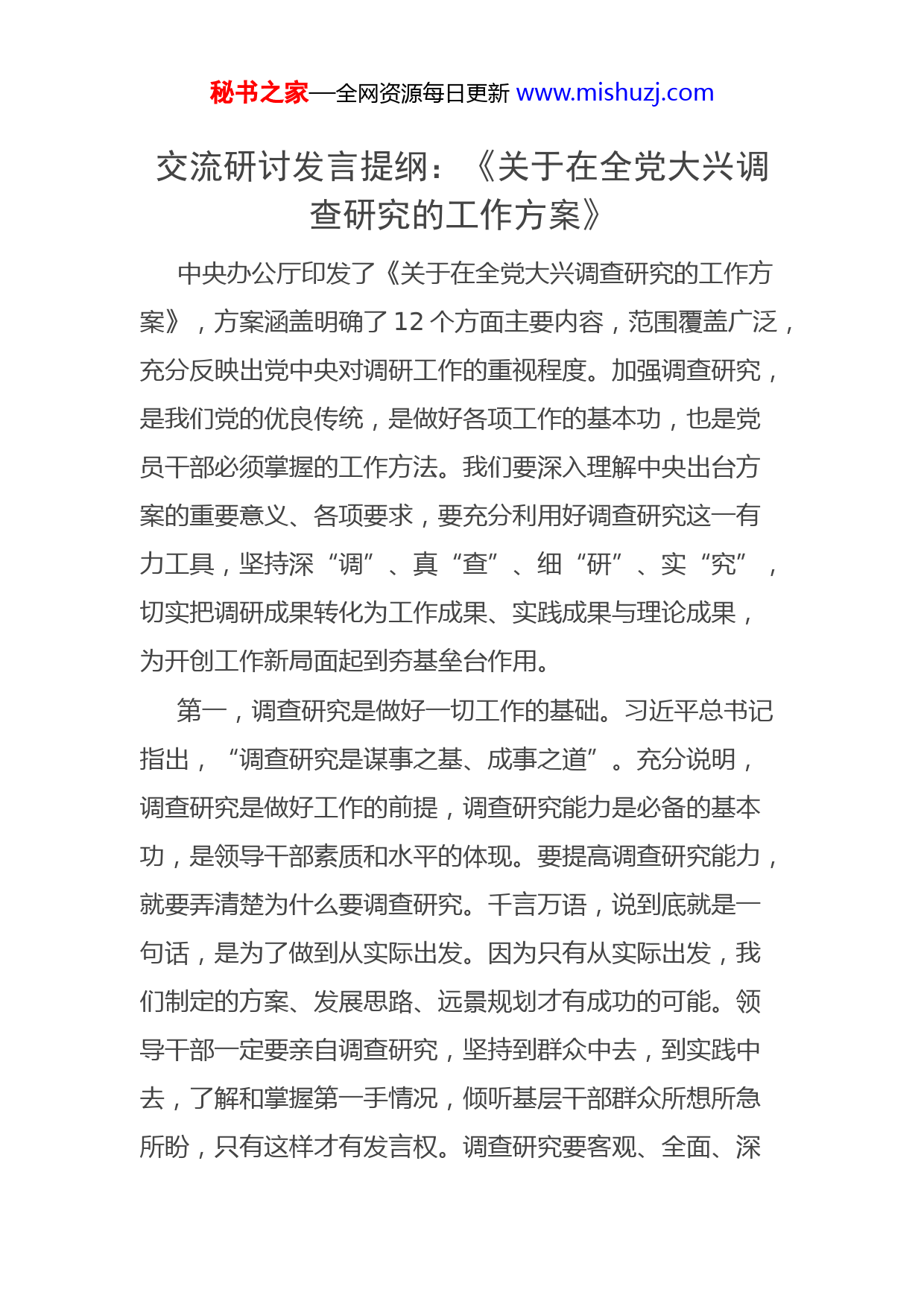 秘书之家—全网资源每日更新www.mishuzj.com交流研讨发言提纲:《关于在全党大兴调查研究的工作方案》中央办公厅印发了《关于在全党大兴调查研究的工作方案》,方案涵盖明确了12个方面主要内容,范围覆盖广泛,充分反映出党中央对调研工作的重视程度。加强调查研究,是我们党的优良传统,是做好各项工作的基本功,也是党员干部必须掌握的工作方法。我们要深入理解中央出台方案的重要意义、各项要求,要充分利用好调查研究这一有力工具,坚持深“调”、真“查”、细“研”、实“究”,切实把调研成果转化为工作成果、实践成果与理论成果,为开创工作新局面起到夯基垒台作用。第一,调查研究是做好一切工作的基础。习近平总书记指出,“调查研究是谋事之基、成事之道”。充分说明,调查研究是做好工作的前提,调查研究能力是必备的基本功,是领导干部素质和水平的体现。要提高调查研究能力,就要弄清楚为什么要调查研究。千言万语,说到底就是一句话,是为了做到从实际出发。因为只有从实际出发,我们制定的方案、发展思路、远景规划才有成功的可能。领导干部一定要亲自调查研究,坚持到群众中去,到实践中去,了解和掌握第一手情况,倾听基层干部群众所想所急所盼,只有这样才有发言权。调查研究要客观、全面、深秘书之家—全网资源每日更新www.mishuzj.com入、公正,多看实地,多听各方面的意见。对于调查得来的大量材料和情况要认真研究分析,以“去粗取精、去伪存真、由此及彼、由表及里”的“改造制作功夫”,形成客观真实的调查结果。调查研究的结果应当及时转化为决策部署,转化为具体措施、实际行动。对已经成为决策部署的,要及时跟踪评估,视情况调整,直到使之符合客观实际、符合发展规律、合乎人心民意。当前,我们正处在百年未有之大变局中,新情况、新课题层出不穷,老问题、老矛盾有新变化,新经验、新创造火花闪烁。这些“新”折射着纷繁复杂的现象,提示着前进路上的风险,也蕴藏着社会进步的密码,散发着群众智慧的灵光。然而,这些必须也只能靠深入调查研究才能发掘、梳理、归纳、提炼、升华,最终产生不断前行的智慧与力量。调查研究的成果和质量如何,形成的意见正确与否,最终都要由人民群众的实践来检验。从这个意义上讲,调查研究是党风、政风的再现,实事求是作风建设的试金石。第二,调查研究是关系党和人民事业得失成败的大问题。调查研究是谋事之基、成事之道。习近平总书记在不同场合反复强调,用好调查研究这一我们党的“传家宝”,练好调查研究这项“基本功”。面对新矛盾、新问题,领导干部要了解真实情况,掌握工作主动权,作出科学决策,秘书之家—全网资源每日更新www.mishuzj.com深入实地的调查研究必不可少。今年是全面贯彻落实党的XX大精神开局之年,是实施“十四五”规划承上启下的关键之年。越是开局之年、关键之年,我们越要大兴调查研究之风,为全面贯彻全国两会关于经济社会发展各项部署,做好基本功,打好提前量。大兴调查研究之风,练就科学决策真功夫。只有真正沉下去,奔波在基层,重视并且善于调查研究,才能了解真情况、发现真问题、找到真药方,站到新的进发点上。调查研究的过程就是科学决策的过程,既省略不得、又马虎不得。做好调查研究工作,要有眼睛向下的兴趣和决心。只有深入基层掌握第一手材料、听取职工群众心声,努力把真实情况掌握得更多一些、把工作中存在的差距和不足找得更准一些,细致入微地做好调查研究,才能为解决问题、提高工作质效奠定坚实基础。大兴调查研究之风,要求我们到现场、到生产第一线。领导干部要多深入现场,多为现场会、观摩会、推进会营造轻松愉悦的氛围,积极引导职工群众展开讨论,让职工群众知无不言,言无不尽。要让做得好的地方、单位、个人现身说法,让职工群众现场看、现场悟、现场学,做到“拨亮一盏灯,照亮一大片”,不断推动各项工作取得新进展。第三,调查研究要重视方式方法。调查研究首先要站稳人民立场,想问题、作决策、办事情都要想一想是不是站秘书之家—全网资源每日更新www.mishuzj.com在人民立场上、是不是有助于解决群众急难愁盼问题、是不是有利于增进人民福祉,增强人民群众的获得感、幸福感、安全感,同时,调查研究成果的质量如何、形成的意见正确与否,最终都要由人民群众实践来检验。实现中华民族伟大复兴的中国梦是新时代赋予中国共产党人的历史使命,是一项前所未有的开创性事业。前进道路上,不可避免会出现许多难以预料的风险、挑战,只有始终坚持并不断加强调查研究,才能真正做到一切从实际出发、理论联系实际、实事求是,真正保持党同人民群众的血肉联系,才能从根本上保证党的路线方针政策和各项决策的正确制定与贯彻执行,才能在工作中尽可能防止和减少失误,及时迅速纠正错误。调查研究,是对客观实际情况的调查了解和分析研究,目的是把事情的真相和全貌调查清楚,把问题的本质和规律把握准确,把解决问题的思路和对策研究透彻,我们要有明确的目的,带着问题下去,尽力掌握调研活动的主动权,要扑下身子、沉到一线,迈开步子、走出院子,到车间码头,到田间地头,到市场社区,亲自察看、亲身体验。要多层次、多方位、多渠道地调查了解情况,既
