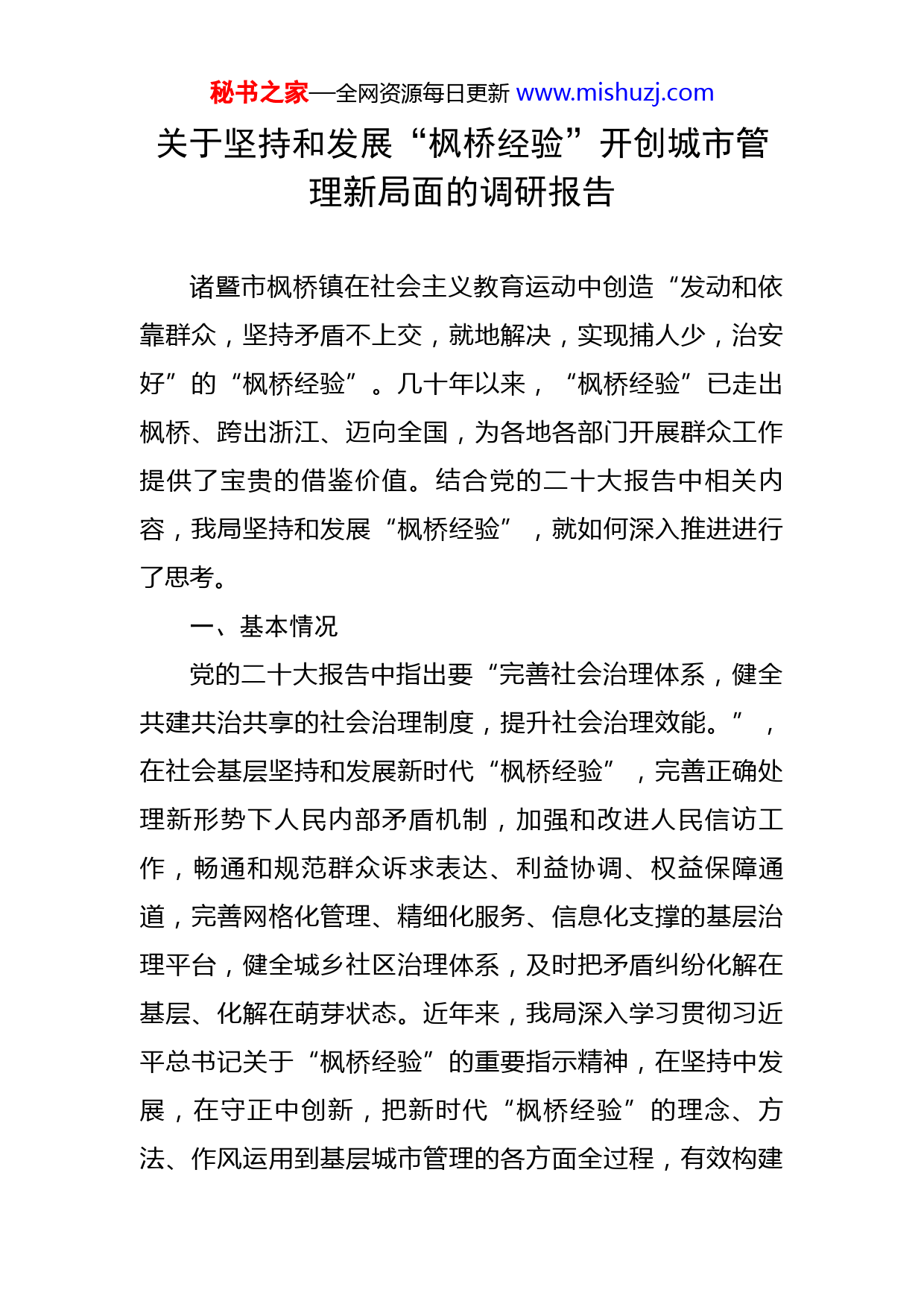 秘书之家—全网资源每日更新www.mishuzj.com关于坚持和发展“枫桥经验”开创城市管理新局面的调研报告诸暨市枫桥镇在社会主义教育运动中创造“发动和依靠群众,坚持矛盾不上交,就地解决,实现捕人少,治安好”的“枫桥经验”。几十年以来,“枫桥经验”已走出枫桥、跨出浙江、迈向全国,为各地各部门开展群众工作提供了宝贵的借鉴价值。结合党的二十大报告中相关内容,我局坚持和发展“枫桥经验”,就如何深入推进进行了思考。一、基本情况党的二十大报告中指出要“完善社会治理体系,健全共建共治共享的社会治理制度,提升社会治理效能。”,在社会基层坚持和发展新时代“枫桥经验”,完善正确处理新形势下人民内部矛盾机制,加强和改进人民信访工作,畅通和规范群众诉求表达、利益协调、权益保障通道,完善网格化管理、精细化服务、信息化支撑的基层治理平台,健全城乡社区治理体系,及时把矛盾纠纷化解在基层、化解在萌芽状态。近年来,我局深入学习贯彻习近平总书记关于“枫桥经验”的重要指示精神,在坚持中发展,在守正中创新,把新时代“枫桥经验”的理念、方法、作风运用到基层城市管理的各方面全过程,有效构建秘书之家—全网资源每日更新www.mishuzj.com起党建统领“四治融合”的基层社会治理新格局,加快推进基层社会治理体系和治理能力现代化建设。二、主要做法(一)城管执法要坚持以人为本。我局坚持“721”工作法,即“七分服务、两分管理、一分执法”让执法人员由“纯粹的执法者”多了“服务者”的身份,让城市管理有深度、更有温度。“枫桥经验”是一切从人民的利益出发,核心思想是指示我们应该时刻心系群众、牢记使命,解决好群众遇到的各类难题。应主动拓宽信息收集渠道,特别是随着自媒体的发展,微信、抖音等已然成为群众反映问题的重要平台,执法者应及时关注并处理好这些信息,把问题解决在萌芽状态。(二)城管执法要做到与时俱进。我们在日常工作中借鉴“枫桥经验”突破惯性思维,创新执法形式。比如行政处罚方面,我局大力开展群众“随手拍”投诉举报新模式,通过有奖举报方式让群众参与管理城市工作,既提高了执法管理效能,又让群众参与日常工作监督,还完成了普法宣传,让更多的老百姓了解支持城管执法工作,扩大了城管执法的影响力。(三)城管执法要密切联系群众。我们在日常的工作中要充分汲取“枫桥经验”养分的基础上,形成贴合自身实际的“执法经验”。大力开展执法“五进”活动,“进秘书之家—全网资源每日更新www.mishuzj.com商家、进机关、进校园、进社区、进企业”,开展定期走访、宣传活动等多种形式,营造群众全面参与的城管执法良好氛围。发展群众共治,引导和鼓励社会各方广泛参与到城市管理中来,联系商户、小区居民等一起参加研讨会等方式,集思广益,凝聚各方力量对城管执法提出建设性意见,共享美好生活。三、几点建议新时代“枫桥经验”是中国式基本社会治理的重大经验,坚持和发展新时代“枫桥经验”写入党的二十大报告,赋予了新的时代使命任务。作为行政执法部门,在工作中不仅要借鉴“枫桥经验”同时也要走出属于我们自身的具有特别意义的发展新路径。(一)加强队伍建设,规范执法行为。制定年度学法计划,坚持局党组会、理论学习中心组学习会会前学法制度,持续开展执法大学习、大练兵活动,积极开展法治培训、以案释法、旁听诉讼直播、案卷评查、执法能力水平测试等形式多样的学习形式,以及分发法律法规规章读本职工自学相结合的方式,不断提升全系统执法人员依法行政能力和水平。(二)完善制度建设,加强监督管理。一是修订并严格落实行政执法三项制度、“双随机、一公开”制度,制定行政执法案件办理、审核办法和流程,统一和动态调整秘书之家—全网资源每日更新www.mishuzj.com执法文书,健全信访和12345热线制度,全体执法人员考核持证上岗,严格规范公正文明执法。二是进一步完善城市管理目标体系、评价体系、监督问责体系,研究制定城市管理标准,强化责任,把问效与问责结合起来,形成全市城管执法“一盘棋”的工作格局。拓宽群众举报渠道,强化层级监督,建立经常性的监督检查制度,严格责任追究,切实做到有权必有责、用权受监督、违法须追究。三是切实落实行政执法和刑事司法衔接制度,成立“两法衔接”工作领导小组,采取高效便捷的方式,加强相关职能部门的协调配合,有效实现与司法部门的协作。(三)执法科技赋能,强化辅助服务。一是建立科学、系统的网上案件办理和审查系统,节约行政资源,节省办案时间,规范办案流程,提高案件办理效率。二是积极探索技术协助、科技手段辅助等执法方式,通过带专家执法、无人机巡查等手段,对我局履行工程建设标准实施、建设工程质量、安全文明施工、燃气安全等执法检查、调查、处罚职责形成有力补充。