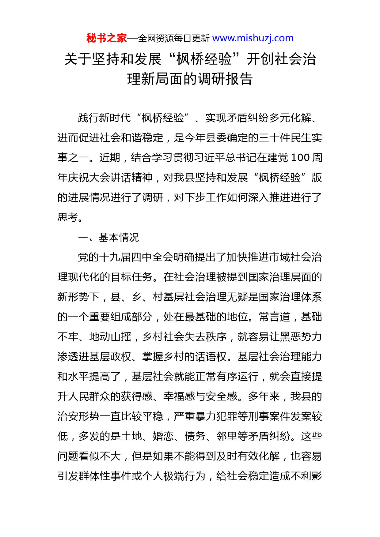 秘书之家—全网资源每日更新www.mishuzj.com关于坚持和发展“枫桥经验”开创社会治理新局面的调研报告践行新时代“枫桥经验”、实现矛盾纠纷多元化解、进而促进社会和谐稳定,是今年县委确定的三十件民生实事之一。近期,结合学习贯彻习近平总书记在建党100周年庆祝大会讲话精神,对我县坚持和发展“枫桥经验”版的进展情况进行了调研,对下步工作如何深入推进进行了思考。一、基本情况党的十九届四中全会明确提出了加快推进市域社会治理现代化的目标任务。在社会治理被提到国家治理层面的新形势下,县、乡、村基层社会治理无疑是国家治理体系的一个重要组成部分,处在最基础的地位。常言道,基础不牢、地动山摇,乡村社会失去秩序,就容易让黑恶势力渗透进基层政权、掌握乡村的话语权。基层社会治理能力和水平提高了,基层社会就能正常有序运行,就会直接提升人民群众的获得感、幸福感与安全感。多年来,我县的治安形势一直比较平稳,严重暴力犯罪等刑事案件发案较低,多发的是土地、婚恋、债务、邻里等矛盾纠纷。这些问题看似不大,但是如果不能得到及时有效化解,也容易引发群体性事件或个人极端行为,给社会稳定造成不利影秘书之家—全网资源每日更新www.mishuzj.com响。因此,坚持发展新时代“枫桥经验”、实现矛盾纠纷多元化解,是一项实实在在的民生工程。几年来,我们一直坚持问题导向,加强源头治理,在建立健全矛盾纠纷多元化解体制机制上进行了一些探索,目的就是要提升基层社会治理能力,有效维护农村社会稳定,为脱贫攻坚、乡村振兴奠定一个好的基础。在实际工作中,我们始终着力打造过硬调解队伍,构建多措并举、多元合一、多方合力的矛盾纠纷化解格局,充分发挥人民调解第一道防线作用,以“了民情、解民怨、多宣法、慎用警”的理念,努力实现了“三个下降”、“三个防止”、“三个提高”目标,即:民转刑案件数量下降、民事诉讼案件下降、涉法涉诉信访和越级访数量下降;人民调解成功率提高、民事诉讼调解率提高、行政诉讼案件调解率提高;防止恶性事件发生、防止重大民转刑案件发生、防止到县以上越级访案件发生;不断提升人民群众的幸福感、安全感和满意度。我县在这方面的探索,受到省、市政法委的认可和肯定,在全省市域社会治理现代化工作现场会议上做了经验介绍。二、主要做法一是高位推动,把准矛盾纠纷多元化解工作方向。我县成立了县委书记、县长任组长的领导小组,制定出台《坚持发展“枫桥经验”实现矛盾不上交工作实施方秘书之家—全网资源每日更新www.mishuzj.com案》,将矛盾纠纷化解工作纳入县委确定的30件实事,纳入乡镇、县直部门领导班子和领导干部政绩考核指标,坚持做到守土有责、守土尽责。在充分调研和科学论证的基础上,确定以了“三下降”“三提高”“三防止”目标,使工作有章可循、有的放矢。建立健全了乡镇和部门协调联动工作机制,确保形成工作合力。坚持试点先行,组织开展“平安建设走比看”活动,有力推动了矛盾纠纷化解走深走实。二是构建网络,筑牢矛盾纠纷多元化解工作平台。几年来,我县本着下好先手棋、打好主动仗的战略思维,全面拓展延伸矛盾纠纷多元化解网络。建成行业调解中心,形成多个行业调解组织集中联动的行业调解新模式,及时化解行业性、专业性、综合性矛盾纠纷;建成社区“法律诊所”,充分发挥法学会作用,聘请政法机关退休干部,免费为群众提供法律咨询、纠纷调解、法治教育等,累计解答涉法问题近XX件次,调解纠纷XX余件;建成XX处家庭警务室,就近受理解决矛盾纠纷,实现矛盾纠纷第一时间发现,第一时间受理,第一时间化解。三是完善制度,健全矛盾纠纷多元化解工作机制。矛盾纠纷多元化解质量高低、成效好坏,离不开相关机制制度的保障,实践中,我们坚持完善各项制度,确保“战略”科学、“战术”有力。探索管理机制“清单化”。调秘书之家—全网资源每日更新www.mishuzj.com解员每月排查一次辖区,村警每年遍访一次农户,乡镇干部每月对重点户走访一次,建立排查问题台账,化解一个销号一个,及时跟踪回访,确保将矛盾纠纷化解在萌芽;探索案件办理“流程化”。科学规范案件办理流程,利用转办、交办等方式,实现案件分层分级调解,确保每一件矛盾纠纷都有人管、有人办、有接待、有回音;探索考核奖惩“规范化”。制定年度目标考核实施办法,实现考核结果与工资绩效挂钩,有力激发了基层做好调解工作的积极性、主动性。四是充实力量,打造矛盾纠纷多元化解过硬队伍。坚持优势互补、提档升级,努力打造一支素质高、能力强的调解队伍。全面落实“一村一警”。通过政府购买服务,择优招录XX名村警,实现行政村全覆盖。充分发挥村警社会治安员、矛盾纠纷调解员等“七大员”作用(维护社会稳定的治安员、矛盾纠纷的调解员、环境保护督察员、扫黑除恶的信息员、解决执行难的情报员、易肇事肇祸精神病人的监护员、反邪教的特情员),基本实现矛盾不上交、调解不出村、平安不出事。县委将村警列为本土“一懂两爱”人才,纳入村级后备干部管理,培养村级干部接班人。目前,村警队伍中已有XX人加入党组织,XX人进入村两委;优化整合工作力量。将扶贫优秀干部、综治干事、信访专干充实到乡镇综治中