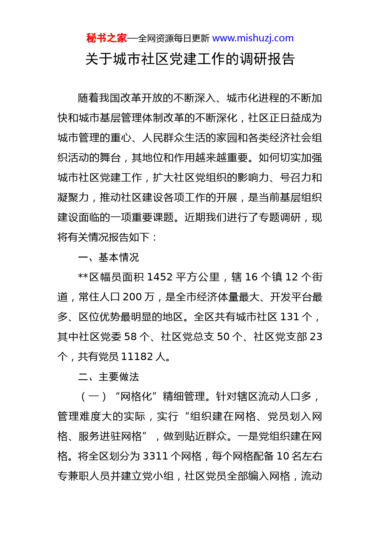 秘书之家—全网资源每日更新www.mishuzj.com关于城市社区党建工作的调研报告随着我国改革开放的不断深入、城市化进程的不断加快和城市基层管理体制改革的不断深化,社区正日益成为城市管理的重心、人民群众生活的家园和各类经济社会组织活动的舞台,其地位和作用越来越重要。如何切实加强城市社区党建工作,扩大社区党组织的影响力、号召力和凝聚力,推动社区建设各项工作的开展,是当前基层组织建设面临的一项重要课题。近期我们进行了专题调研,现将有关情况报告如下:一、基本情况区幅员面积1452平方公里,辖16个镇12个街道,常住人口200万,是全市经济体量最大、开发平台最多、区位优势最明显的地区。全区共有城市社区131个,其中社区党委58个、社区党总支50个、社区党支部23个,共有党员11182人。二、主要做法(一)“网格化”精细管理。针对辖区流动人口多,管理难度大的实际,实行“组织建在网格、党员划入网格、服务进驻网格”,做到贴近群众。一是党组织建在网格。将全区划分为3311个网格,每个网格配备10名左右专兼职人员并建立党小组,社区党员全部编入网格,流动秘书之家—全网资源每日更新www.mishuzj.com党员主动亮明身份,在网格认领岗位、开展服务、接受监督,构建“小区网格党小组主导、党员示范带动、居民主动参与”的小区党建工作体系,实现联系基层无死角、联系群众全覆盖。二是维护稳定在网格。在全区推广“走一走、看一看、听一听、闻一闻、问一问、记一记”的“六个一”工作法,做到19类民情“必到必访”,每年居民入户率100%,困难群体回访率100%,做到小事不出网格,矛盾不出社区,群众安全感指数第三方测评保持97%以上。(二)“网络化”便捷服务。积极运用“互联网+”思维,大力推进智慧城市社区建设,架设起党组织联系服务群众的“高速路”。一是运用群工系统方便群众。自2013年起,在全市率先试点推广应用服务群众工作信息系统,对社区群众反映的问题做到落实解决“上不过午,下不过夜”,经过4年多全面推广应用,3万多件棘手问题得到及时解决,办结率100%,群众满意率超过99%。二是运用大数据分析帮助群众。着眼于社区党建信息化,研发建立社区信息化管理系统,全面收录全区人、地、事、物、组织等5个方面500多类要素信息,实行实时录入、动态更新,通过“大数据”分析群众诉求,“对症下药”解决好群众关心关注的事项。三是运用电子保姆关爱群众。针对空巢老人的日常护理和紧急求助等难题,部分街道党工秘书之家—全网资源每日更新www.mishuzj.com委试点实施“电子保姆”项目,通过政府购买服务方式,免费为9000多名空巢老人提供穿戴式电子设备,实施电子地图24小时实时跟踪显示、专人管理和及时回应呼叫,先后帮助找回走失老人137人(次),紧急救助老人69人(次)。(三)“社会化”多元参与。针对社区人手少、群众需求多的实际,整合工、青、妇和社会组织力量,共同推动社区党建工作。一是设立群团服务站。作为群团改革试点单位,在全区设立群团服务站,组建党员先锋队,开展“科普学校”“义务维修”“纠纷调解”等志愿活动500多次,有力提升了群团组织服务群众和参与社会治理的能力。二是推广“爱心银行”。建立并推广“爱心储蓄银行”,通过积分换服务、积分换商品,引导近万名党员和居民志愿者不存现金存爱心,免费提供家政、培训、咨询等爱心服务,在互帮互助中传递正能量。比如湖街道,2016年有45名党员因积分卡上积分高上了党员明星榜,有102人次困难党员参加志愿服务活动积分,换得了大米、油盐等生活用品。三是引入专业社工。以购买社会服务的方式在回兴街道试点开展专业社工进社区,采取“个案+小组+社区”的社会工作专业方法解决群众个性化需求,共建立121个社工服务个案,组建社工小组69个,开展大型党员服务活动164场次,做到了“个案社工秘书之家—全网资源每日更新www.mishuzj.com服务项目月月新,常态社区志愿活动周周有”。三、存在问题近年来,积极推进城市社区党建工作,取得一定成效,但也存在不足。(一)社区党员参与党组织活动积极不高。全区城市社区管理的党员主要由离退休人员、农转城人员、退转军人、待业大学生等构成,存在年龄偏大、文化层次不一、从业复杂、流动党员较多的特点,党组织开展的工作活动往往参与的都是一些年老党员,年轻党员参加活动的较少。甚至有的年轻党员党费都托人代交,学习通过网络自学,一年都与党组织见不了一次面。外来流动党员,不主动与社区党组织联系,不参加社区党组织活动。(二)党务人才队伍建设有待加强。一方面,支部书记兼职多。目前,社区党组织下属支部书记普遍仅有50-200元/月的工作津贴,待遇偏低、不专职,多数社区下属党支部书记由社区专职工作者兼任。另一方面,党务工作者能力素质有待提高。有的街道社区党务工作者缺乏必要的历练,从事基础性党务工作能力不强,在工作中还停留在老思想、老办法上,对在城市快速发展的新形势下加强党员教育管理存在畏难情绪,出现“老办法不管用、新办法不会用”。(三)共驻共建不畅。由于驻辖区单位隶属关系不秘书之家—全网资源每日更新www.mishuzj.com同、层级高低不一、领域类型不同,各单位间沟通联系渠道不够畅通、共驻共建长效机制不够健全。有的街道同一社