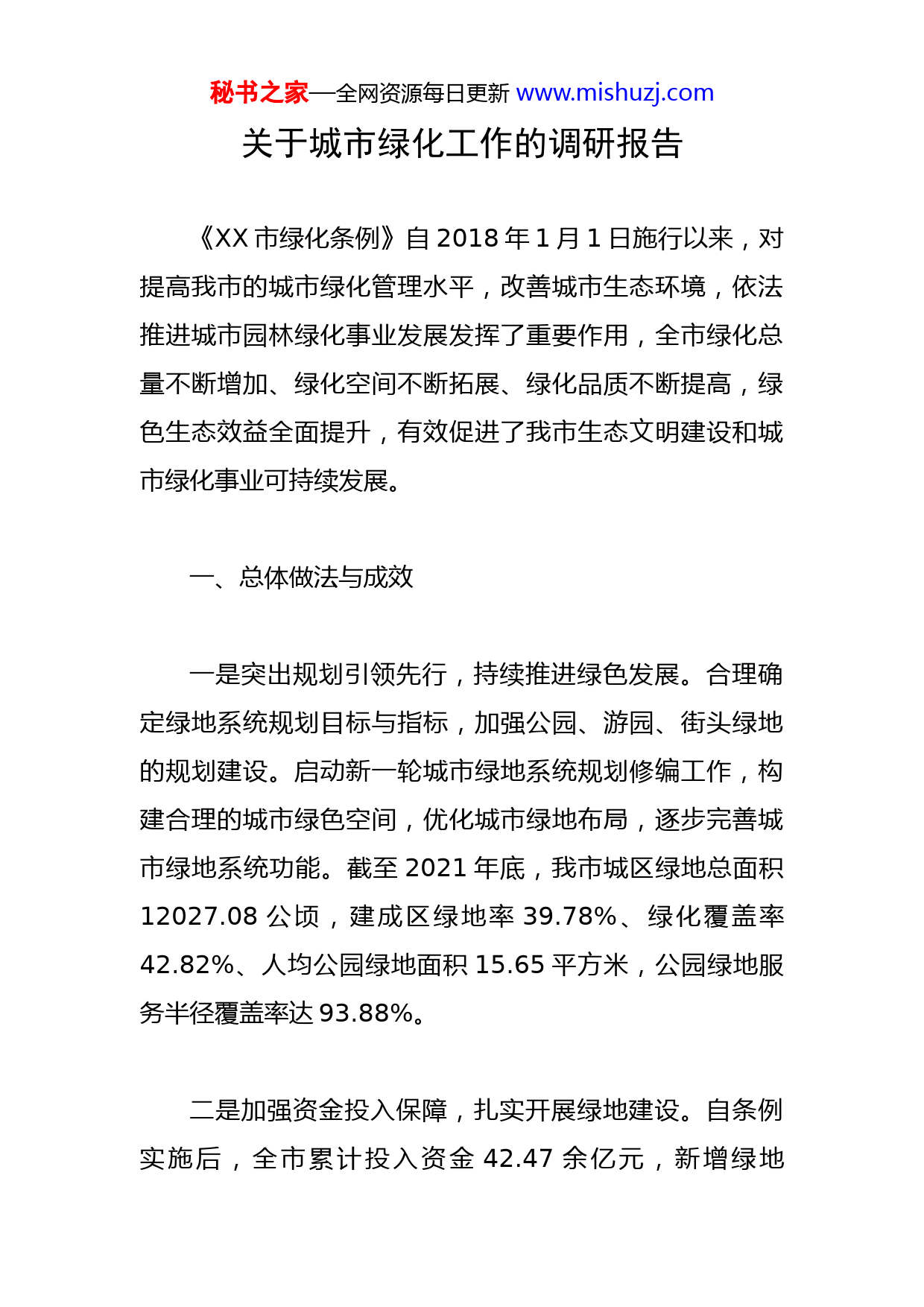 秘书之家—全网资源每日更新www.mishuzj.com关于城市绿化工作的调研报告《XX市绿化条例》自2018年1月1日施行以来,对提高我市的城市绿化管理水平,改善城市生态环境,依法推进城市园林绿化事业发展发挥了重要作用,全市绿化总量不断增加、绿化空间不断拓展、绿化品质不断提高,绿色生态效益全面提升,有效促进了我市生态文明建设和城市绿化事业可持续发展。一、总体做法与成效一是突出规划引领先行,持续推进绿色发展。合理确定绿地系统规划目标与指标,加强公园、游园、街头绿地的规划建设。启动新一轮城市绿地系统规划修编工作,构建合理的城市绿色空间,优化城市绿地布局,逐步完善城市绿地系统功能。截至2021年底,我市城区绿地总面积12027.08公顷,建成区绿地率39.78%、绿化覆盖率42.82%、人均公园绿地面积15.65平方米,公园绿地服务半径覆盖率达93.88%。二是加强资金投入保障,扎实开展绿地建设。自条例实施后,全市累计投入资金42.47余亿元,新增绿地秘书之家—全网资源每日更新www.mishuzj.com3268.96公顷,改建绿地219.2公顷,新增公园22个,基本实现居民出行“300米见绿、500米见园”要求。特别是2021年以来,相继实施“精·彩家园”品质绿化“158工程”和省运会“五点一线”园林绿化提升项目,投资约2.91亿元,实施109条道路、53处游园的提升改造,全面提升城市主次干道绿化景观。三是有效开展绿化养护,不断巩固绿化成果。坚持依法护绿,实行网格化管理,逐步形成政府领导、部门配合、属地管辖、分级负责、专业管理与社会管理相结合的体制。建立了层级完善、分块负责、分工合作的园林管理养护体系,对绿地植物实施精修剪、细养护,打造精细化的园林景观,保护古树名木资源。四是依法实施监督管理,严格规范绿化执法。在全省率先开展全域生态空间摸底调查和造册绘图,成果编目报告纳入生态红线电子信息系统。依托“天地双眼”智慧监管平台,逐步构建“定期遥感、年度督察”的监管模式,提高园林绿化日常管理问题的发现率和处理率。严格履行处罚程序,加大绿化执法力度,推动城市绿化管理科学化、规范化、精细化、长效化。秘书之家—全网资源每日更新www.mishuzj.com二、存在问题与不足(一)绿化工作成效有待提升。全市绿地总量仍显不足,绿化主要指标普遍偏低。至2021年,建成区绿化覆盖率未达国家生态园林城市43%的底线标准,市区林荫路覆盖率65.8%,与国家生态园林城市85%的标准有较大差距,全市森林覆盖率仅17.74%,林木覆盖率22.2%,未达国家森林城市25%的标准。(二)绿化规划标准有待提高。绿化特色不够鲜明,绿化景观趋同性高,园林绿地建设功能性、文化性和独特性不够强。园林绿化养护经费投入较低,管养队伍和专业人才力量相对薄弱,养护指导科学含量低,绿地管护水平有待提升。(三)绿化建设力度有待加强。城乡绿化发展不均衡问题仍然存在,城东、城西两翼综合性公园、绿化廊道相对不足。市本级绿化小项目多、大项目少,改造项目多、新建项目少,缺乏集规模、品质、特色于一体的大型绿地项目支撑。推进立体绿化的力度不够大,园林绿化的生态效能和环境效益有待提高。秘书之家—全网资源每日更新www.mishuzj.com(四)绿化管理机制有待完善。执法体制不够顺畅,执法力度不够有力,一些破坏绿化行为不能得到及时有效制止和处理。建设用地侵占、挤占绿地现象仍然存在,特别是城市道路扩建、老旧小区停车位改建造成绿地率缩小比较普遍。《条例》宣传不够深入,全社会共同参与绿化建设的氛围不够浓厚。三、工作对策与建议(一)进一步完善规划编制,切实加强绿化工作的统筹引领。强化规划的前瞻性。突出重大项目支撑,统筹长远设计,推动全市森林覆盖率、道路林荫化率、绿地率、绿化覆盖率等重要指标在较短时间内取得明显改观。强化规划科学性。系统推进城市与乡村、新城与老城、城区与市(区)、城区与郊区的绿地建设,并适当向老城区、老旧小区倾斜,适度推进立体绿化,对具备条件的区域合理增加绿地,做到无绿补绿,有绿保绿,进一步均衡全市绿地资源。强化规划执行性。加大规划执行力度,增强规划刚性约束,严格控制规划确定的绿化用地,建立绿线和临时占用绿地公示制度,强化各类建设工程配套绿化审批和全过程监督,防范配套绿地“缩水”现象。秘书之家—全网资源每日更新www.mishuzj.com(二)进一步强化精细运作,科学推进绿化项目深入实施。提高绿化设计水平。加强城市绿化景观设计研究,积极打造一批体现历史底蕴、文明内涵的绿化景观,展现城市风貌、提升城市品质、彰显城市独特风貌。加强对垂直绿化、立体绿化、屋顶绿化等的研究和推广,充分拓绿增绿。提升绿化管护水平。加强人员、资金、技术、设备等要素投入,提升养护管理规范标准,落实好养护管理技术规程,做好全过程、全环节绿化养护管理,不断提高绿化养护科学化、精细化、智能化水平。提升绿化研究水平。高度重视适应XX土质环境植物品种的研究、引进和培育,把绿化美化环境与经济社会效益相结合,真正让绿化成为改善和美化环境、造福社会与百姓的有益之举。(三)进一步优化资源配置,努力提升绿化管理效能。完善部门协调工作机制,形成强大工作合力。进一步理顺职责关系,建立健全联动机制,落实主体责任,强化目标考核,以高