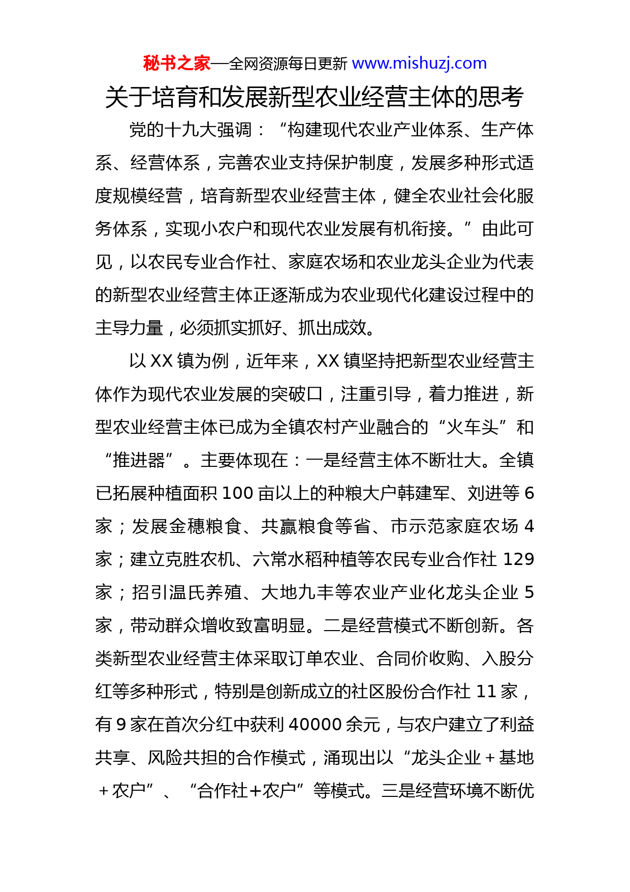 秘书之家—全网资源每日更新www.mishuzj.com关于培育和发展新型农业经营主体的思考党的十九大强调:“构建现代农业产业体系、生产体系、经营体系,完善农业支持保护制度,发展多种形式适度规模经营,培育新型农业经营主体,健全农业社会化服务体系,实现小农户和现代农业发展有机衔接。”由此可见,以农民专业合作社、家庭农场和农业龙头企业为代表的新型农业经营主体正逐渐成为农业现代化建设过程中的主导力量,必须抓实抓好、抓出成效。以XX镇为例,近年来,XX镇坚持把新型农业经营主体作为现代农业发展的突破口,注重引导,着力推进,新型农业经营主体已成为全镇农村产业融合的“火车头”和“推进器”。主要体现在:一是经营主体不断壮大。全镇已拓展种植面积100亩以上的种粮大户韩建军、刘进等6家;发展金穗粮食、共赢粮食等省、市示范家庭农场4家;建立克胜农机、六常水稻种植等农民专业合作社129家;招引温氏养殖、大地九丰等农业产业化龙头企业5家,带动群众增收致富明显。二是经营模式不断创新。各类新型农业经营主体采取订单农业、合同价收购、入股分红等多种形式,特别是创新成立的社区股份合作社11家,有9家在首次分红中获利40000余元,与农户建立了利益共享、风险共担的合作模式,涌现出以“龙头企业+基地+农户”、“合作社+农户”等模式。三是经营环境不断优秘书之家—全网资源每日更新www.mishuzj.com化。从中央到省市县委、政府始终把培育新型农业经营主体作为农村发展、农业增效、农民增收的一项重要任务,在坚持农村基本经营制度不动摇的基础上,构建了组织化、集约化、社会化、专业化的新型农业经营体系。政策引导力度大,有关部门协同合作程度高,形成了较为有力的工作推进机制。但也存在着一定的问题和困难,主要有:一是支撑新型农业经营主体发展的条件仍不够充分。种植的集中度不高、扶持资金少、新型职业农民欠缺。二是打造新型农业经营主体发展的优势仍不够明显。新型农业经营主体之间的关联度不高,龙头企业、合作社、家庭农场、种养大户“单打一”经营,抵御市场风险的能力较弱。三是促进新型农业经营主体发展的机制仍不够完善。在抢抓乡村振兴战略重大机遇之时,如何培育和发展好新型农业经营主体,助推乡村产业振兴。我认为可以从如下几方面发力。一、重抓土地、资金、人才“三大要素”,构建新型农业经营主体的有力支撑体系要充分整合土地、资金、人才等要素资源,多方支持扶持,为新型农业经营主体营造良好的发展成长环境。一是要加快土地流转,规范产权交易。充分利用广播、电视、网络等媒体以及通过悬挂横幅、发入明白纸、召开村民座谈会等方式,进一步宣传土地流转、产权交易的重要秘书之家—全网资源每日更新www.mishuzj.com性和必要性,切实让土地流转带来的益处深入人心。按照依法自愿有偿的原则,有序推进土地流转,规范运作土地产权交易行为,强化土地流转的信息发布、政策咨询、纠纷调处以及合同管理等服务,在高速、铁路、国省道打造千亩的集中连片的土地流转示范基地,形成土地向适度规模集中、土地经营权向种养大户、经营能手、龙头企业转移的良好格局。二是要加大资金扶持,协调金融服务。镇级要设立新型农业经营主体发展专项资金,通过贴息、补助、奖励等形式,支持新型农业经营主体发展;简化新型农业经营主体小额信贷规模的手续,开展多种形式的贷款担保,不断拓宽融资渠道;积极开展农村承包土地的经营权和农民住房财产权抵押贷款,允许将租地承包合同作为抵押物,增强新型农业经营主体贷款能力和规模,缓解融资困难;推动完善农业政策性保险,拓展农业保险的品种和覆盖范围,增强赔付能力、提高保险补助标准,减轻或降低新型农业经营主体的融资成本和风险。三是要加强人才培育,提升职业技能。积极搭建载体,着力营造氛围,吸引投资农业的企业家、返乡创业的农民工和大学生等流向农村、留在农业,成为新型农业经营主体的主要力量。制定新型农民中长期培训计划,广泛开展全方位立体式的农业人才培训,有针对性地培养“土专家”、“田秀才”等农村实用人才。重点加大对种养大户、家庭农场、农业秘书之家—全网资源每日更新www.mishuzj.com龙头企业和合作社领办人、管理者的培训,增强营销、管理能力,建设一批农业职业经理、农业企业家、职业农民等队伍,不断提高现代新型农业经营主体的发展水平。二、主攻农业龙头企业、农民合作社、家庭农场“三大主体”,构建新型农业经营主体的高质量发展体系建立农业龙头企业、农民合作社、家庭农场等典型标杆,树立良好发展导向,引导新型农业经营主体不断提高发展水平。一是要做大农业龙头企业。进一步加大农业招商引资力度,引进种植、养殖以及融合生态、休闲观光等农业龙头企业,延伸新建扩建一批农产品深加工项目,形成链条式农业产业集聚区。围绕以温氏养殖、大地九丰等农业龙头企业为纽带,推进涉农科研机构、高等院校和高新技术企业与农业龙头企业对接合作,共建试验示范、技术推广基地。通过政策倾斜、技术升级、品牌创建、管理创新等措施的有效落实,扶持壮大一批新技术、新产品、新工艺的“高新”农业龙头企业,培育发展一批产业关联度大、