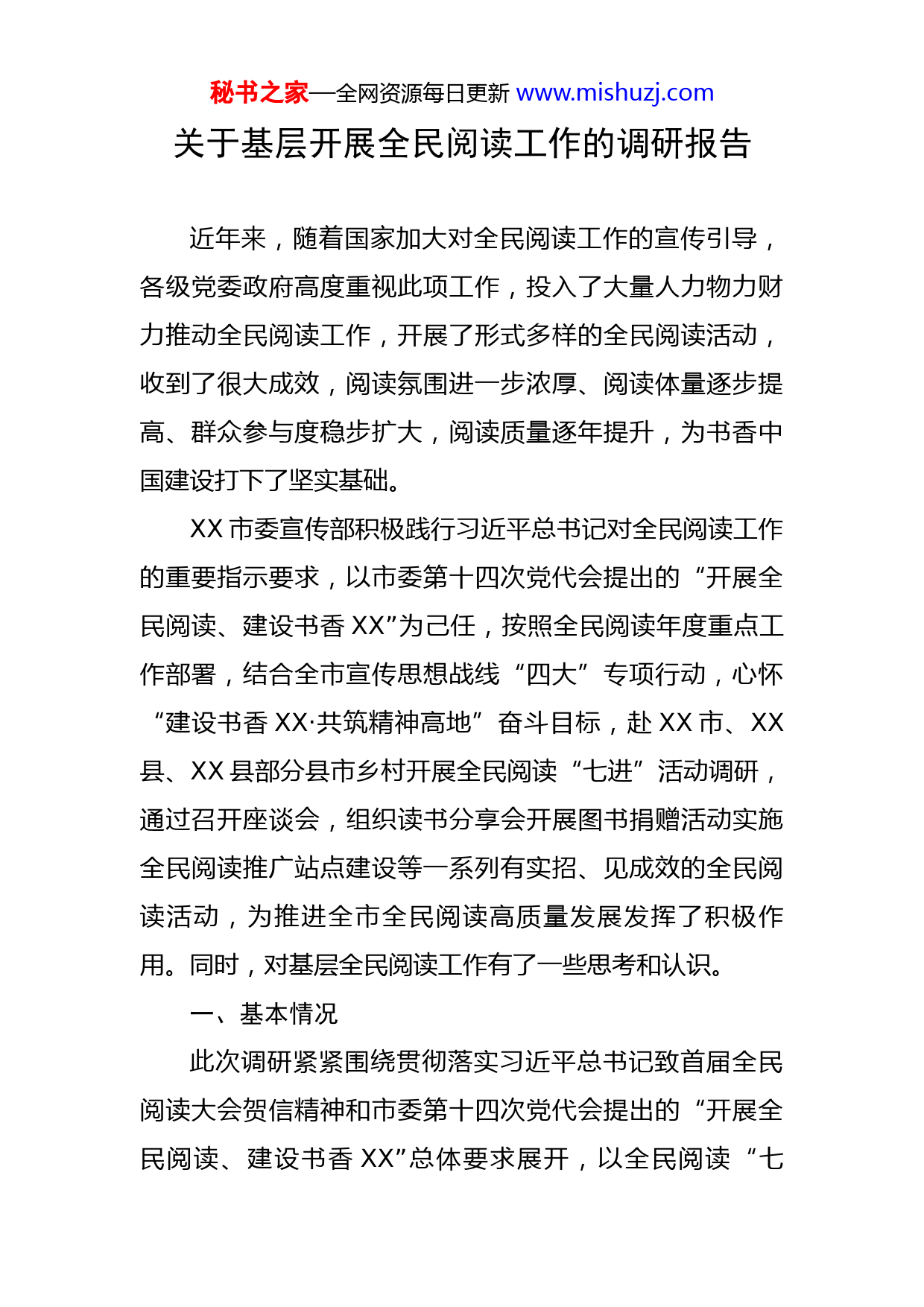 秘书之家—全网资源每日更新www.mishuzj.com关于基层开展全民阅读工作的调研报告近年来,随着国家加大对全民阅读工作的宣传引导,各级党委政府高度重视此项工作,投入了大量人力物力财力推动全民阅读工作,开展了形式多样的全民阅读活动,收到了很大成效,阅读氛围进一步浓厚、阅读体量逐步提高、群众参与度稳步扩大,阅读质量逐年提升,为书香中国建设打下了坚实基础。XX市委宣传部积极践行习近平总书记对全民阅读工作的重要指示要求,以市委第十四次党代会提出的“开展全民阅读、建设书香XX”为己任,按照全民阅读年度重点工作部署,结合全市宣传思想战线“四大”专项行动,心怀“建设书香XX·共筑精神高地”奋斗目标,赴XX市、XX县、XX县部分县市乡村开展全民阅读“七进”活动调研,通过召开座谈会,组织读书分享会开展图书捐赠活动实施全民阅读推广站点建设等一系列有实招、见成效的全民阅读活动,为推进全市全民阅读高质量发展发挥了积极作用。同时,对基层全民阅读工作有了一些思考和认识。一、基本情况此次调研紧紧围绕贯彻落实习近平总书记致首届全民阅读大会贺信精神和市委第十四次党代会提出的“开展全民阅读、建设书香XX”总体要求展开,以全民阅读“七秘书之家—全网资源每日更新www.mishuzj.com进”为抓手,重点调研全市基层开展全民阅读工作的基础条件、人员结构、活动规模、质量效果。在全市两市六县中,XX市和XX市作为全市人口最多,阅读资源禀赋最富集的城市,阅读活动场次多、形式多样、质量和效果相对突出,其他各县因地域覆盖范围广、人员分布相对分散、文化知识结构性矛盾和观念转变迟缓等因素,全民阅读整体质量不高。同时,由于优质读物的供给不够精准,阅读资源、基础设施建设、人才队伍建设参差不齐等因素,各市县阅读活动存在形式单一、群众参与度不高、资源利用率不高等情况。二、主要问题(一)体制机制不够健全。参照市全民阅读工作机构设置和人员配置要求,各市县在全民阅读工作操作层面还有一定距离。宣传部门人员较少,缺乏专职人员主导全民阅读工作,基本由办公室或宣传科人员兼职,力量比较薄弱,县乡村宣传部门人员更少。(二)阅读资源配置不均。在市县层面,阅读场馆设置主要集中在图书馆,有少量直属机关单位配置有图书阅览室,但馆藏图书不够。县乡村各级阅读站点通过新时代文明实践中心(所、站)和公共文化服务标准配有图书室,但基础设施如书架、阅读桌椅等相对较少,藏书量更少。偏重于硬件供给的覆盖面,软件的承载力不强,如图秘书之家—全网资源每日更新www.mishuzj.com书管理不够规范,服务单一僵化,阅读效能发挥还不够充分。(三)阅读活动质量不高。在人口相对集中的市县,由于全民阅读缺乏专项资金扶持,阅读资源供量不足,人均读物占有份额不能满足读者需求,阅读活动缺乏应有的养料。在人口分散区域,尤其是村一级,图书资源相对富集,但因空间距离限制、阅读人群文字水平有限和阅读资源利用率不高等因素,导致全民阅读活动质量大大降低。(四)创新示范引领不足。各市县在阅读模式创建方面缺乏新意,多层次、多渠道、多样化的阅读活动相对缺乏,对人民群众的吸引力不强,活动没有形成规模效益,领读人资源更是匮乏,对开展全民阅读活动缺乏全局观念和先进的组织理念,阅读活动引导服务水平有限,手段方法比较单一,工作成效不明显,纵向的制度安排和横向的分工协作之间缺乏应有的黏性。三、改进措施(一)健全机制,培育崇尚阅读的良好氛围。要确保事有人管、活动有人组织,必须将健全的全民阅读工作机制建立起来,将清晰的制度设计路径与多元目标下的精准供给无缝衔接起来。各市县工作力量薄弱,可参考市全民阅读推广中心和推广人有效做法,积极调动相关部门和社会力量共同推进全民阅读工作。必要时将推进全民阅读工秘书之家—全网资源每日更新www.mishuzj.com作与工作业绩考评结合起来,扎实落实中央及市委市政府对全民阅读工作要求,纳入年度重点工作优先考虑,形成全社会爱读书、读好书、善读书的良好氛围。(二)加强谋划,合理配置阅读资源。在城市人口相对集中的地方,阅读人流量相对较大,图书资源配置不仅数量要跟上,类别也要齐全,在牧区人口相对分散地带,阅读资源配置要讲求科学性、针对性和可操作性,充分利用基层综合性文化服务中心和新时代文明实践中心(所、站),在乡村重要节日和集会时集中进行阅读习惯的培养和引导。鉴于牧区阅读人口流动迁徙会间接造成阅读资源浪费,阅读使用率低,要摸清底数,按照常居人口和流动人口的规模比例,根据当地特点和群众需求对症下药、精准进行资源供给,切实提升基层阅读智慧化管理水平。(三)招贤纳才,培养全民阅读领读人。火车跑的快,全凭车头带。城乡差异不仅体现在人口数量上,知识结构的差异也导致全民阅读质量存在剪刀差。在动态变迁的阅读矛盾中转变由一维到多维的服务模式,就必须注重阅读领读人的培养,要加大培训力度,积极探索在新形势下如何让阅读变得更简单、更有趣味性和包容性,要让领读人在价值多元的社会中唤醒人们读书逐梦的心灵,在与文学IP的碰撞中焕发出全新的生命力。要力促全民阅读在基层生根发芽、开花结果,起到引领思想、开拓视野、点秘书