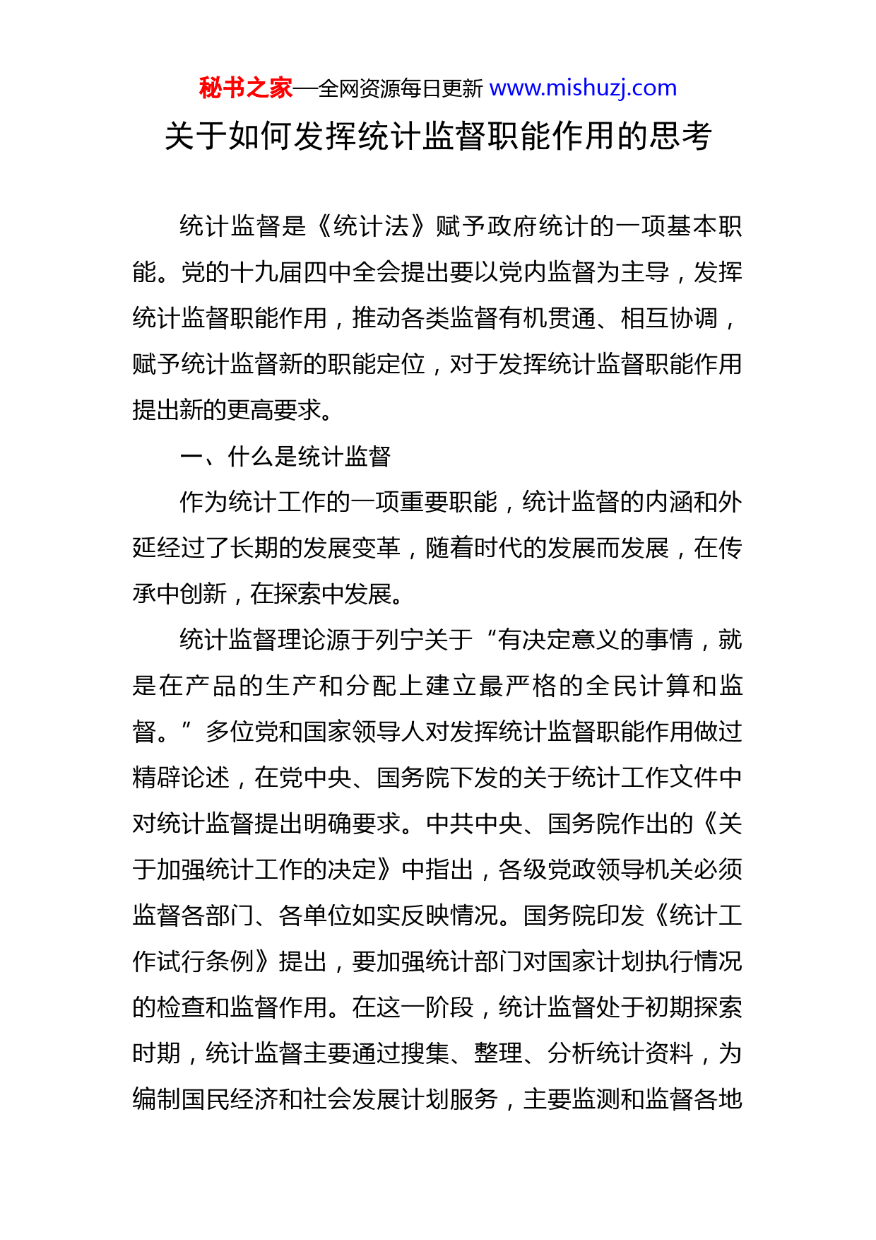 秘书之家—全网资源每日更新www.mishuzj.com关于如何发挥统计监督职能作用的思考统计监督是《统计法》赋予政府统计的一项基本职能。党的十九届四中全会提出要以党内监督为主导,发挥统计监督职能作用,推动各类监督有机贯通、相互协调,赋予统计监督新的职能定位,对于发挥统计监督职能作用提出新的更高要求。一、什么是统计监督作为统计工作的一项重要职能,统计监督的内涵和外延经过了长期的发展变革,随着时代的发展而发展,在传承中创新,在探索中发展。统计监督理论源于列宁关于“有决定意义的事情,就是在产品的生产和分配上建立最严格的全民计算和监督。”多位党和国家领导人对发挥统计监督职能作用做过精辟论述,在党中央、国务院下发的关于统计工作文件中对统计监督提出明确要求。中共中央、国务院作出的《关于加强统计工作的决定》中指出,各级党政领导机关必须监督各部门、各单位如实反映情况。国务院印发《统计工作试行条例》提出,要加强统计部门对国家计划执行情况的检查和监督作用。在这一阶段,统计监督处于初期探索时期,统计监督主要通过搜集、整理、分析统计资料,为编制国民经济和社会发展计划服务,主要监测和监督各地秘书之家—全网资源每日更新www.mishuzj.com区各部门计划目标任务的执行完成情况、国有企业国有经济生产分配情况。改革开放以来,随着全国统计工作的恢复和发展,统计监督得到重视和加强。《人民日报》发表的“充分发挥统计监督作用”社论,同年下发的《国务院关于加强统计工作充实统计机构的决定》以及国务院批转国家统计局的《关于加强和改革统计工作报告》,都要求加强统计分析和统计监督。通过的《中华人民共和国统计法》,第一次将统计监督明确为统计部门的法定职责。国务院批转国家统计局《关于加强统计工作充分发挥统计监督作用的报告》并提出“统计监督在国家宏观调控和监督体系中,具有十分重要的地位和作用”。在这一阶段,统计监督处于探索发展时期,统计监督的主要对象、范围领域、方法手段有了进一步拓展延伸,建立了反映国民经济增长速度、规模、结构,包括工业、农业、投资等领域的统计指标体系,通过数据分析揭示国民经济和社会发展情况,特别是围绕经济运行中的x头性趋势性倾向性问题,在统计分析的基础上提出针对性意见建议,为党中央准确研判经济形势、加强宏观决策管理提供统计支撑服务。党的十八大以来,统计监督的领域不断拓展,体制机制不断深化,方式方法不断创新。以习近平同志为核心的党中央研究出台《关于深化统计管理体制改革提高统计数秘书之家—全网资源每日更新www.mishuzj.com据真实性的意见》《统计违纪违法责任人处分处理建议办法》《防范和惩治统计造假、弄虚作假督察工作规定》,提出“三大核算改革”,赋予统计部门开展统计督察、实施地区生产总值统一核算等新的职能。党的十九大提出完善统计体制,党的十九届四中全会提出发挥统计监督职能作用,将统计监督和纪检监察监督、巡视监督、派驻监督、审计监督等作为党和国家监督体系的重要组成部分,统计监督成为在党内监督主导下的重要监督方式,统计监督质效持续提升,统计的综合性基础性作用正在得到有效发挥。二、统计监督的特点在党和国家监督体系中,统计监督有其他监督不可替代的优势。一是独立性。县级以上地方人民政府依法设立独立的统计机构;统计机构和统计人员依法独立行使统计调查、统计报告、统计监督的职权。因此,统计监督可以保持相对独立超脱,不易受利益主体的干扰。二是数量性。根据一整套科学统一的国民经济核算体系和统计指标体系,对纷繁复杂的政治建设、经济建设、社会建设、文化建设和生态文明建设进程进行量化监测、评价,从数量关系揭示宏观发展规律,预警矛盾问题。三是全面性。随着经济社会深刻变革,统计调查范围大大拓展,基本覆盖国民经济和社会发展各个领域、各个方面,不仅可以反映秘书之家—全网资源每日更新www.mishuzj.com全国总体情况,还可以反映地区和行业特点;不仅可以反映速度、规模、总量,还可以反映结构、质量、效益。三、统计监督的主要任务(一)开展统计督察。紧紧围绕中央《防范和惩治统计造假、弄虚作假督察工作规定》确定的督察内容,聚焦贯彻落实党中央、国务院关于统计工作决策部署,遵守执行统计法律法规,防范和惩治统计造假、弄虚作假工作,国家统计规则政令执行等情况开展督察,指出被督察地区和部门统计工作中存在的问题,及时反馈统计督察意见,推动整改落实。(二)开展统计执法检查。受理统计违纪违法举报线索,严肃查处重大统计违纪违法案件,督促各级统计机构依法查处本行政区域内发生的统计违法行为,推动对有关责任单位和责任人严肃追责问责。对统计严重失信企业进行联合惩戒并公示有关失信信息,通报曝光重大统计违纪违法案件,发挥典型案件警示教育作用。(三)依法独立履行监测评价职能。紧紧围绕“十四五”战略规划和国家重大战略部署贯彻落实情况,不断建立并优化体现中央要求、具有时代特征、符合发展定位的统计监测评价体系。充分利用国家、部门、地方统计调查和重大国情国力调查取得的数据以及相关部门的行政记录,对各地区